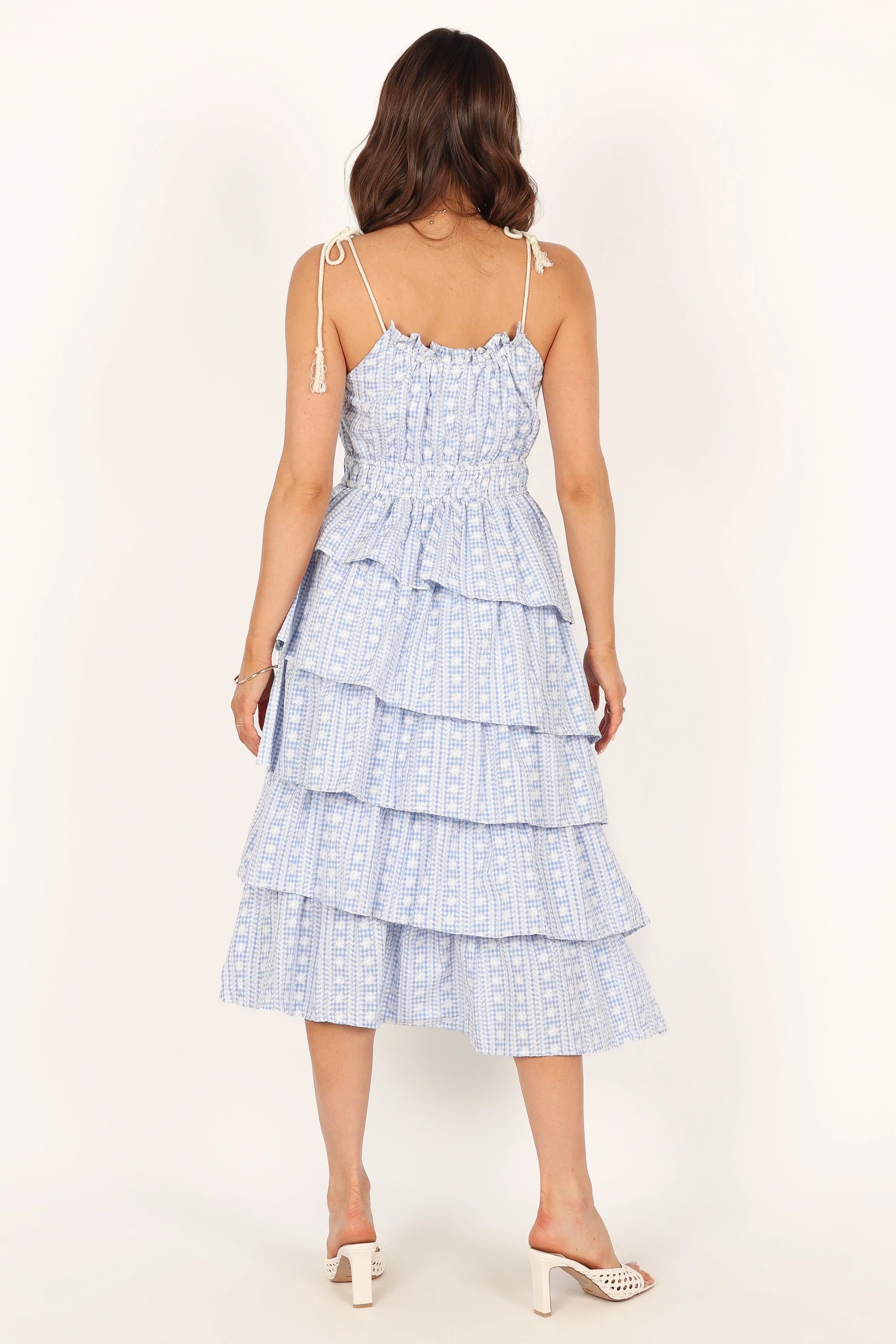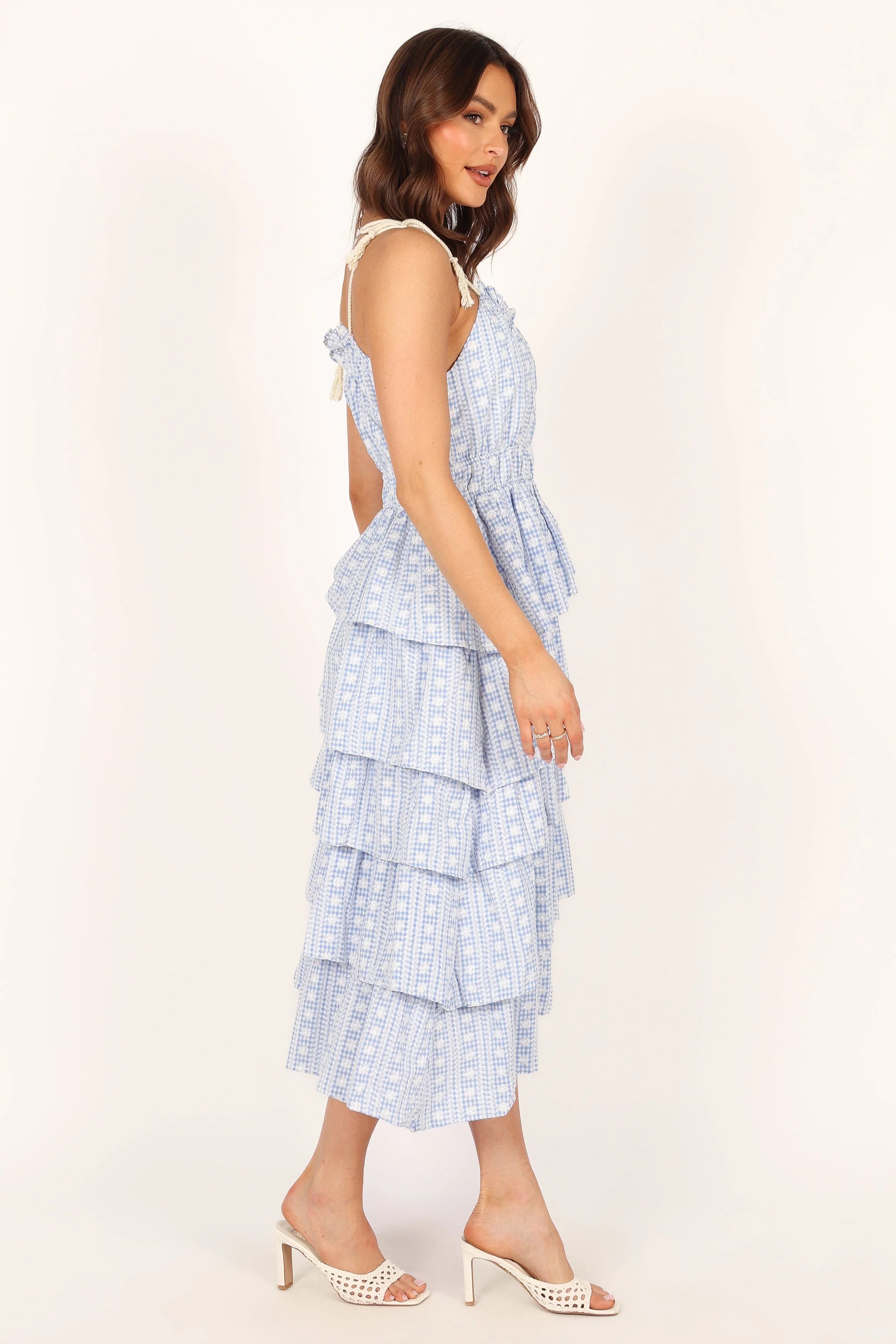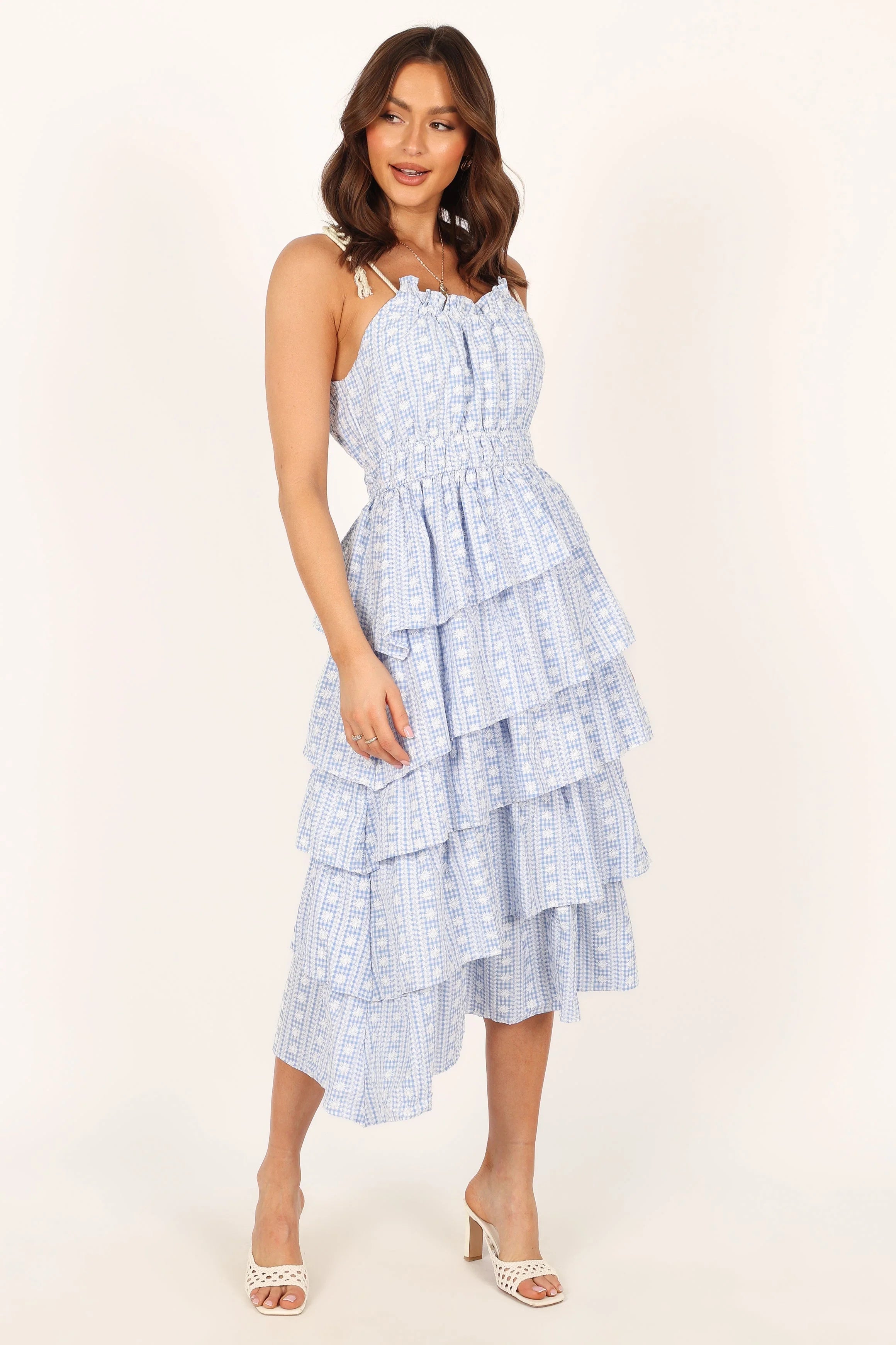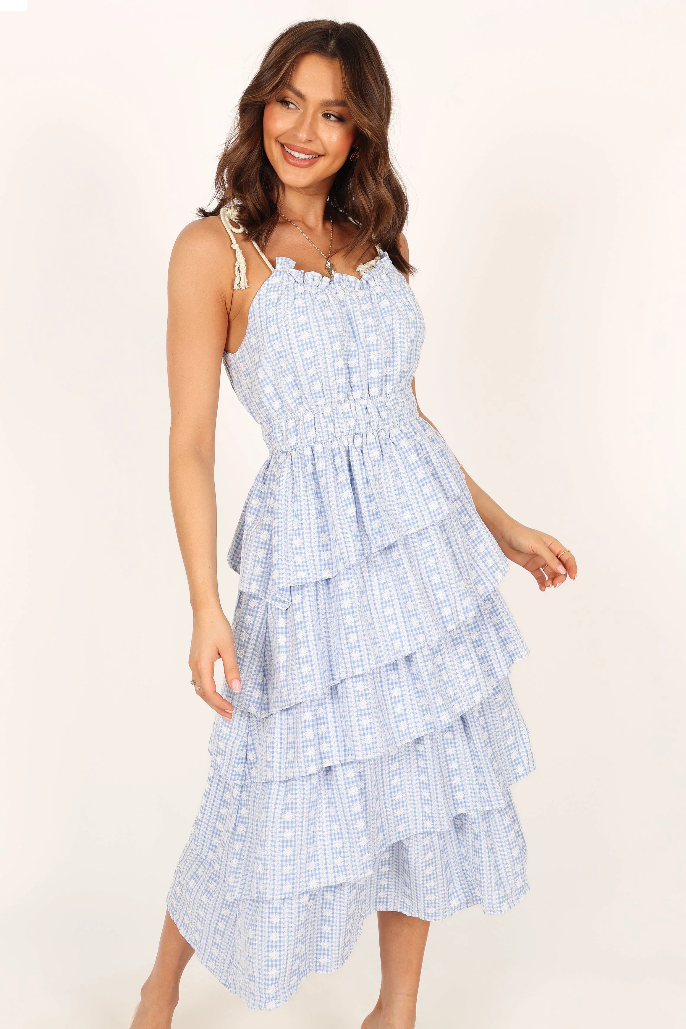 DETAILS The perfect day-to-night dress, the Midi Length Gingham Floral Print Dress is here to make sure you look your best in any situation. It features an elasticised neckline with rope tie close straps and an elasticised waist for added comfort.
