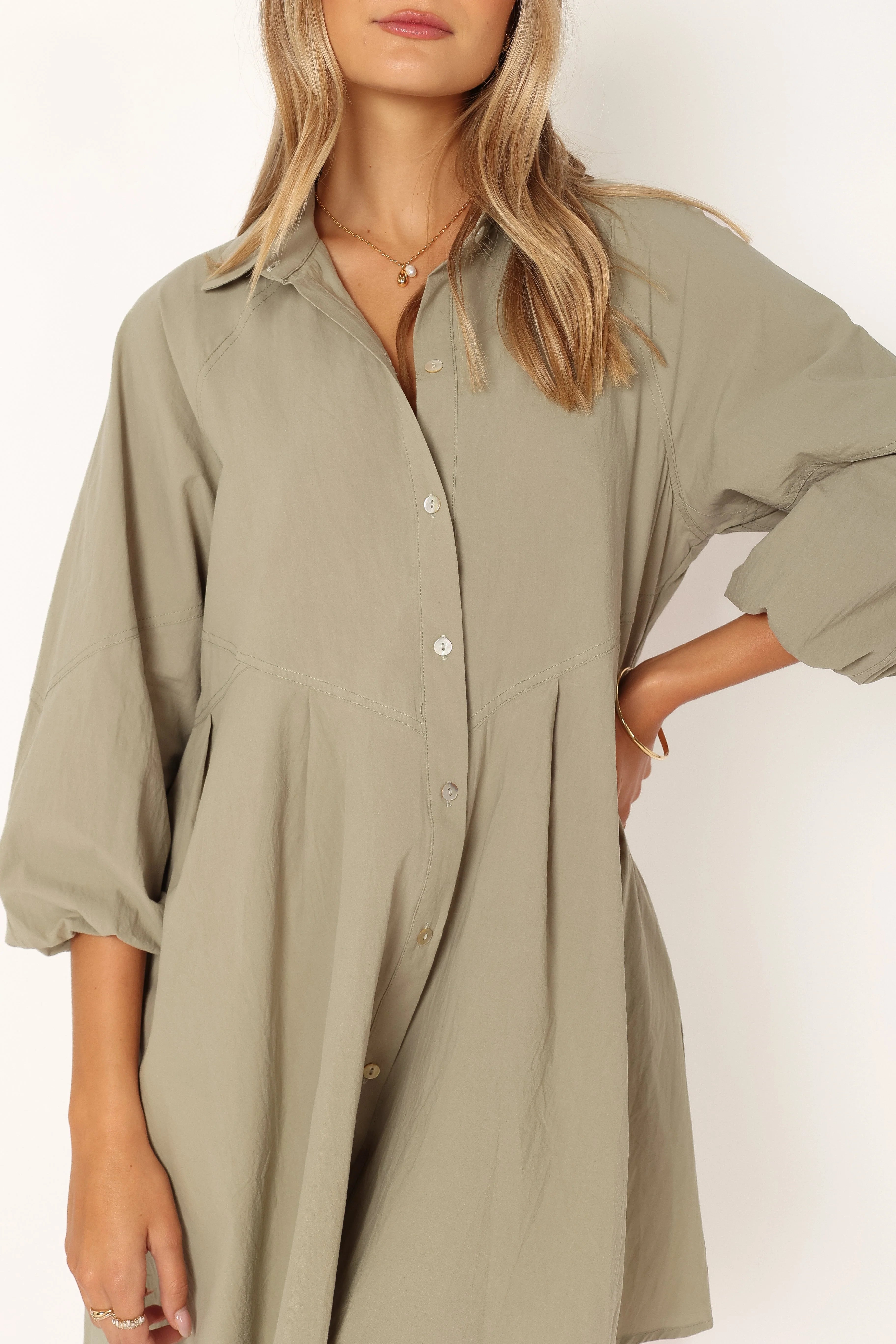 | DETAILS Say hello to the perfect mini dress for your wardrobe! This v neckline piece features a collared neck and long sleeves with an elasticised cuff. The functional button down front and pockets make it versatile and easy to style.