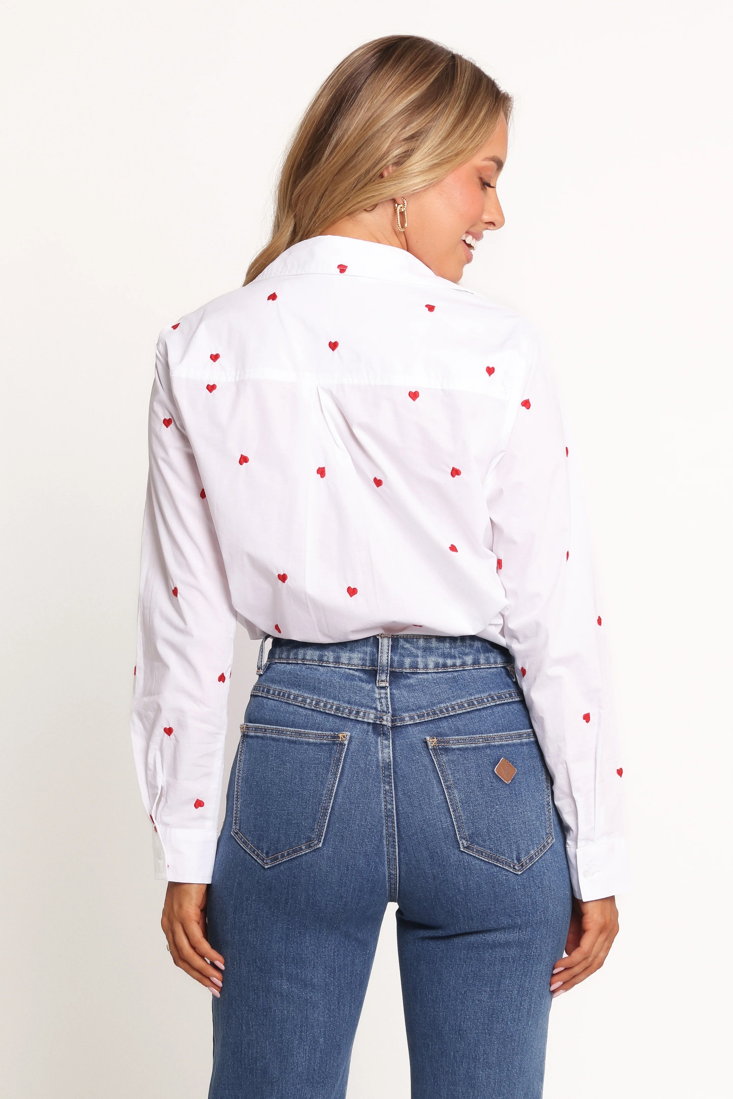 DETAILS This long-sleeve button-down is adorned with delicate mini heart details that effortlessly add charm and originality to your outfit. Whether paired with jeans for a laid-back vibe or tucked into a skirt for a polished look, this versatile piece adapts to any occasion.