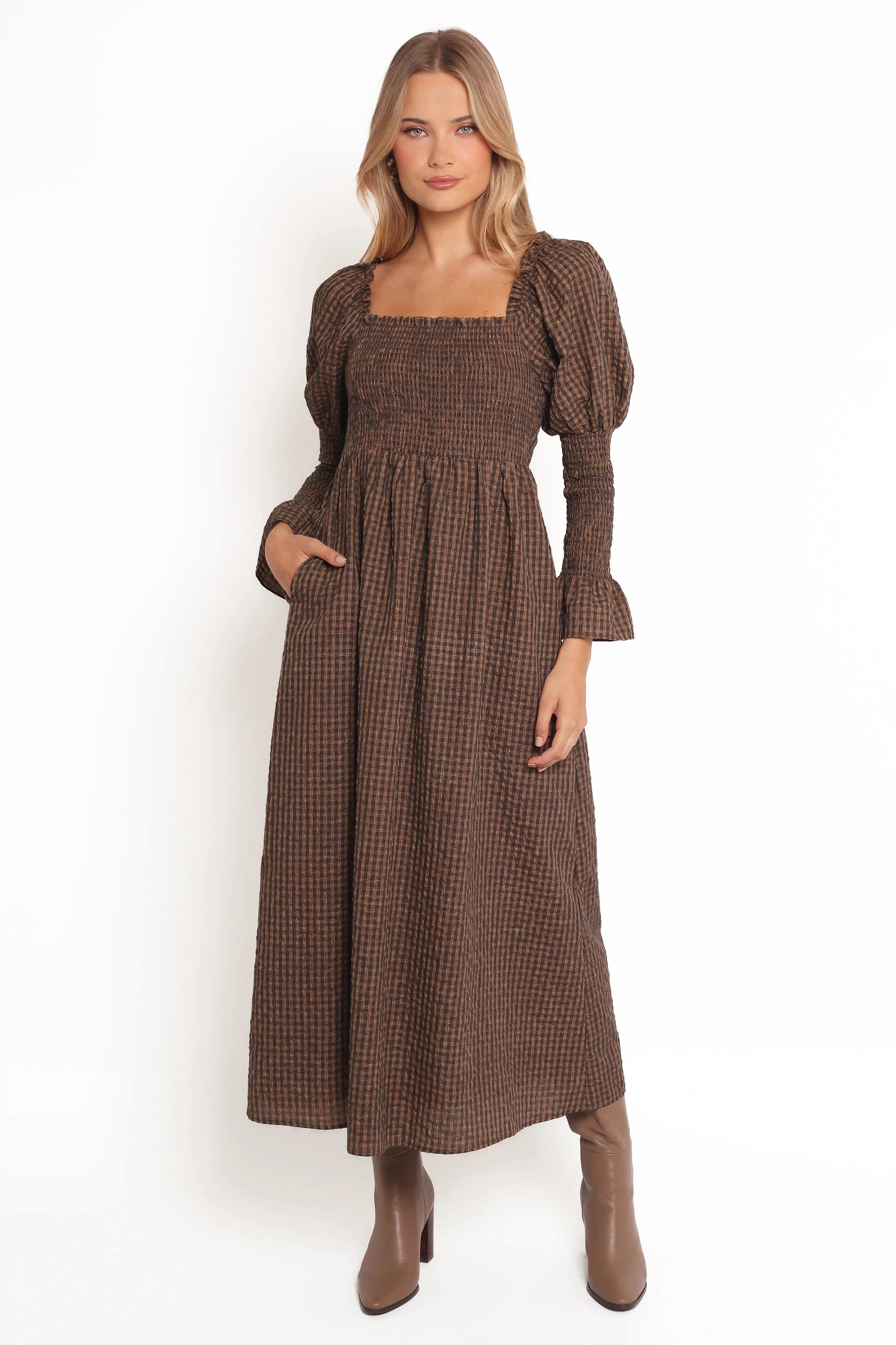 | DETAILS Unleash your inner fashionista with the Cyrena Maxi Dress in Brown Check. This standout piece effortlessly blends comfort and style, making it your go-to for any occasion. Its maxi length creates a flowing silhouette, while the elasticised square neckline and long sleeves with delicate shirred detail add an elegant touch.