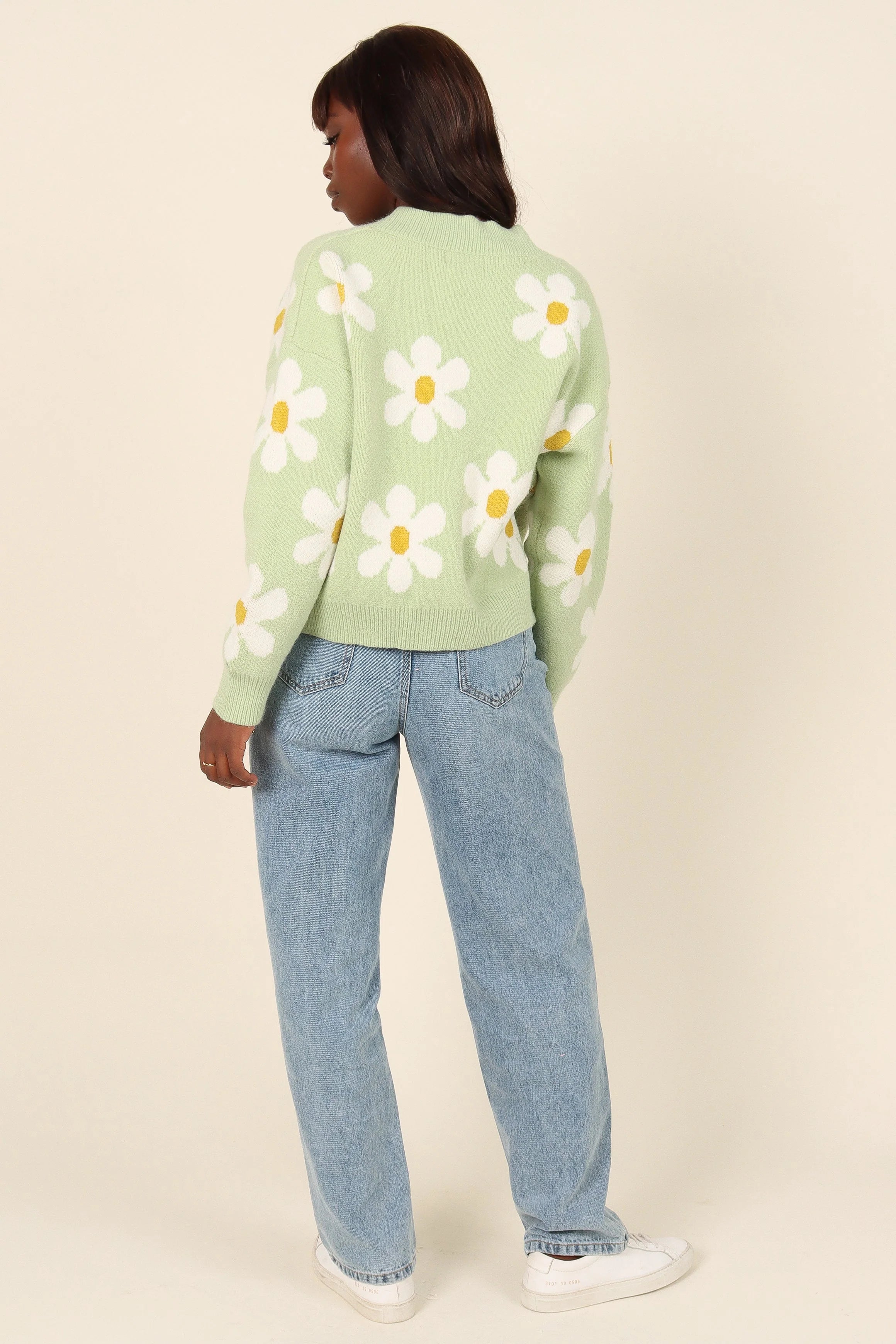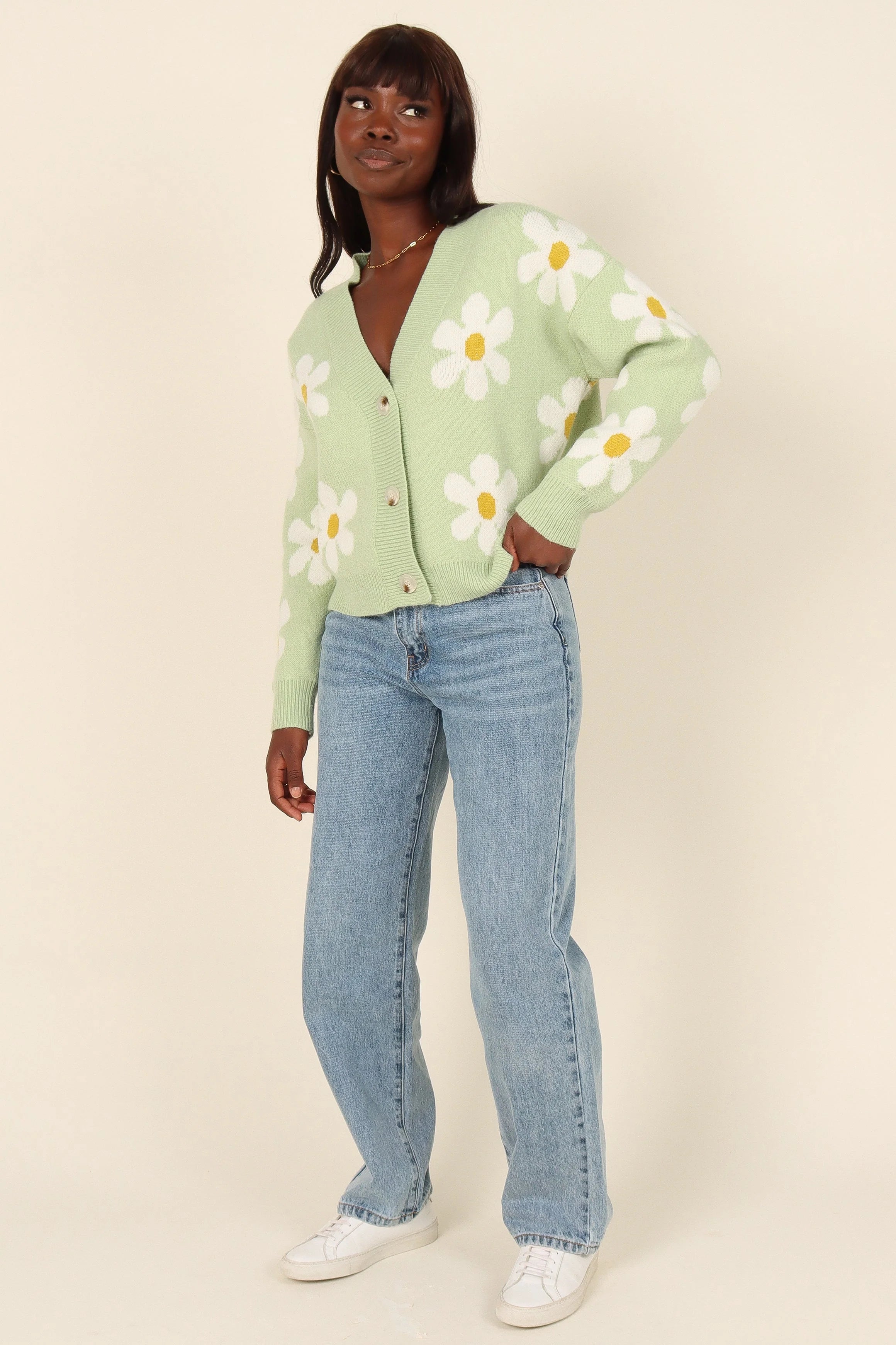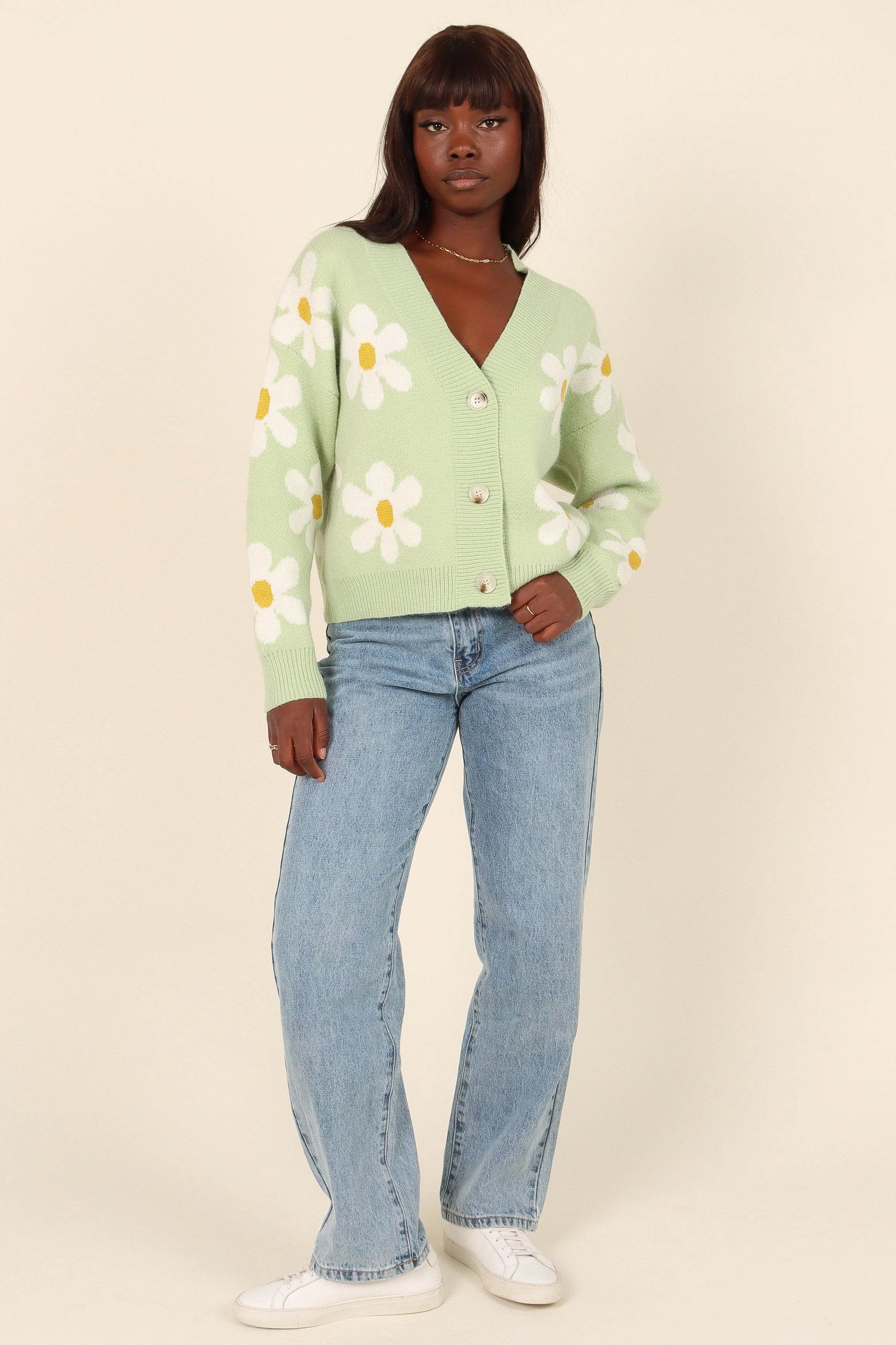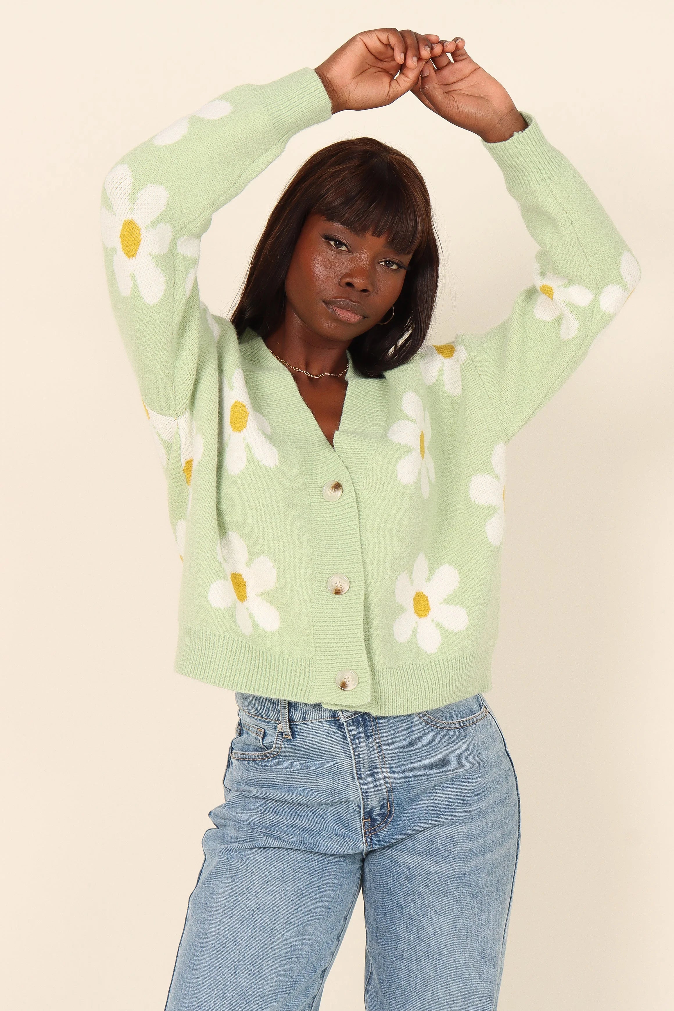 DETAILS Let your style blossom with this cropped length cardigan! Featuring a V-neckline, long sleeves with ribbed cuffs and front functional button close, this relaxed fit top is detailed with a delicate white floral daisy print.