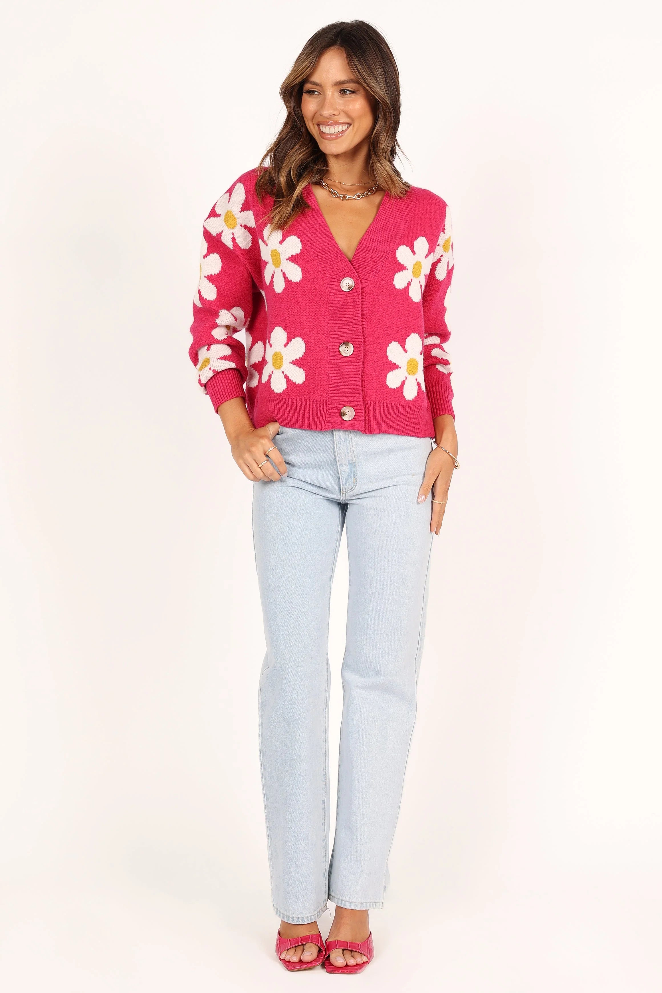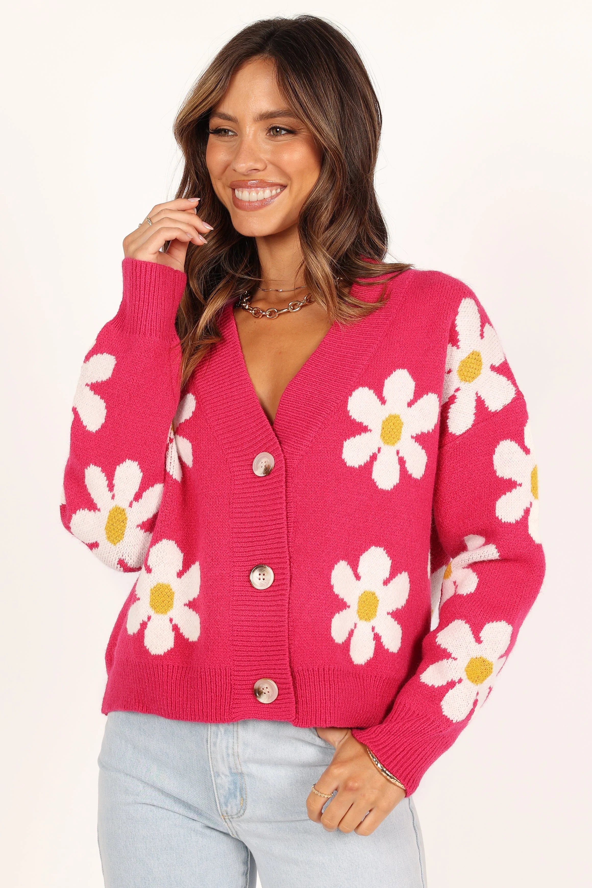 DETAILS Let your style blossom with this cropped length cardigan! Featuring a v-neckline, long sleeves with ribbed cuffs and front functional button close, this relaxed fit top is detailed with a delicate white floral daisy print.