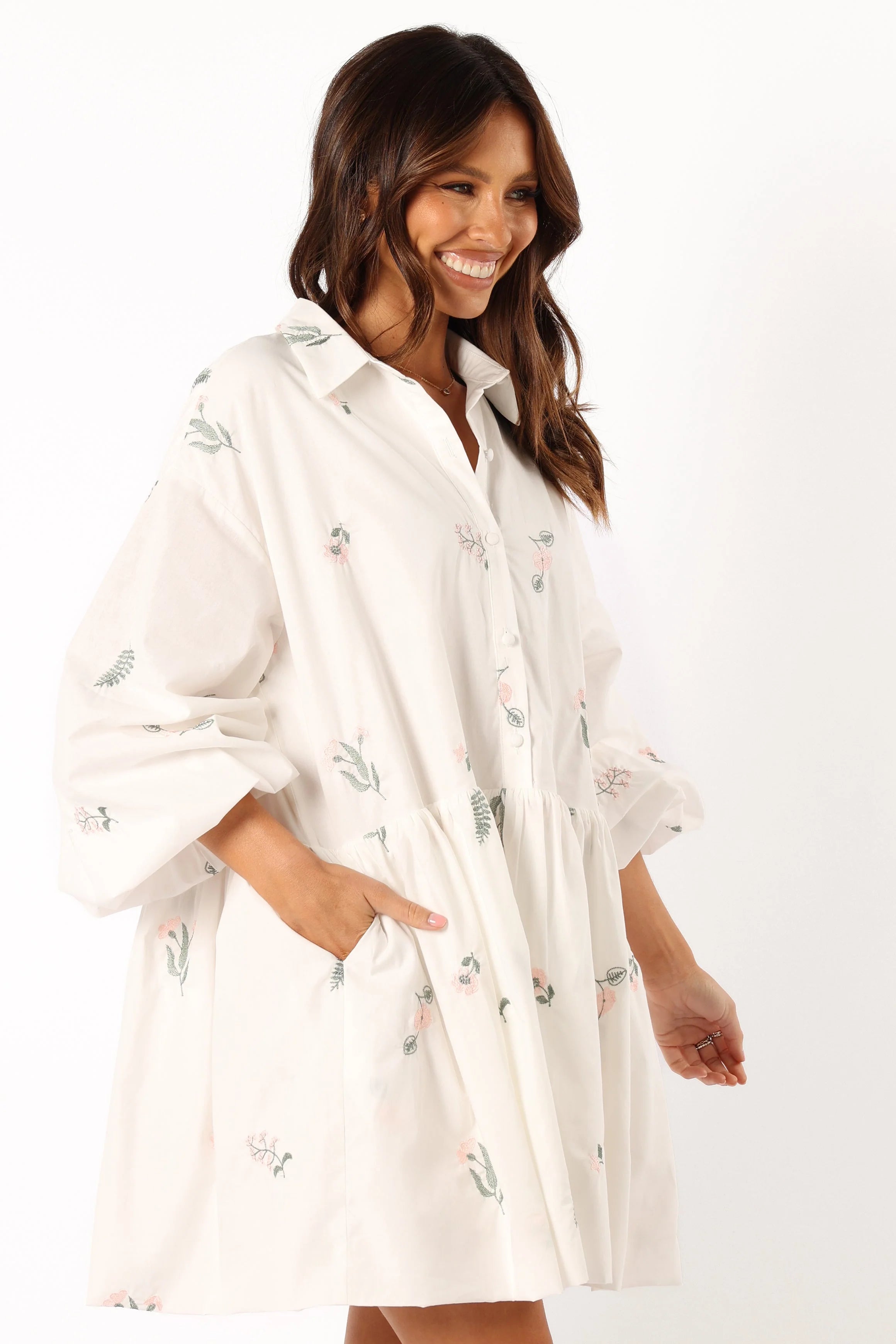 | DETAILS This smock style dress exudes a chic charm with its mini length and spread collar, perfectly paired with a flattering V neckline. The long sleeves with elasticised cuffs and functional buttons down the front add practical elegance. The dress also comes with functional pockets, marrying style and convenience.