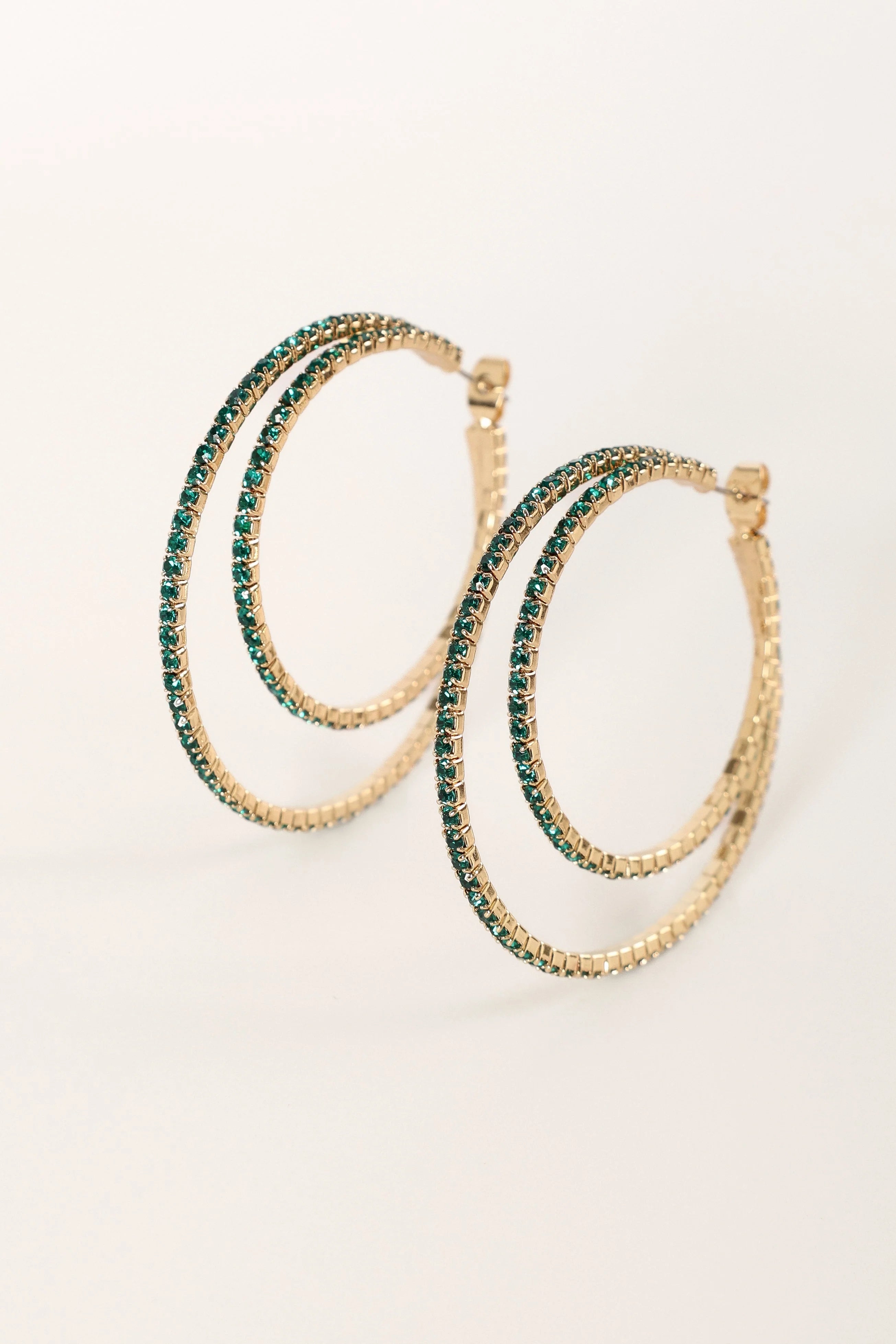 DETAILS Be the trendsetter wearing our double hoop design earrings. Made with a bold and beautiful rhinestone detail, these earrings are sure to add an element of sparkle to your wardrobe.