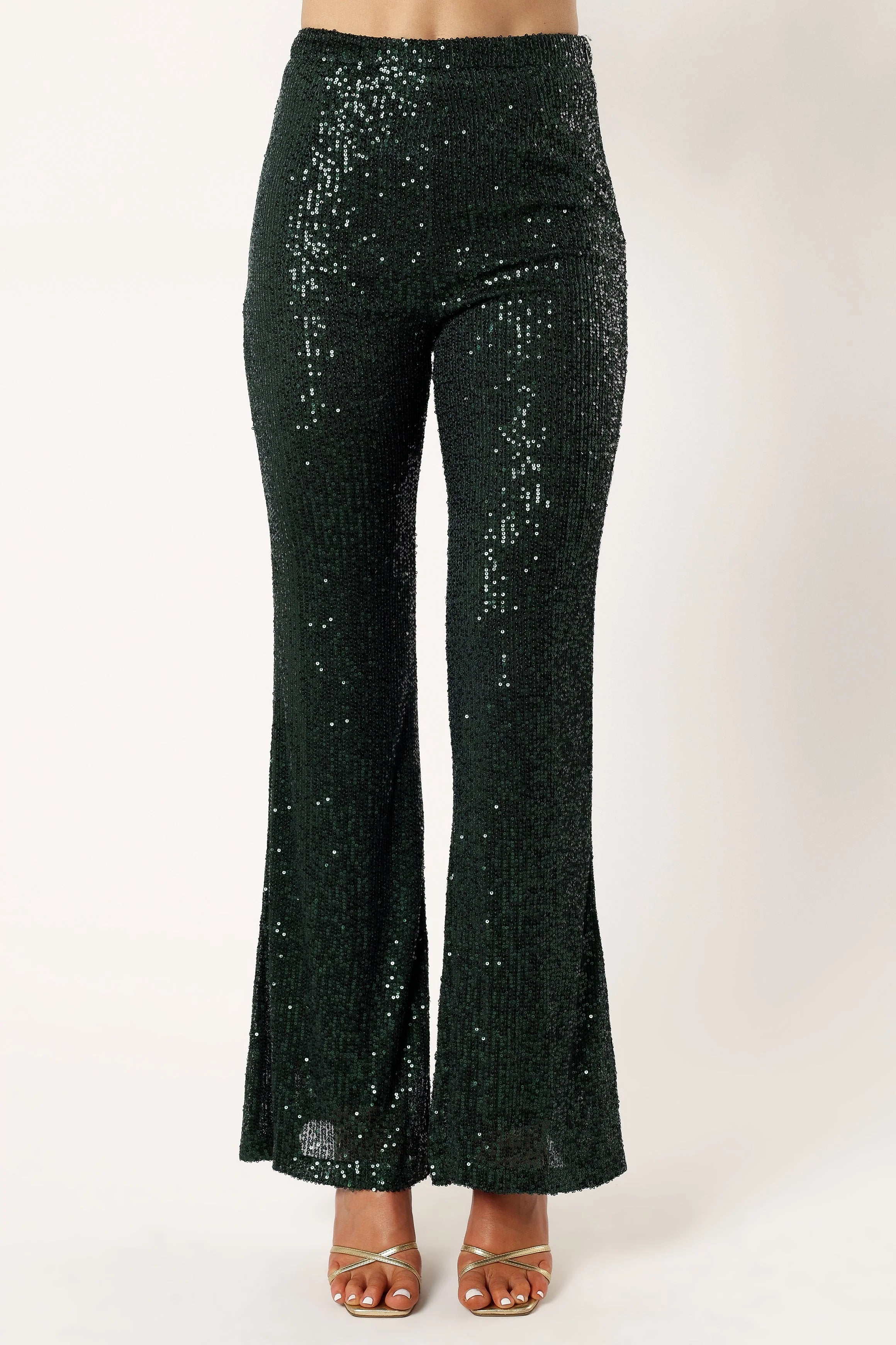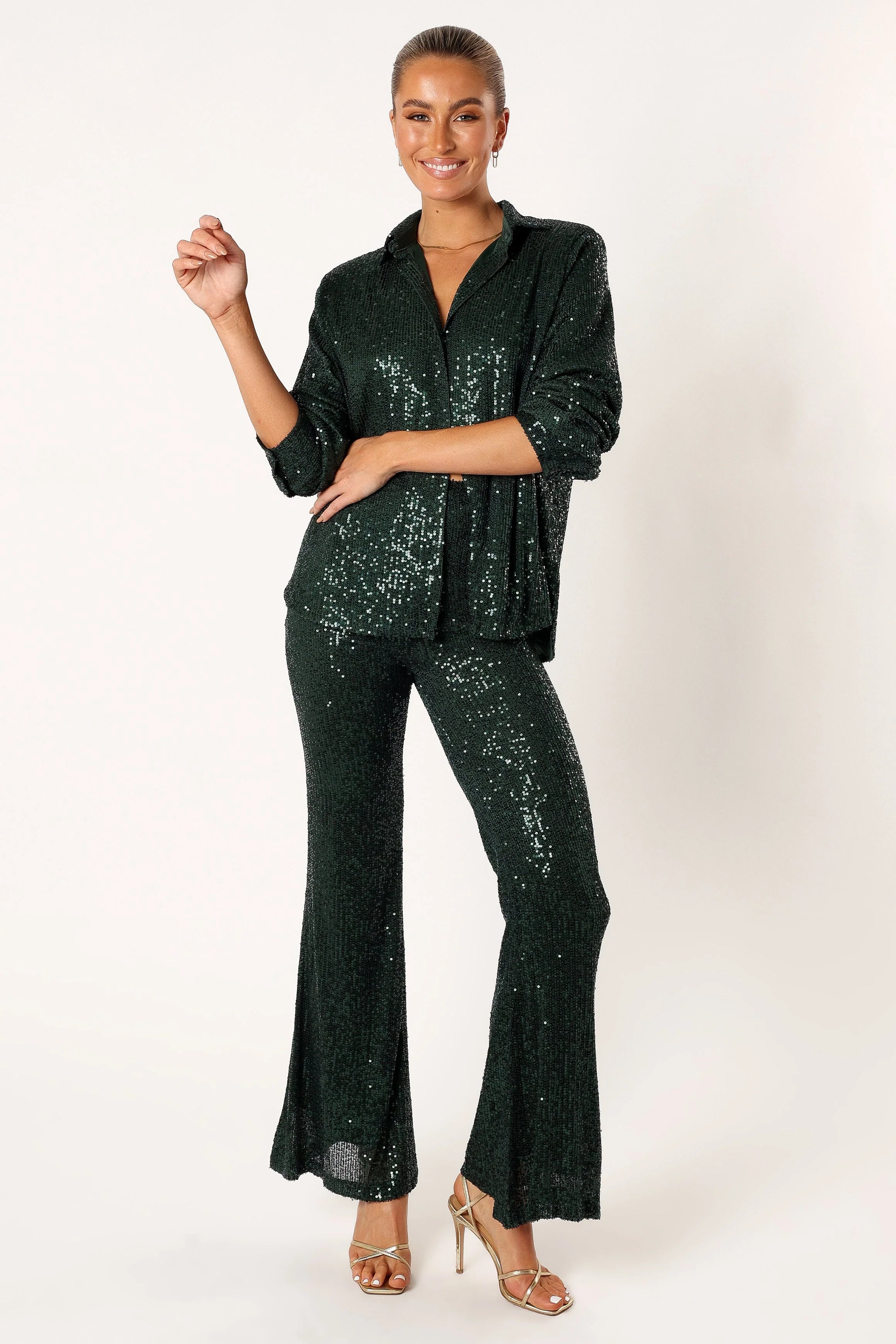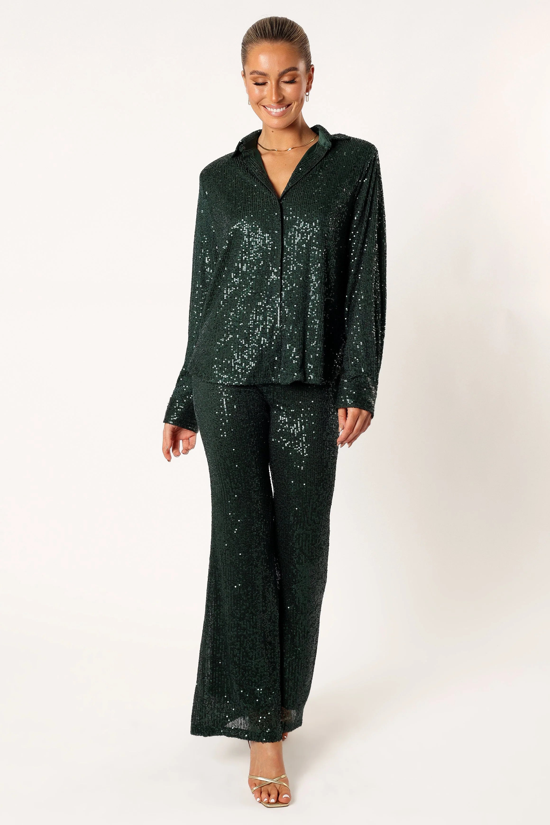 DETAILS If you're looking to make a statement, this top and pant set is the way to go. With its bold hunter green color and delicate sequin material, you'll be sure to turn heads wherever you go. The spread collar and v neckline give this set a playful yet trendy look, while the long sleeves with close buttons add a touch of sophistication.