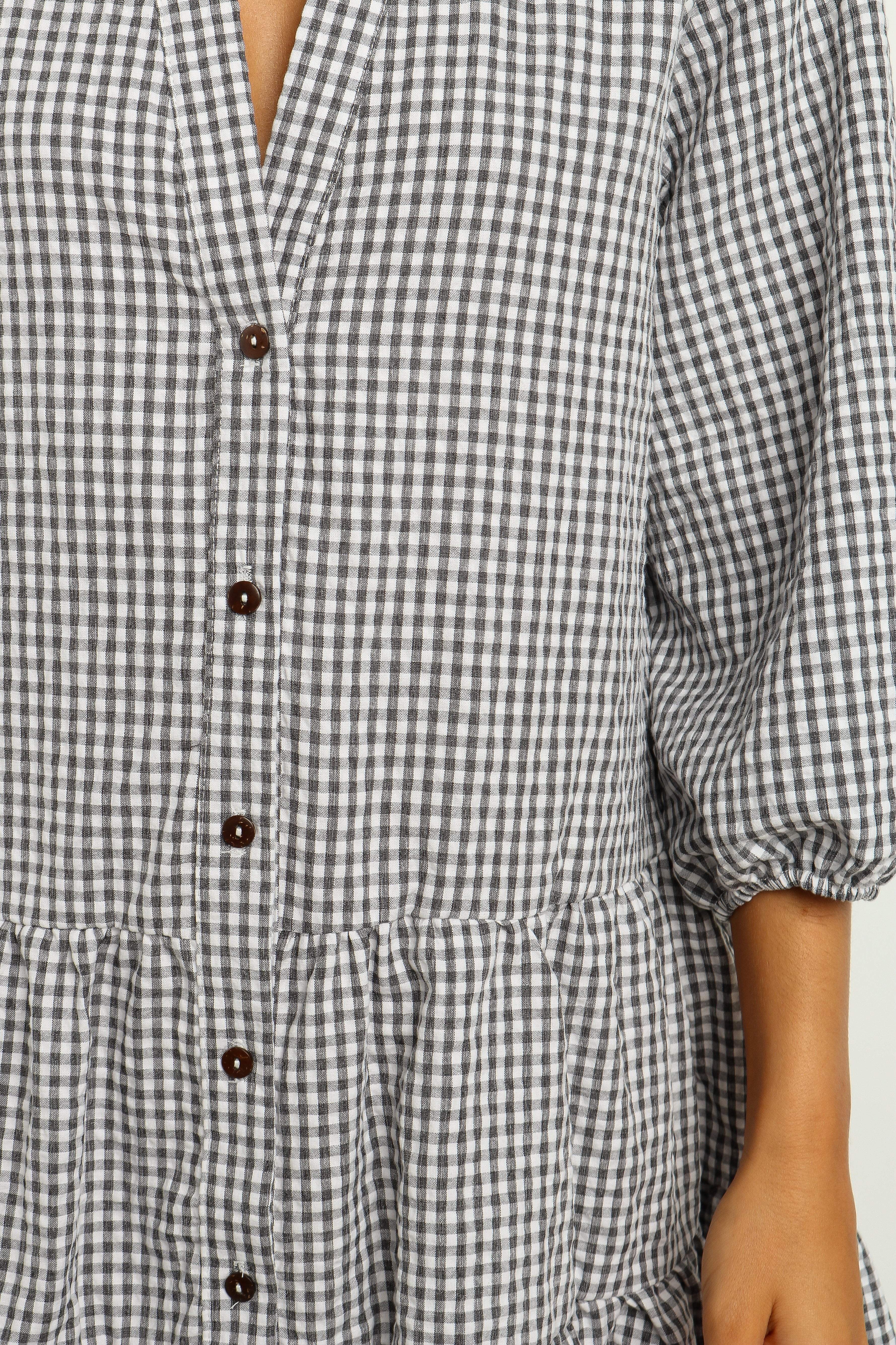 DETAILS This gorgeous gingham print dress is the perfect addition to your summer wardrobe! Its mini length and oversized relaxed fit make it a comfortable, yet stylish choice. The v neckline gives this dress a fun touch, while the long sleeves with elasticised cuff add an elegant flair.