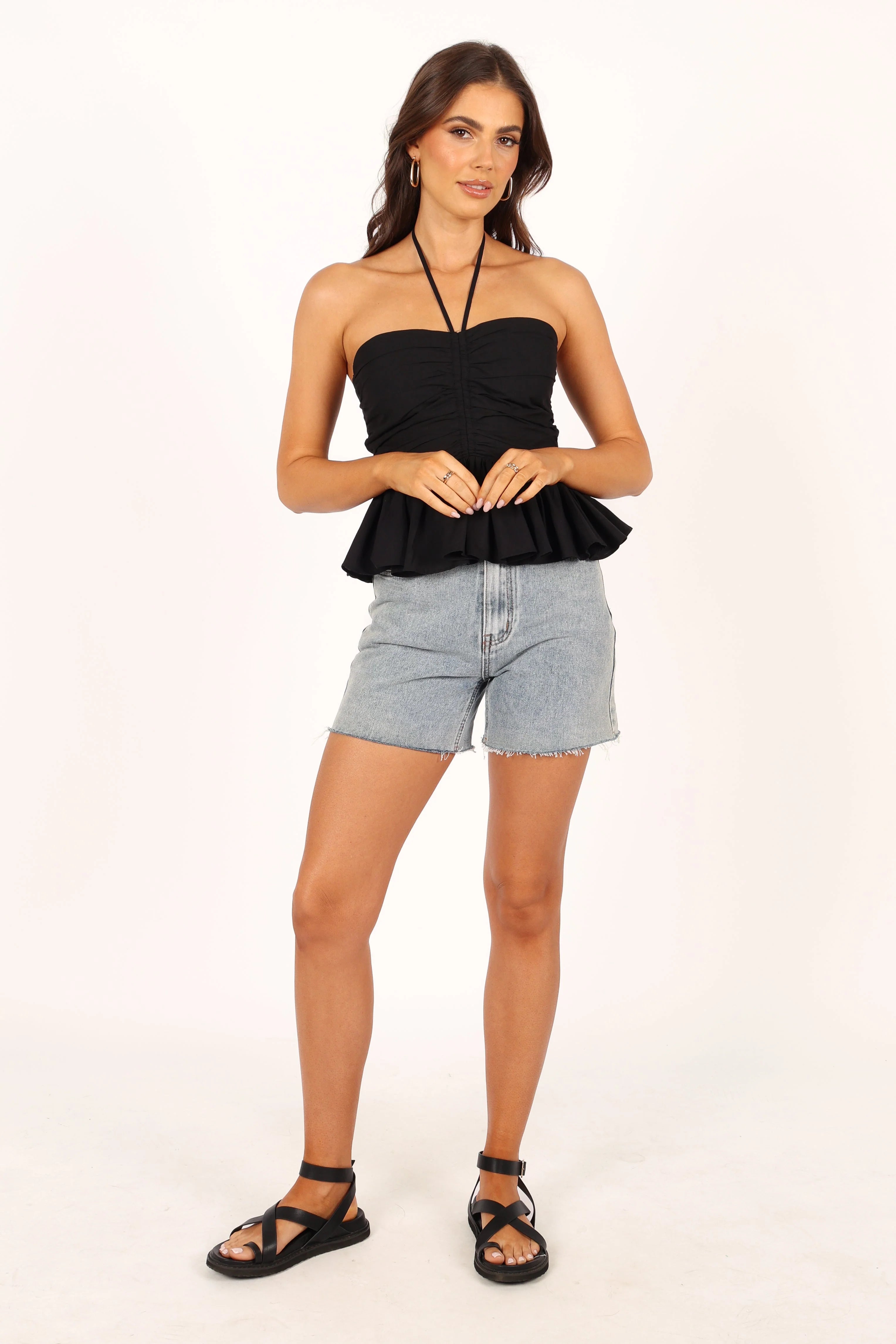 DETAILS Take your wardrobe to the next level with this gorgeous black halter neck top! The straight neckline and cropped length are both stylish and flattering, while the gathered bodice detail adds a touch of texture.