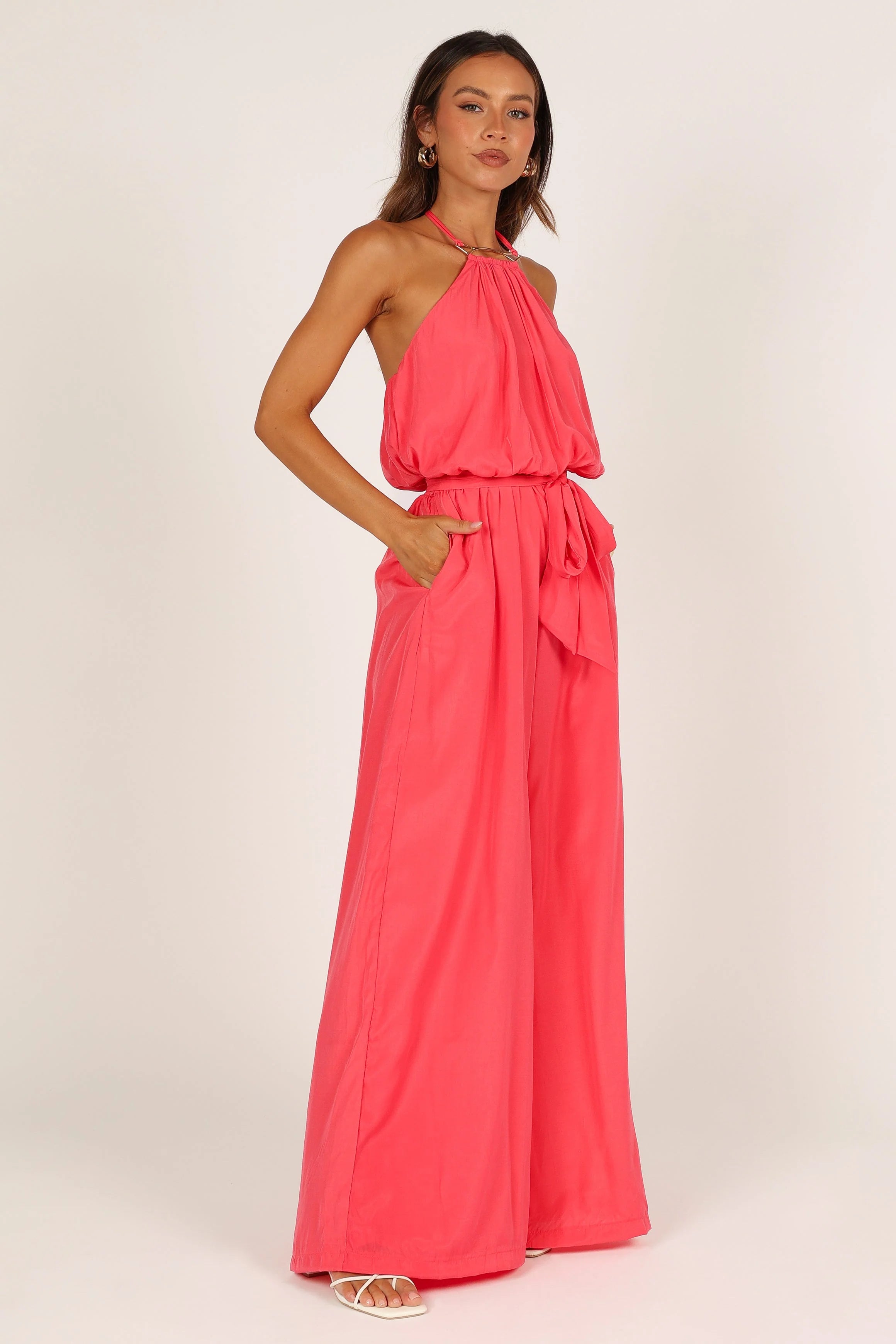 DETAILS Dazzle at your next party in this halter jumpsuit! With an eye-catching halter neckline, this jumpsuit features gold hardware details and a detachable waist tie to customize the look to fit your style.