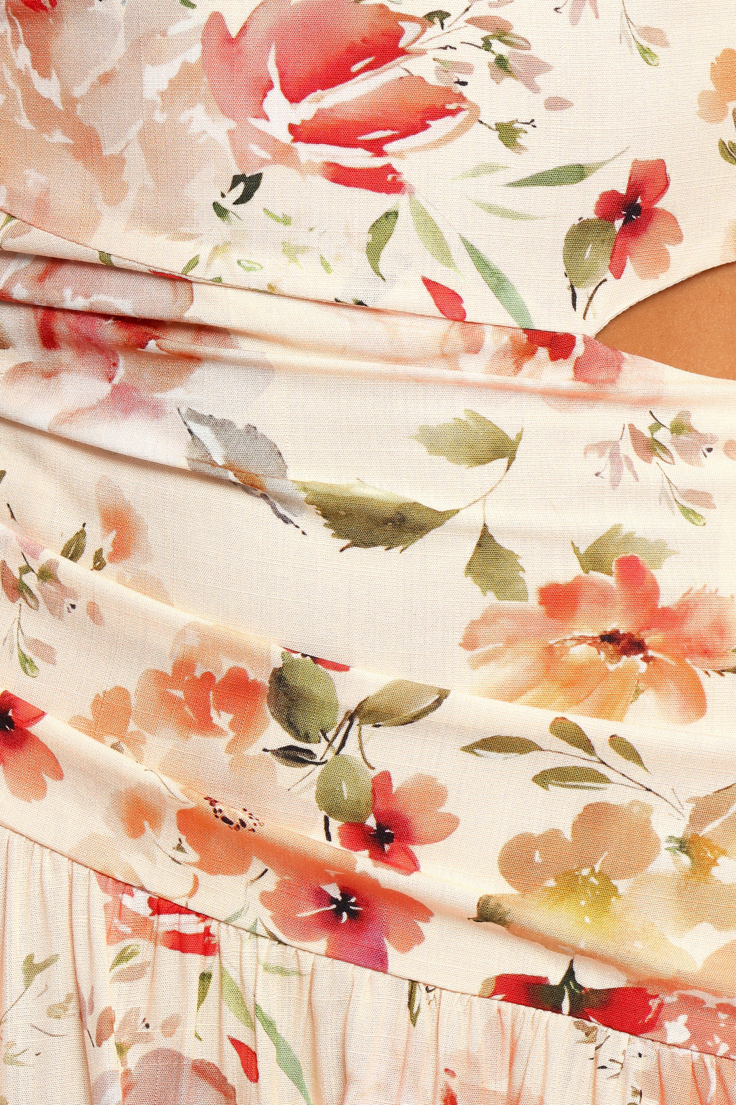 DETAILS This fashion-forward piece features a stunning asymmetrical neckline and thin, adjustable straps that offer both style and a perfect fit. The side cut-out detail and drop waist design create a flattering silhouette, while the vibrant floral print adds a fresh, contemporary touch.