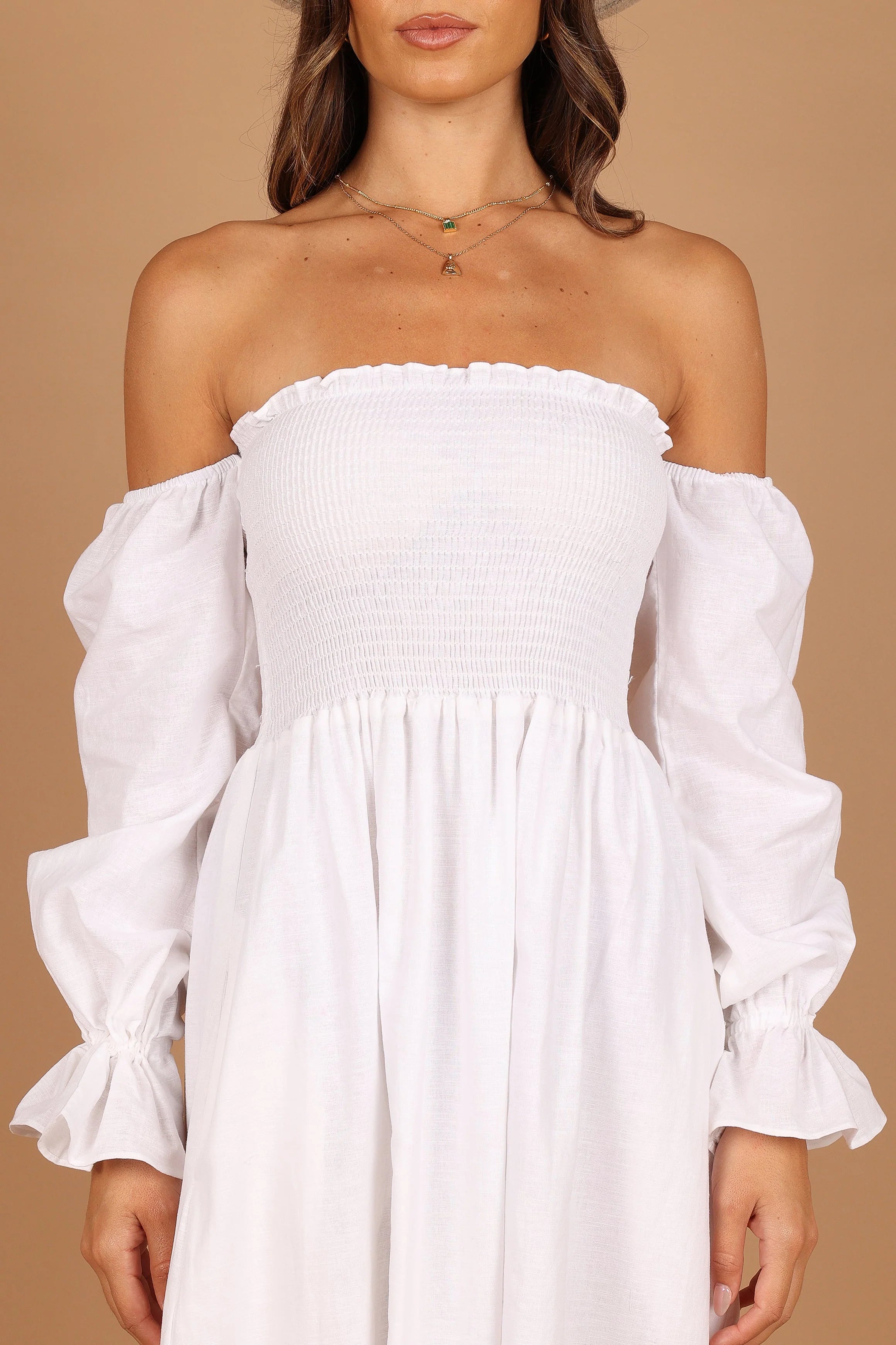 DETAILS This off shoulder midi dress is an easy-to-wear piece that will keep you feeling feminine and elegant. The long sleeves feature elasticised shoulders, complete with a ruffle cuff for added charm. The shirred bodice ensures a comfortable fit, while the functional pockets provide extra convenience.
