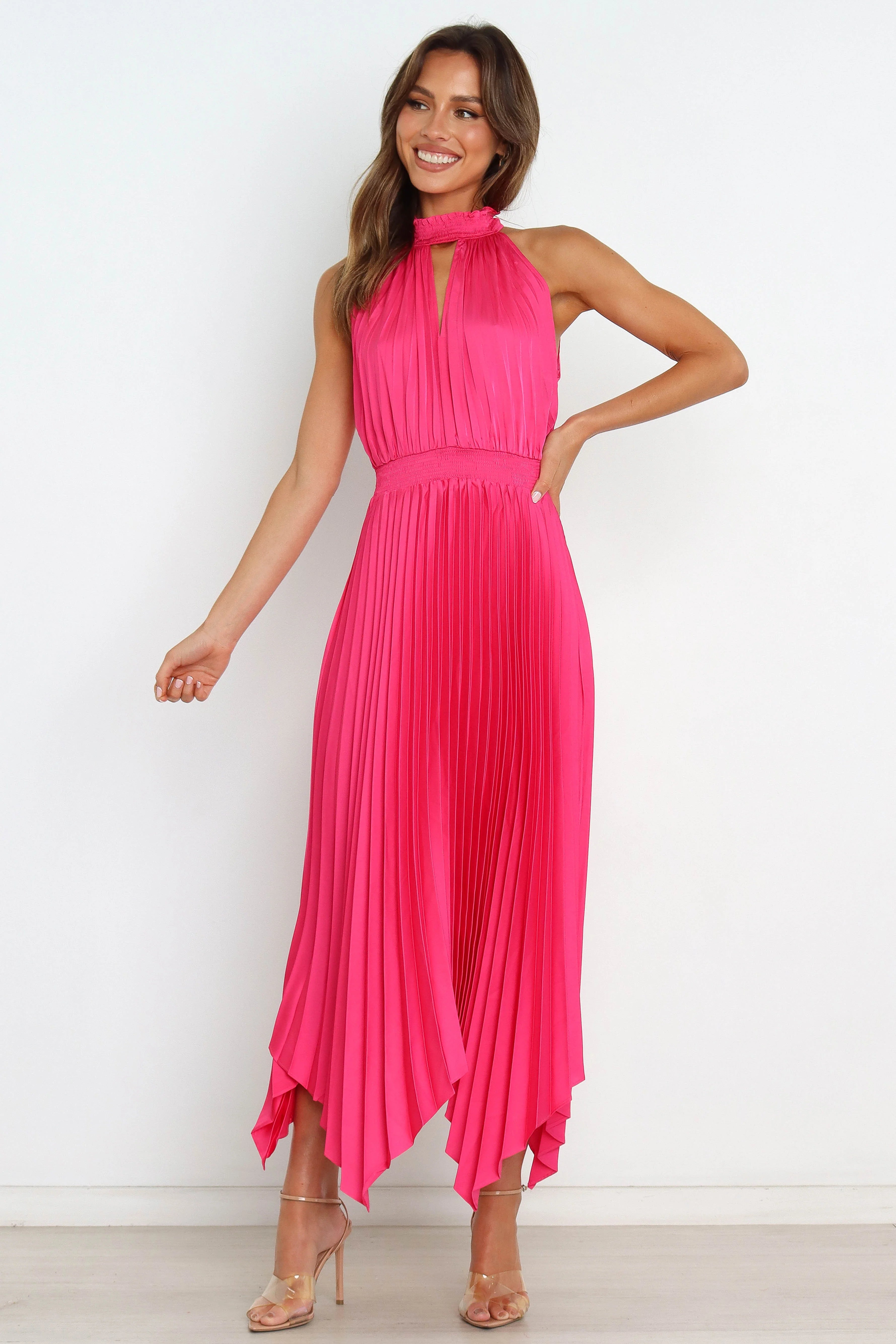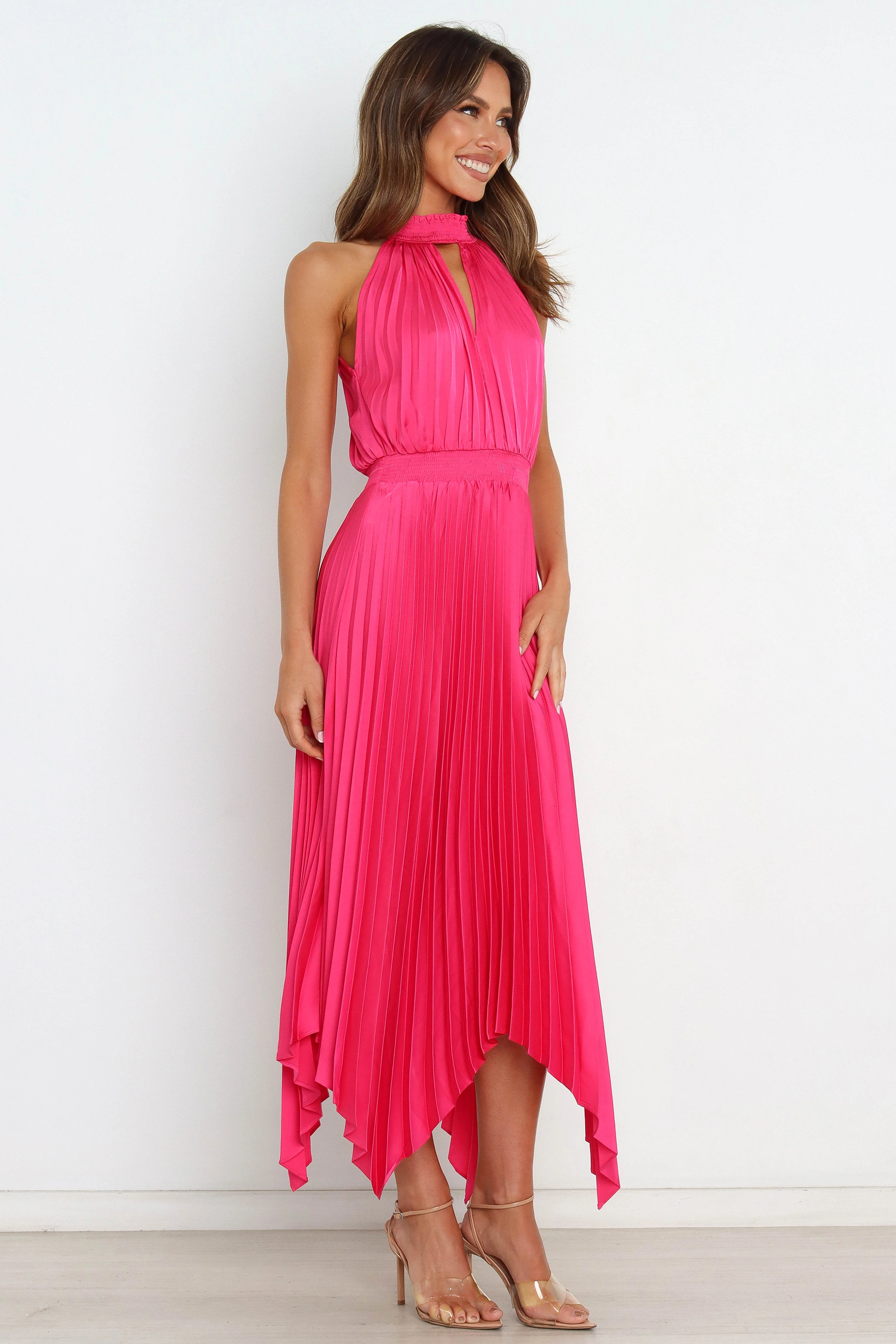 DETAILS The Dominique is an elegant halter dress with a handkerchief hemline and cut outs for a touch of fun. Shirring creates a stunning silhouette, while the button close front means it's easily worn. Perfect for date night or special events, the fine pleats and satin finish will have you feeling stylish.