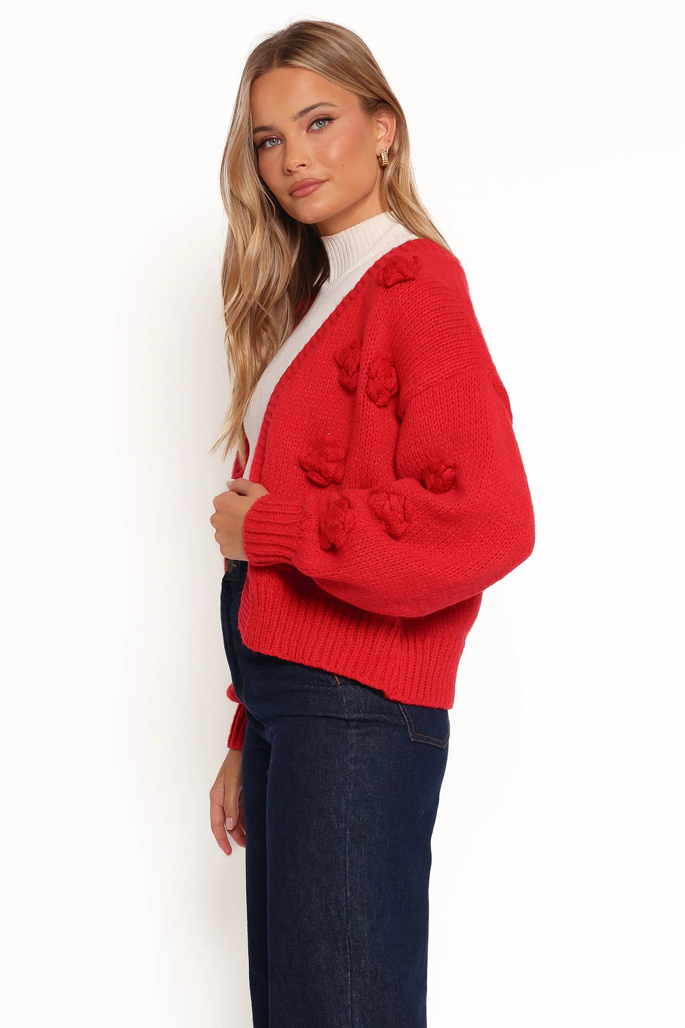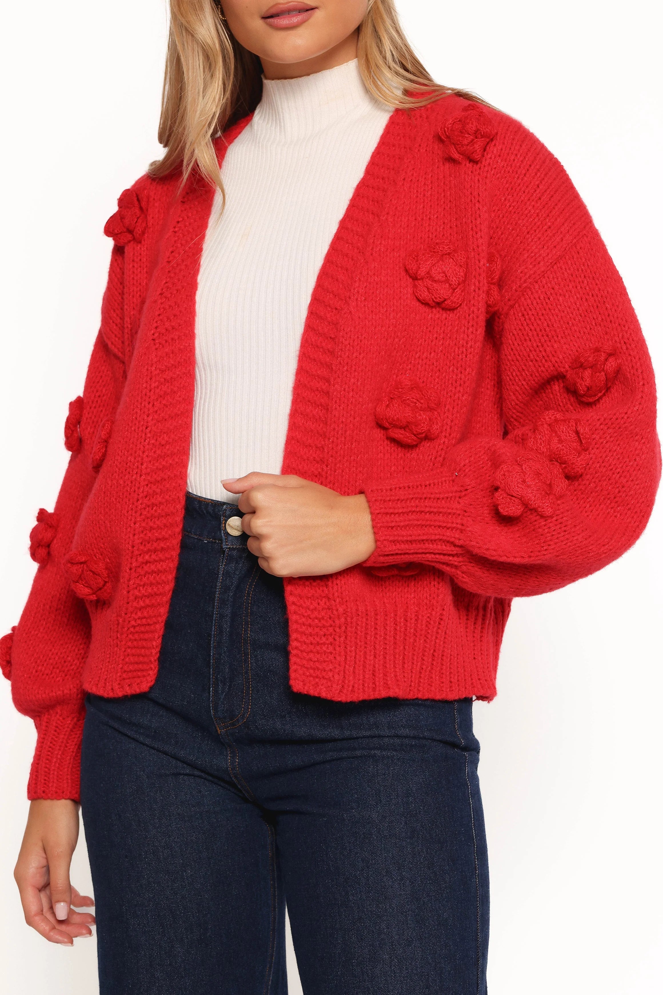 DETAILS Featuring a V neckline and long balloon sleeves with ribbed cuffs, it's designed for a relaxed fit that feels as good as it looks. The front is adorned with eye-catching three-dimensional flowers, adding a touch of whimsy to your outfit. A ribbed hemline completes the look, ensuring the cardigan sits just right.