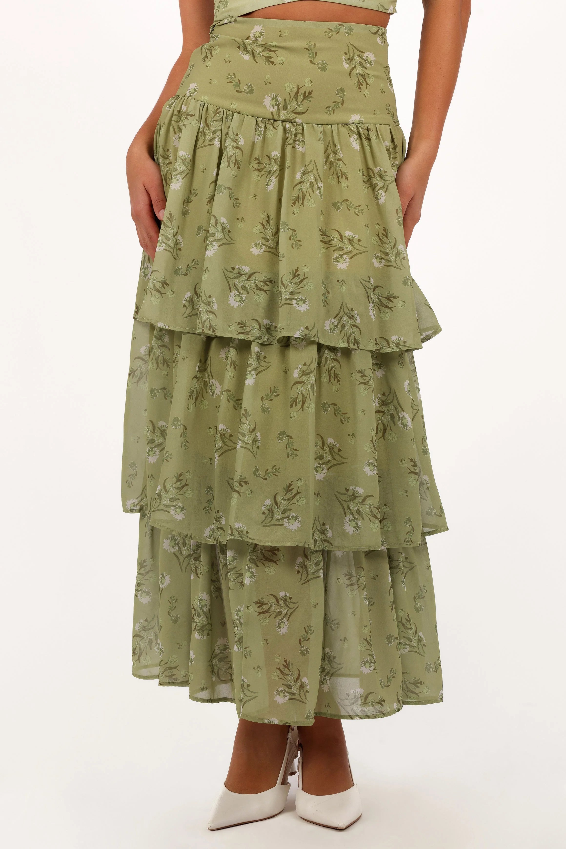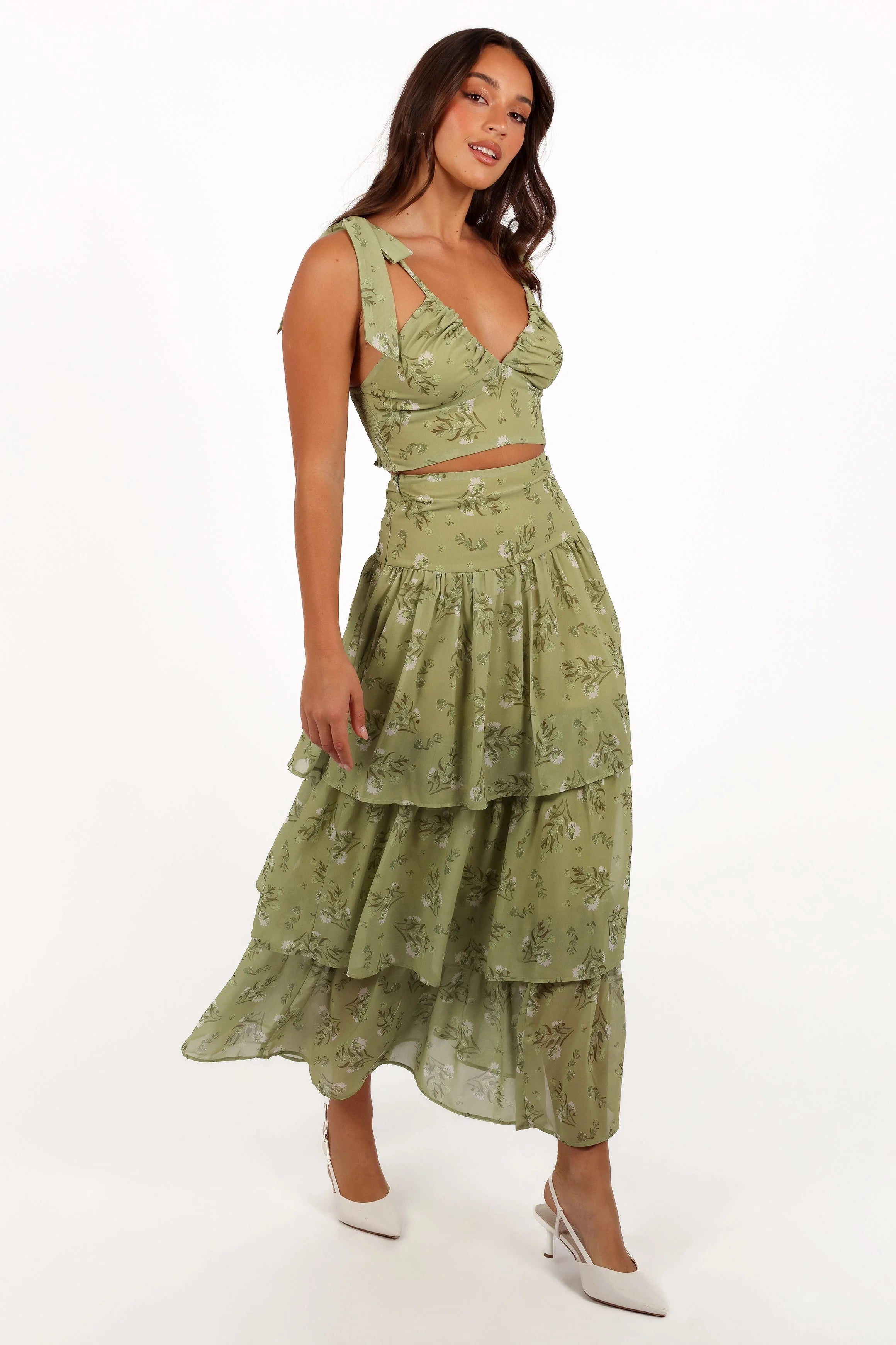DETAILS This two-piece set features an alluring cropped length top with a v neckline and back shirred panel. The maxi length skirt has a high-waisted fit and an invisible side zip closure. It's layered skirt design adds movement, as well as being lined.