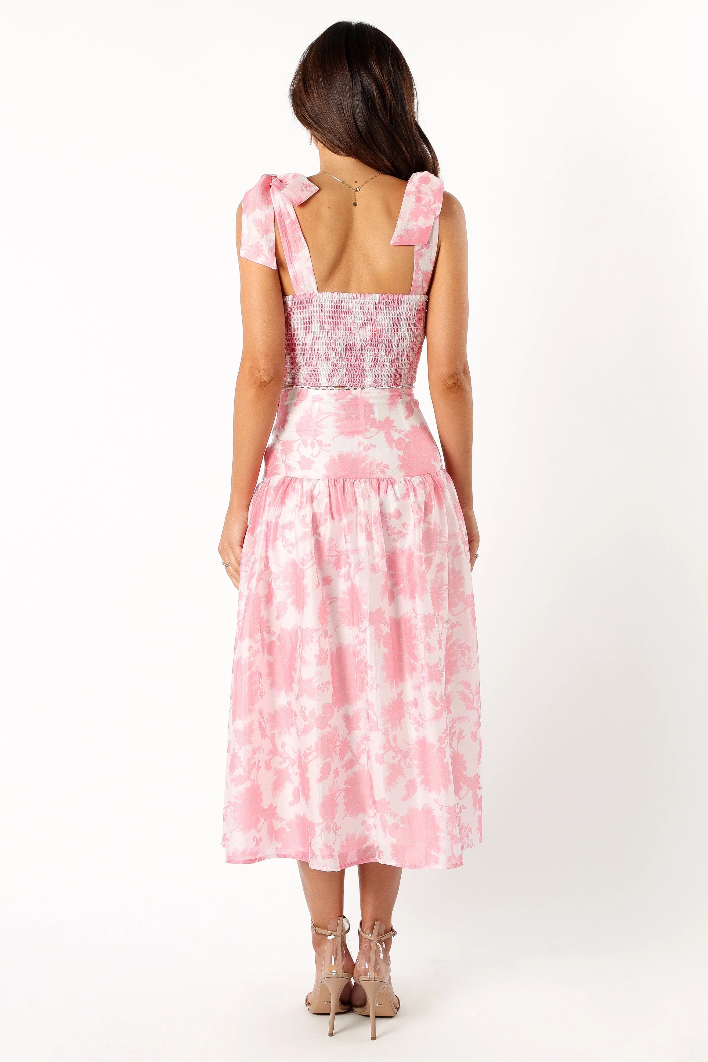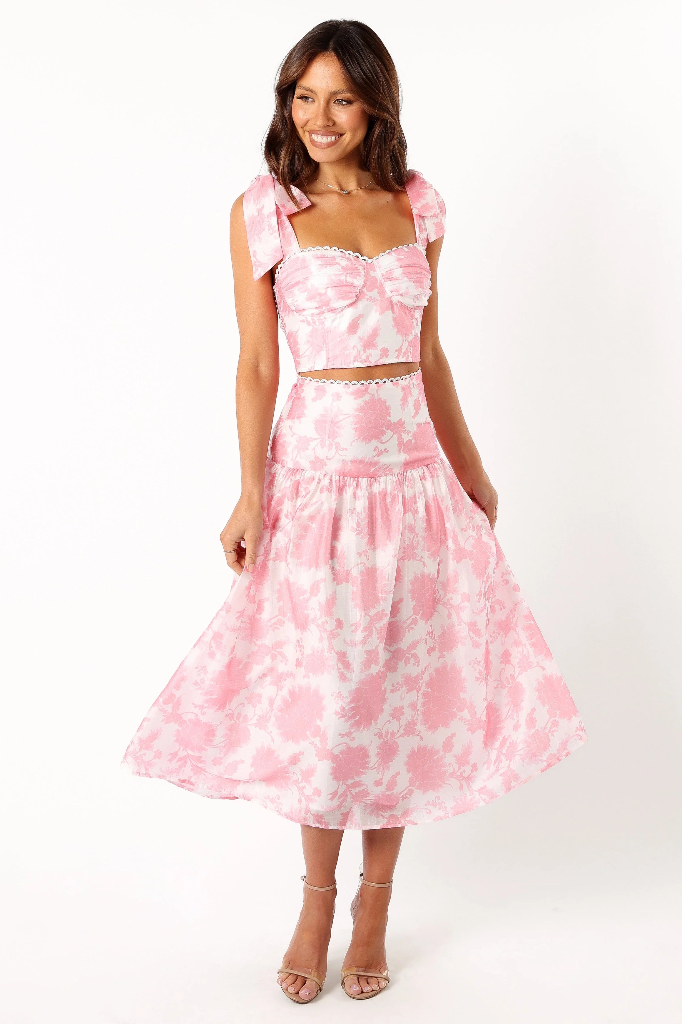 DETAILS Step into the chic side of life with our dazzling top and skirt set. Designed for the trendy at heart, the set features a cropped-length top with a flirty sweetheart neckline and padded bra cups for that extra comfort. The high-waisted skirt, graced with an invisible side zip and hook clasp, sweeps beautifully to a midi length.