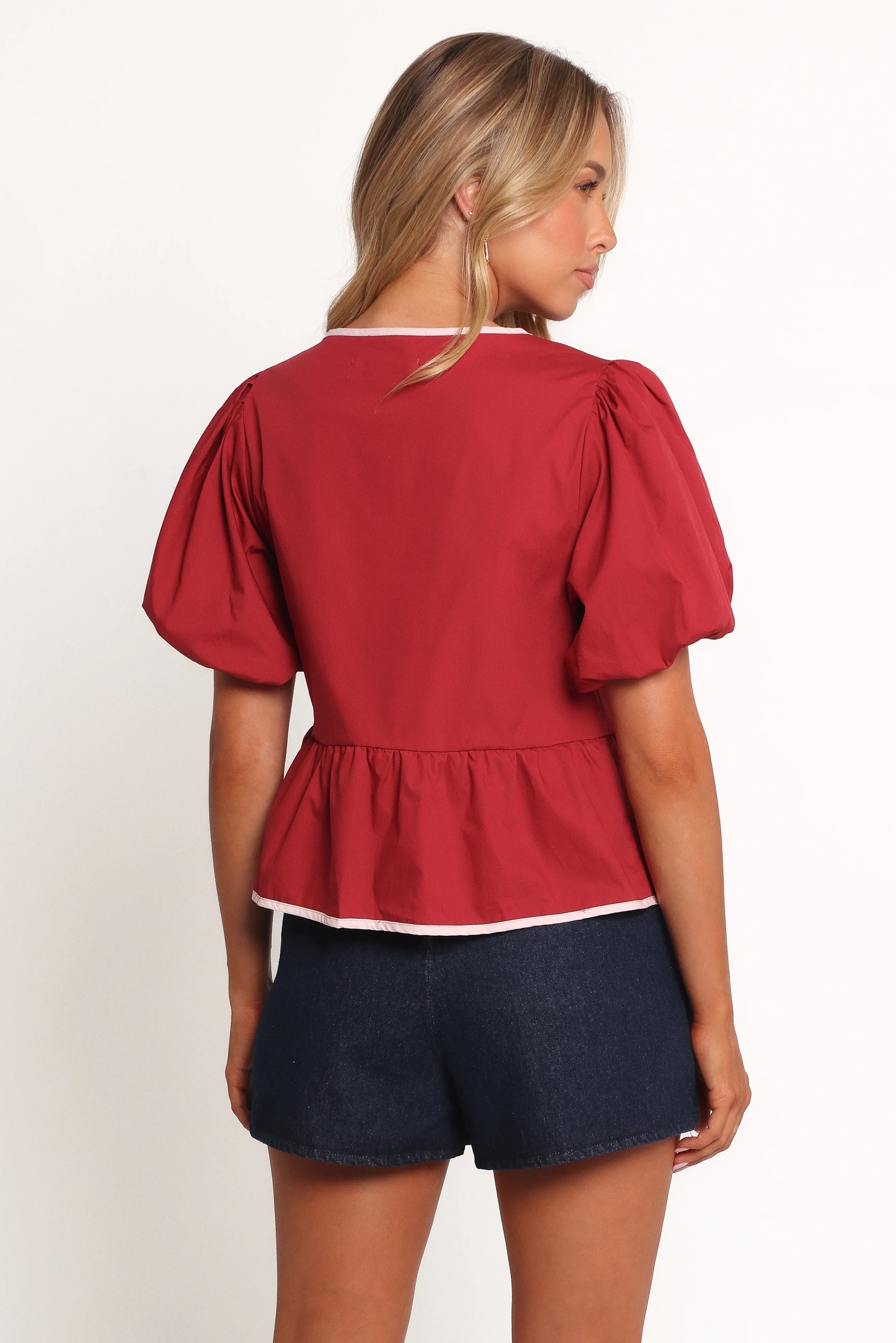 DETAILS Featuring a timeless round neckline and playful short puff sleeves with elasticized cuffs, it's perfect for adding a touch of drama to your look. The front cut-out detail and functional tie closure combine elegance with a modern edge, making this top truly unique.