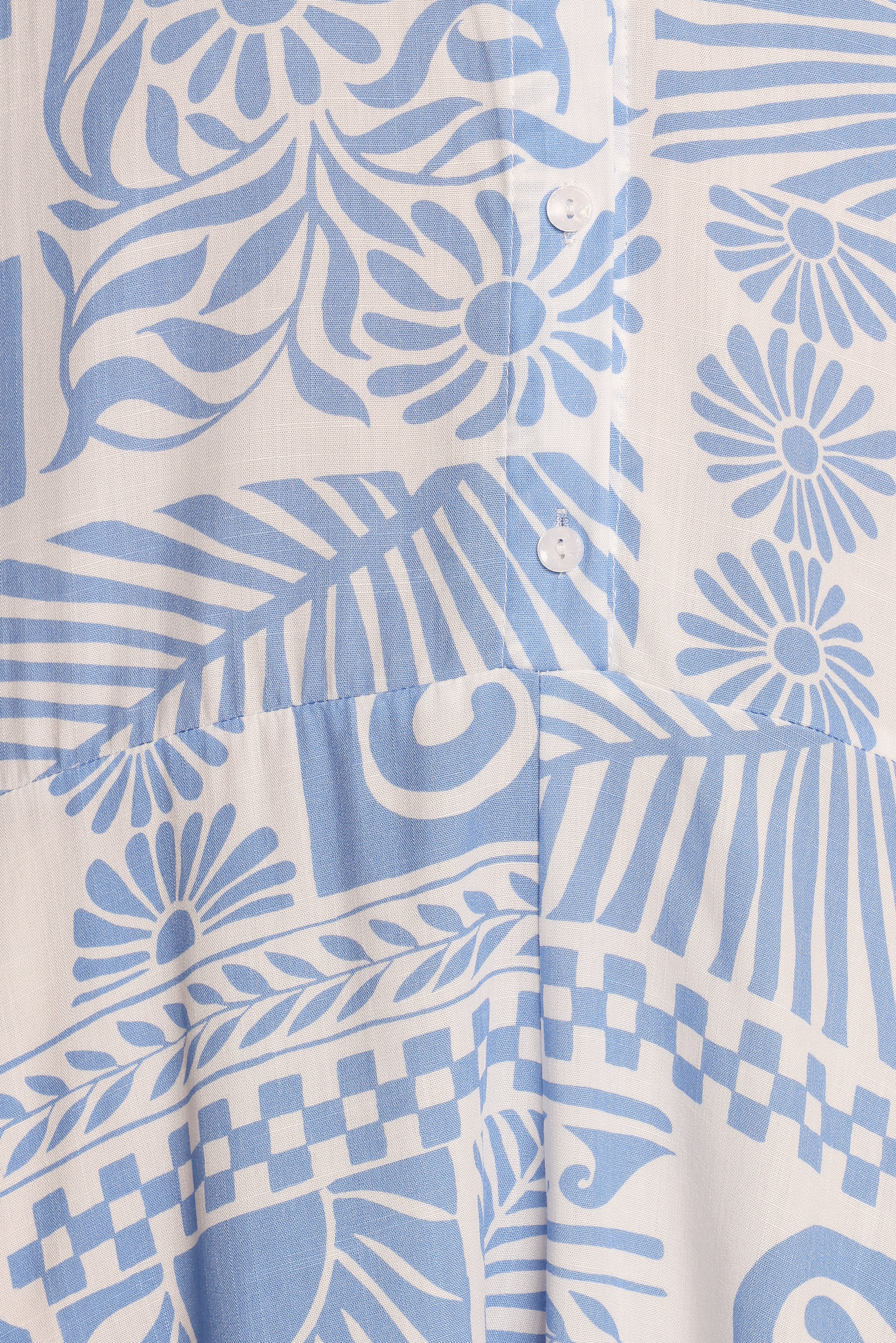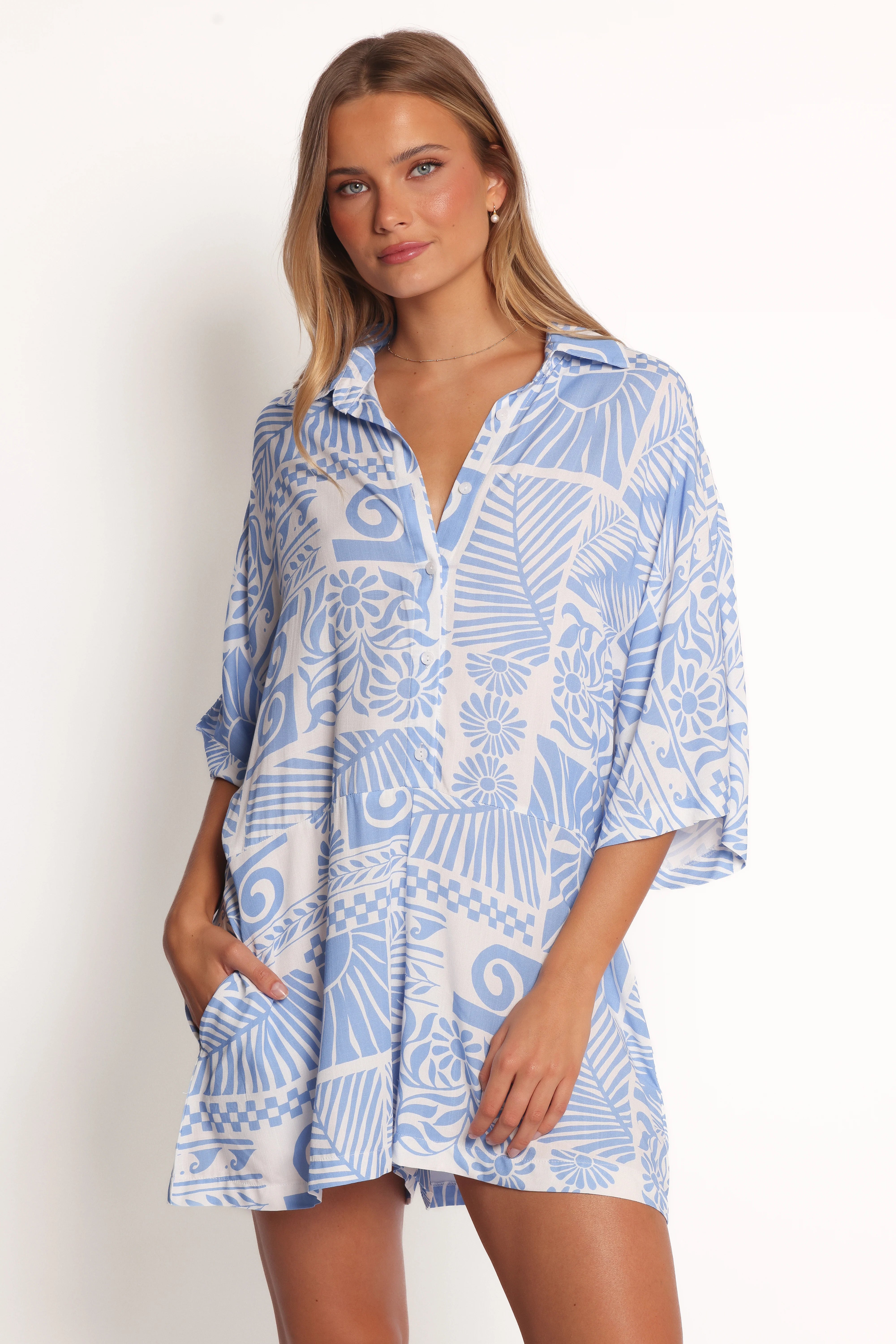 DETAILS Discover the ultimate blend of comfort and style with this stunning blue floral romper. This chic piece is perfect for a stylish summer, featuring a flattering V-neckline that visually elongates the neck and highlights your collarbone.
