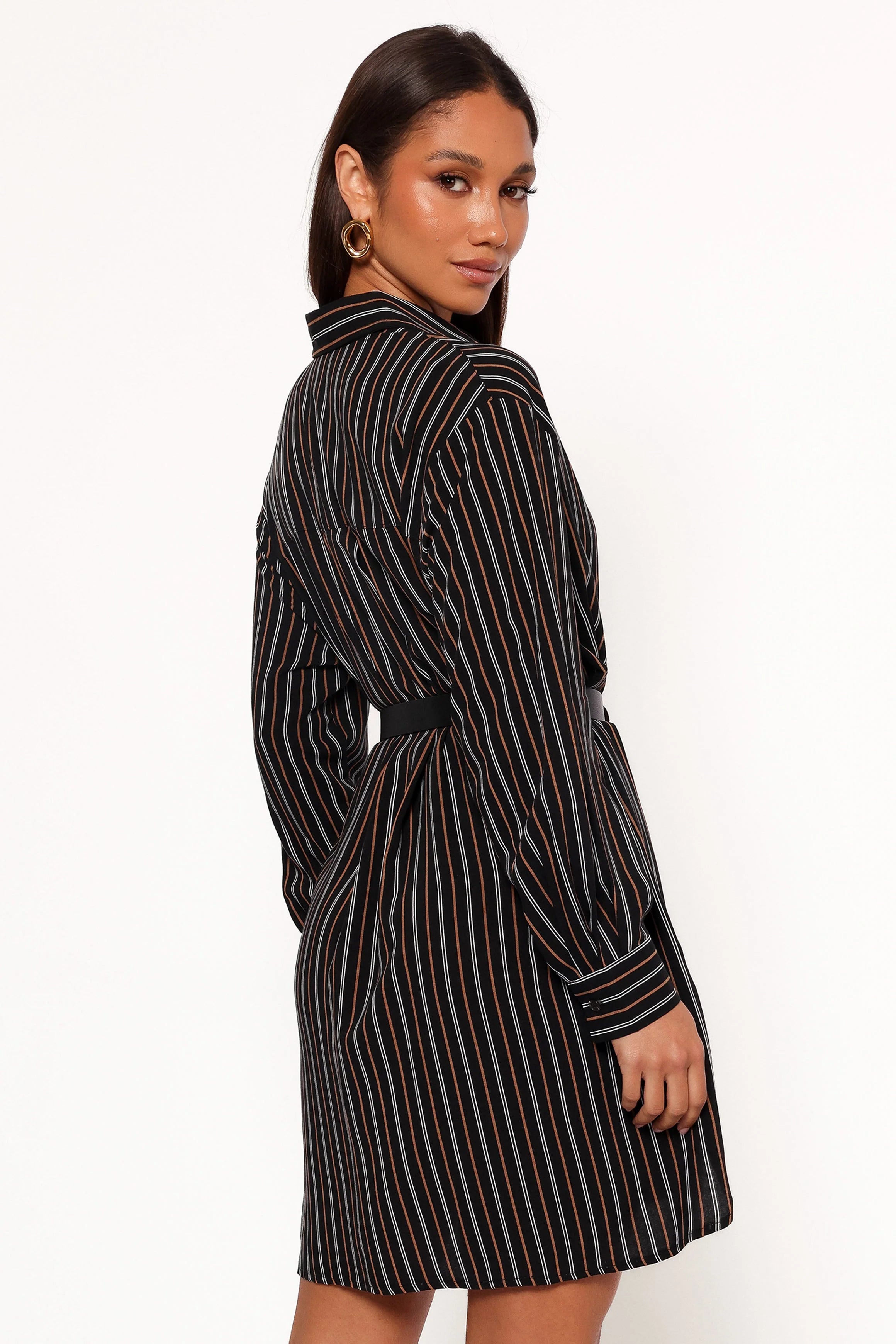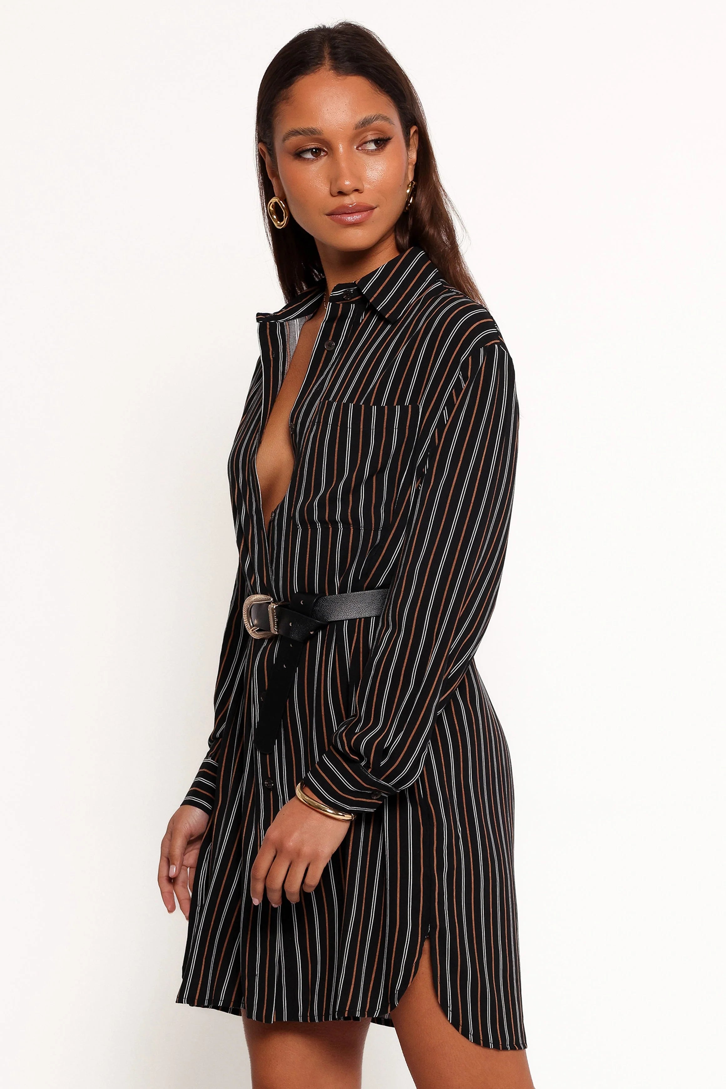 DETAILS Imagine strolling into brunch wearing a dress that turns heads without trying too hard. Our Striped Shirt Dress features a classic collared neckline and a flattering above-knee length that effortlessly blends sophistication with a hint of playfulness.