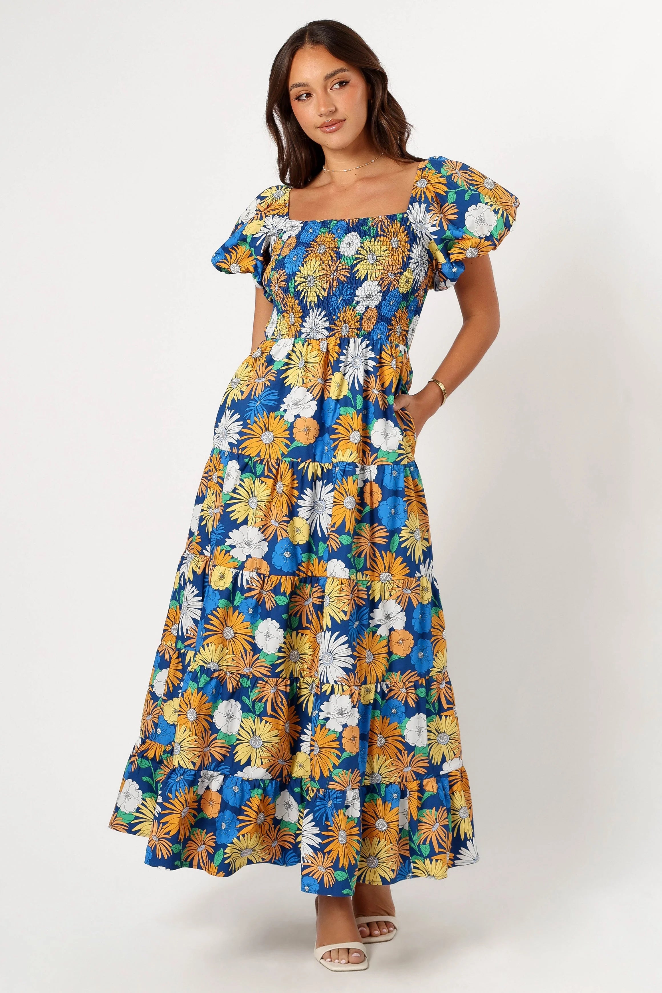 DETAILS Looking for something to wear this spring? Look no further than this maxi dress! With a straight neckline, short puff sleeves with elasticised cuff, and a drop tier a-line style skirt, it will give you a flattering silhouette. Plus it has functional pockets - perfect for those essential items!