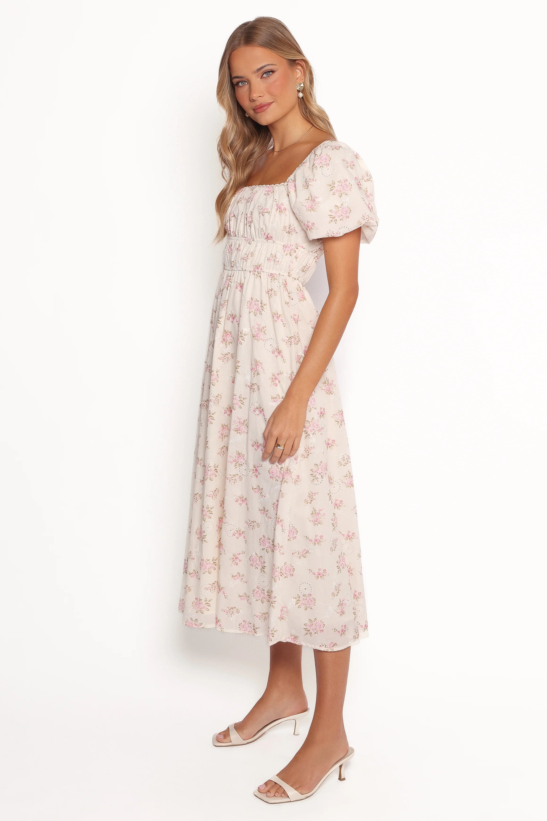 DETAILS Step into effortless elegance with our Eowyn Maxi Dress in Ivory Pink. Designed with a soft, floral print and an airy A-line skirt, this dress is perfect for garden parties, weekend strolls, or relaxed celebrations.