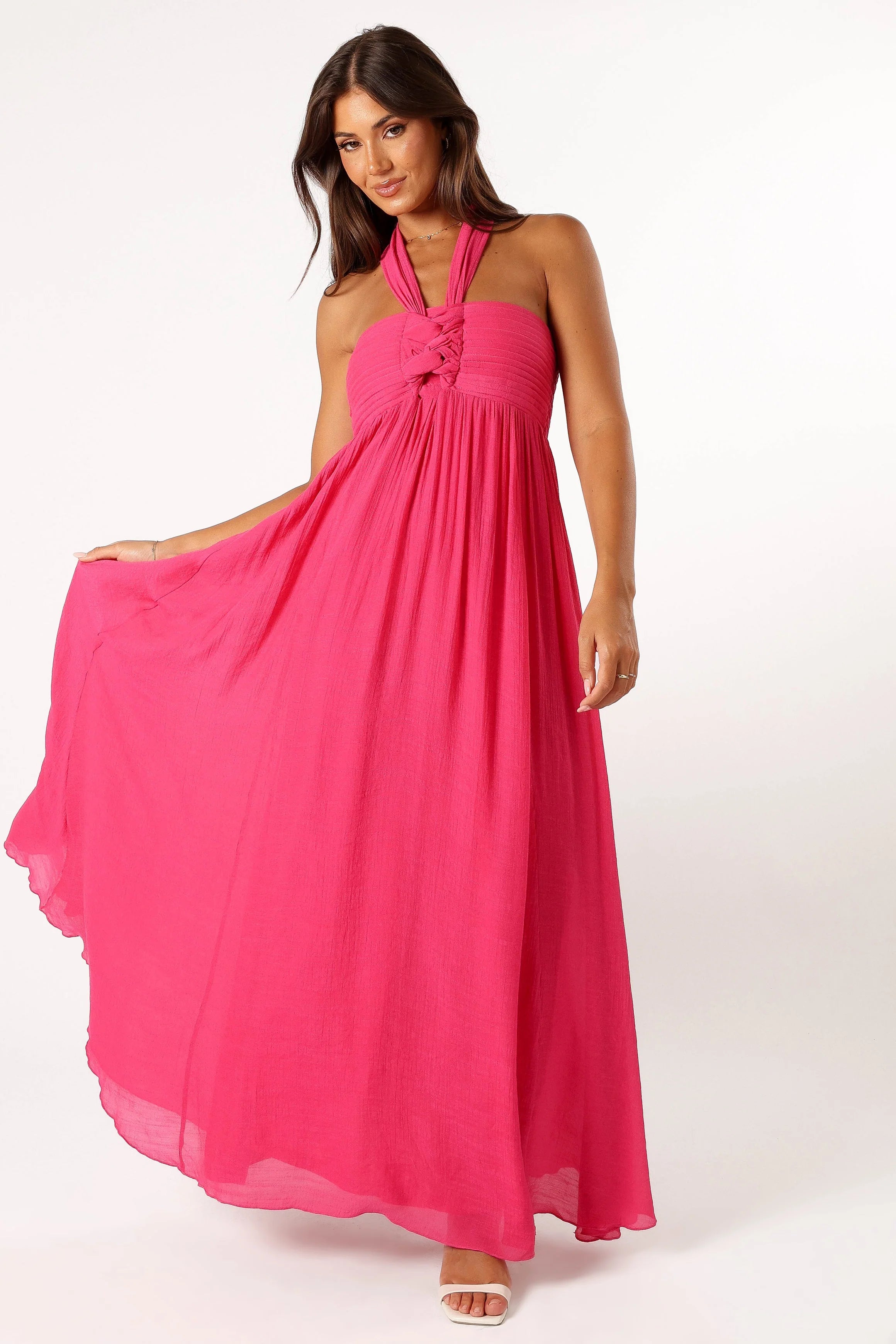 DETAILS Exuding a playful yet trendy vibe, this dress features a high halterneck with a chic tie-close detail. The shirred back panel adds a touch of comfort, and the A-line skirt design swishes with every step, guaranteeing that all eyes will be on you.