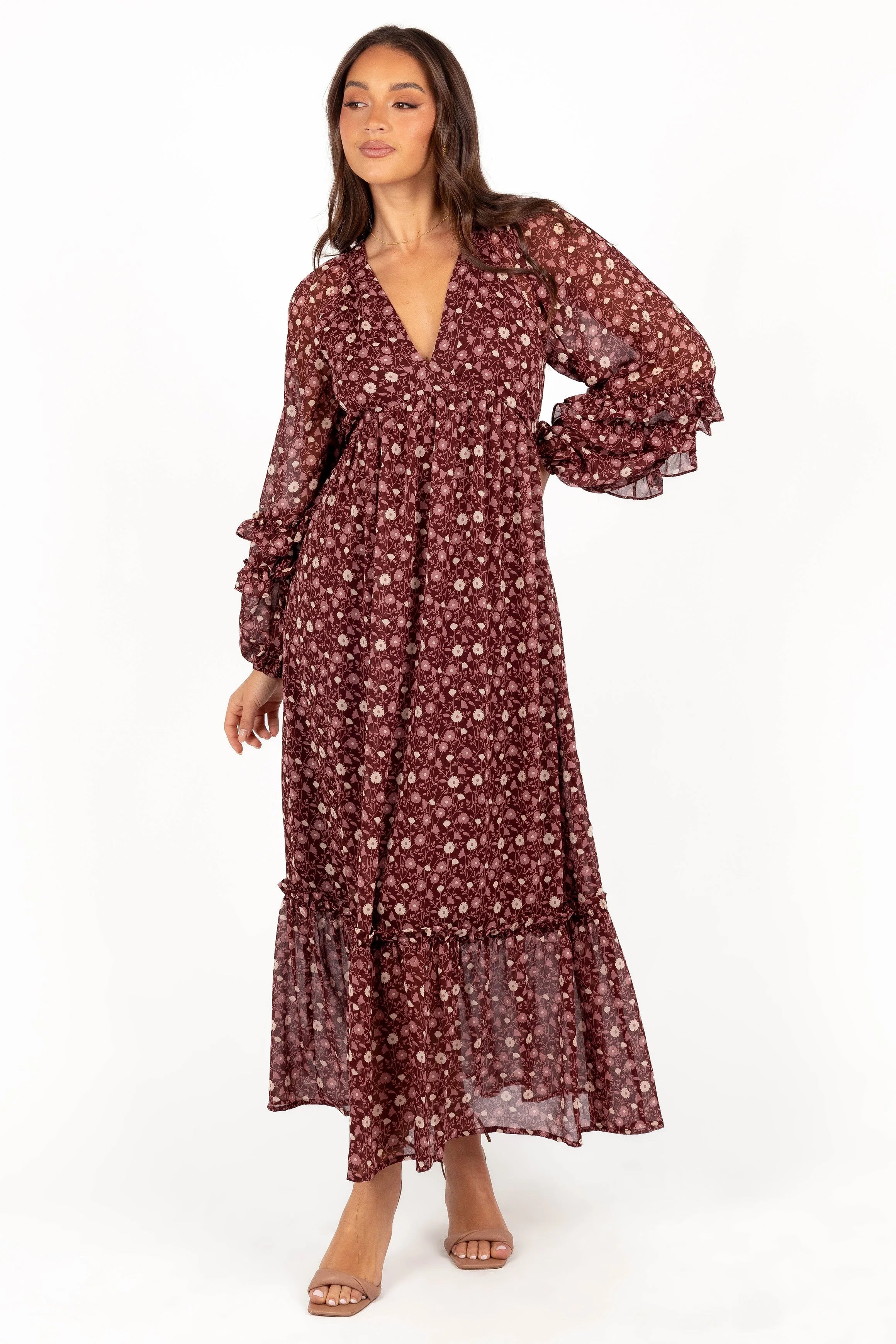 | DETAILS Transform your wardrobe with our stunning maxi-length dress. With a flattering V neckline and long sheer sleeves that end in delicate elasticized cuffs, this dress is designed to offer both elegance and comfort. The ruffle detail on the sleeves adds a touch of romantic charm, making it perfect for any occasion, from casual outings to special events.