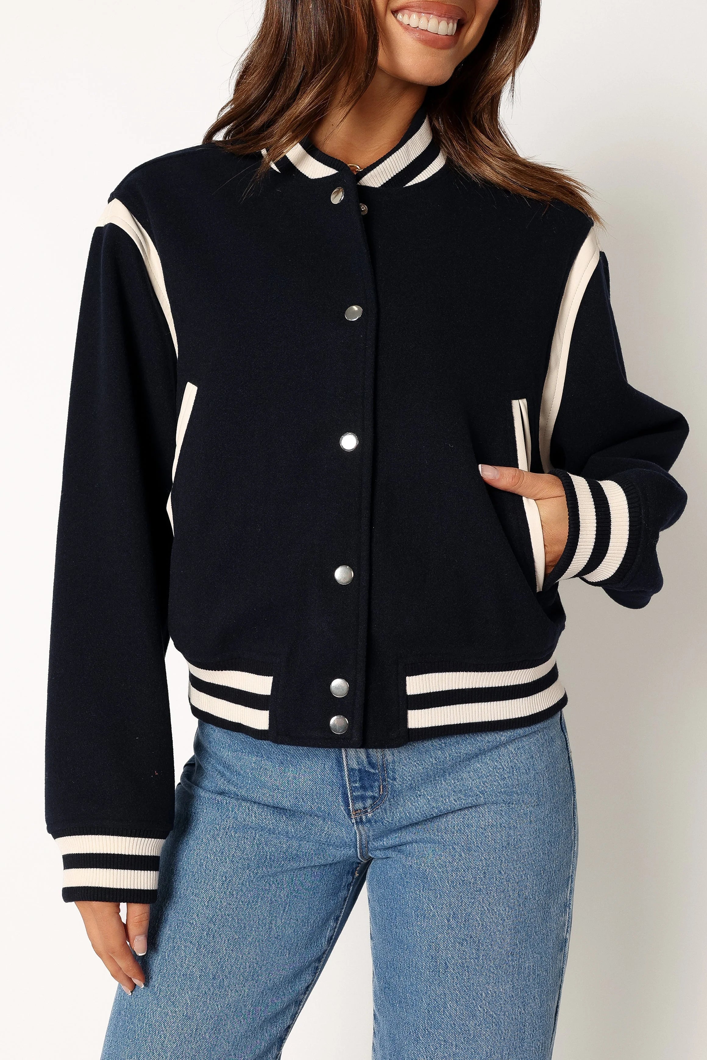 DETAILS Welcome to the latest fashion trend - Bomber Jackets! These trendy and playful jackets have a baseball collar, long sleeves with ribbed cuffs, functional press stud closure down front, and functional pockets on both sides.