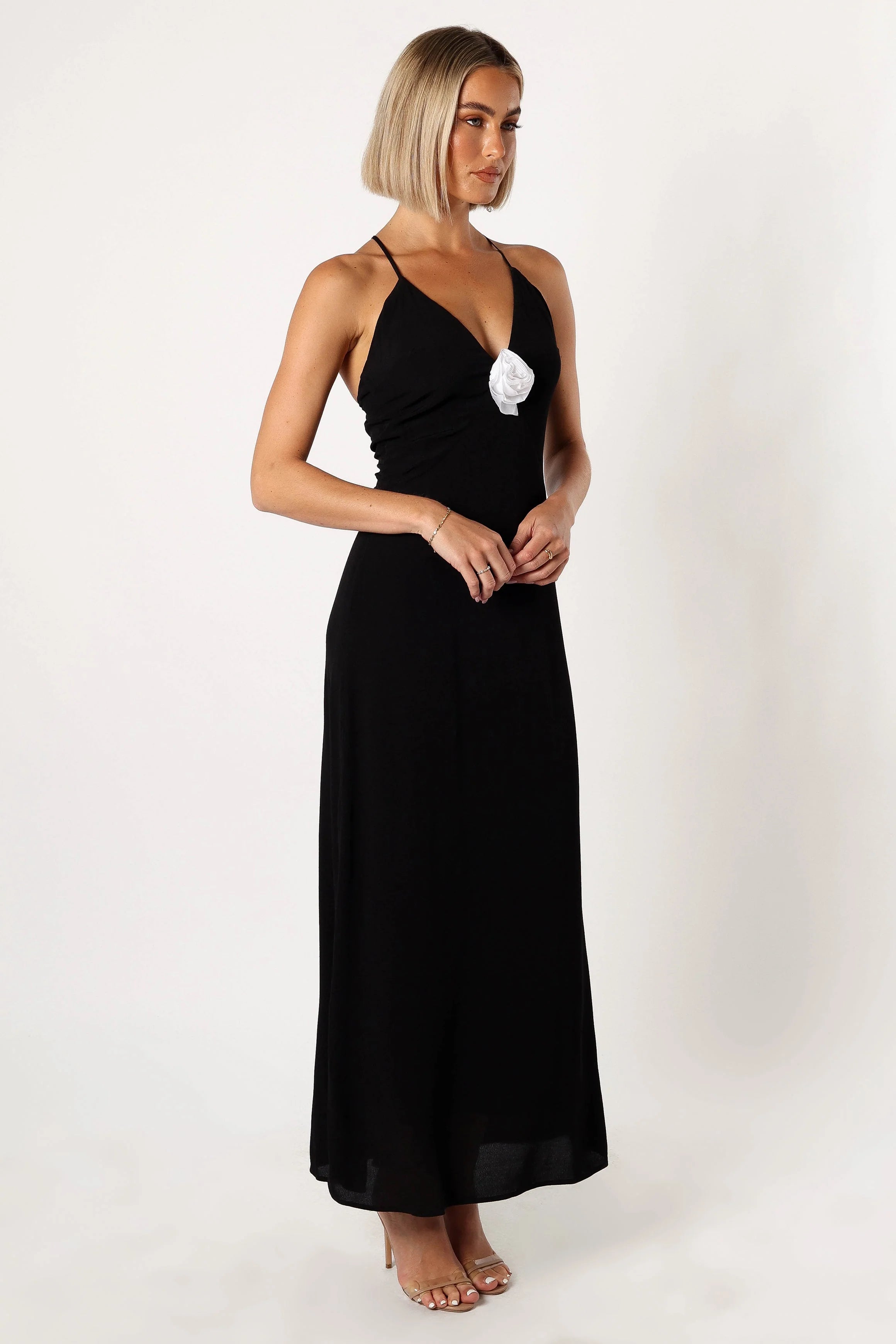 DETAILS This season, your wardrobe needs an update with this maxi length dress. With a v neckline an attached flower you'll feel like the trendiest girl on the block. Features thing adjustable cross over strap, an invisible side zip for convenience. Every time you slip into this playful yet fashion-forward style, you'll be sure to stand out from the crowd