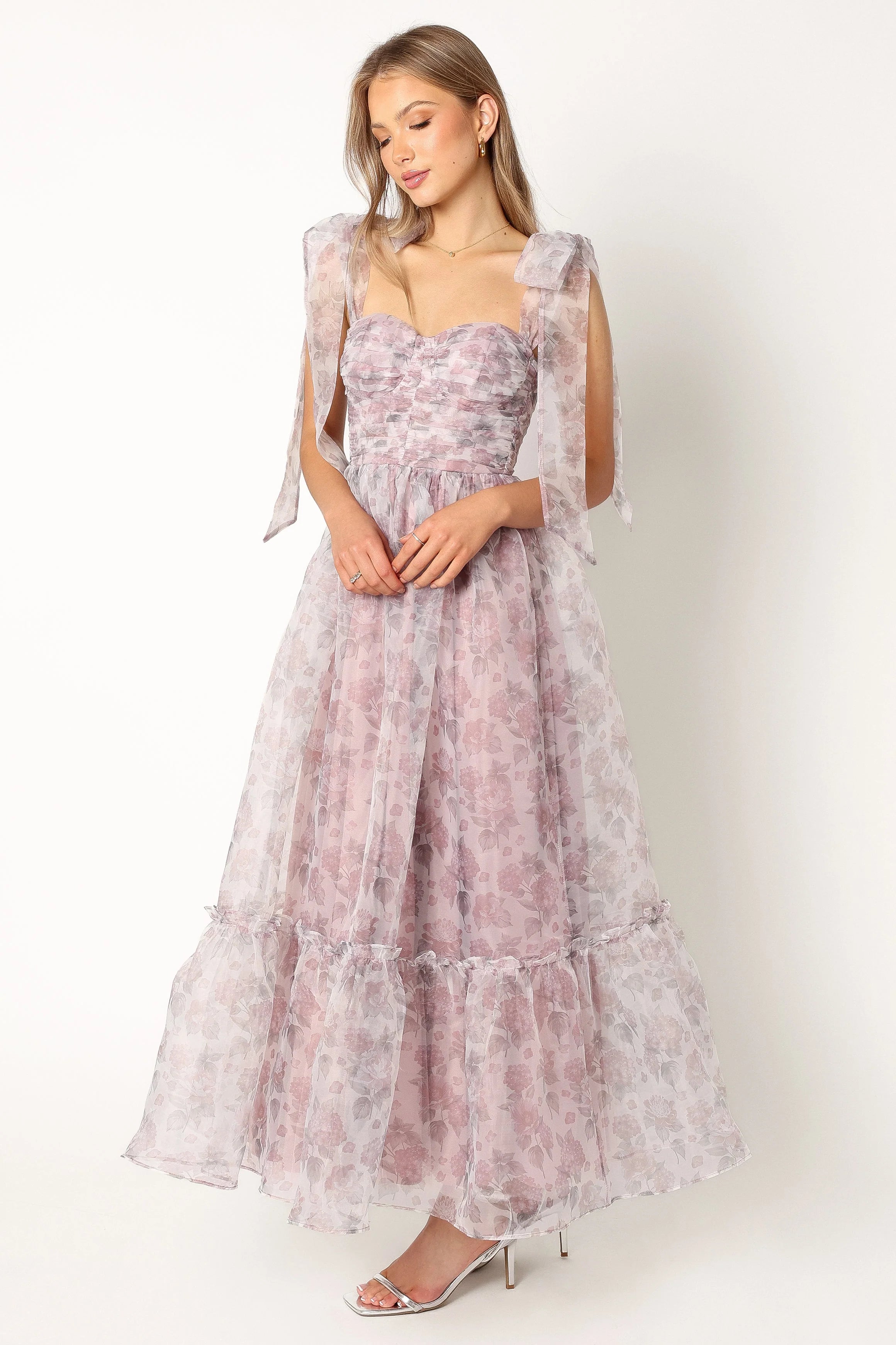 DETAILS Make a statement in this dreamy dress! This midi dress features a sweetheart neckline, tie close shoulder straps, and padded cups in the bust for extra support and to top it all off, this dress is made with a purple floral chiffon overlay for an elegant touch. Perfect for any special occasion.