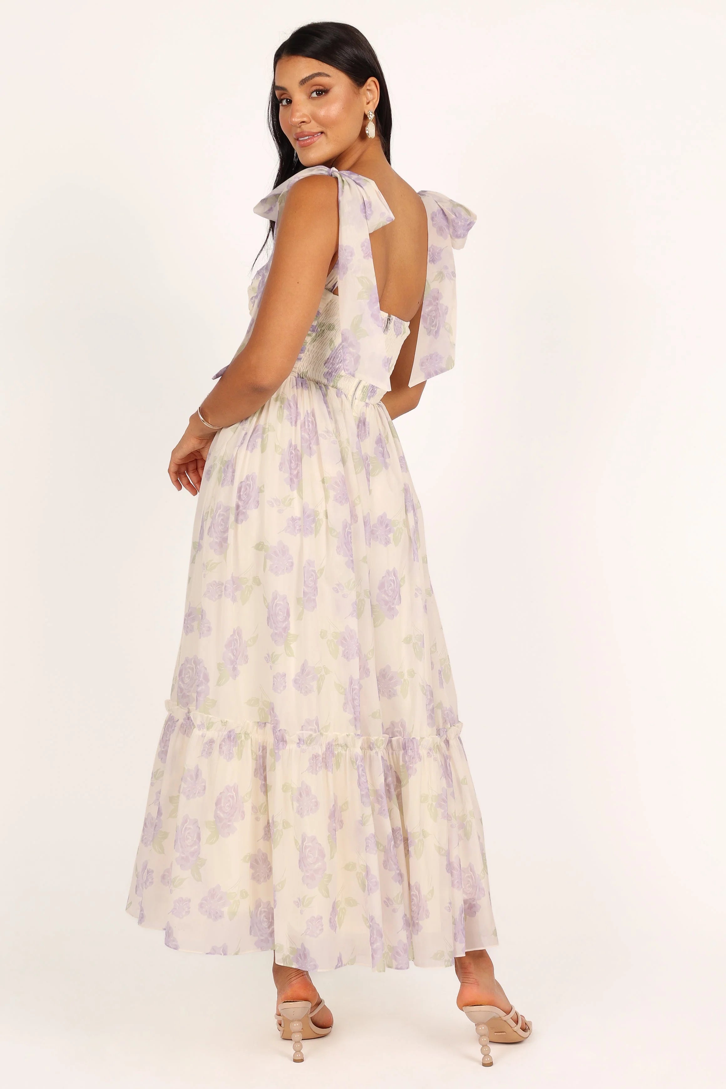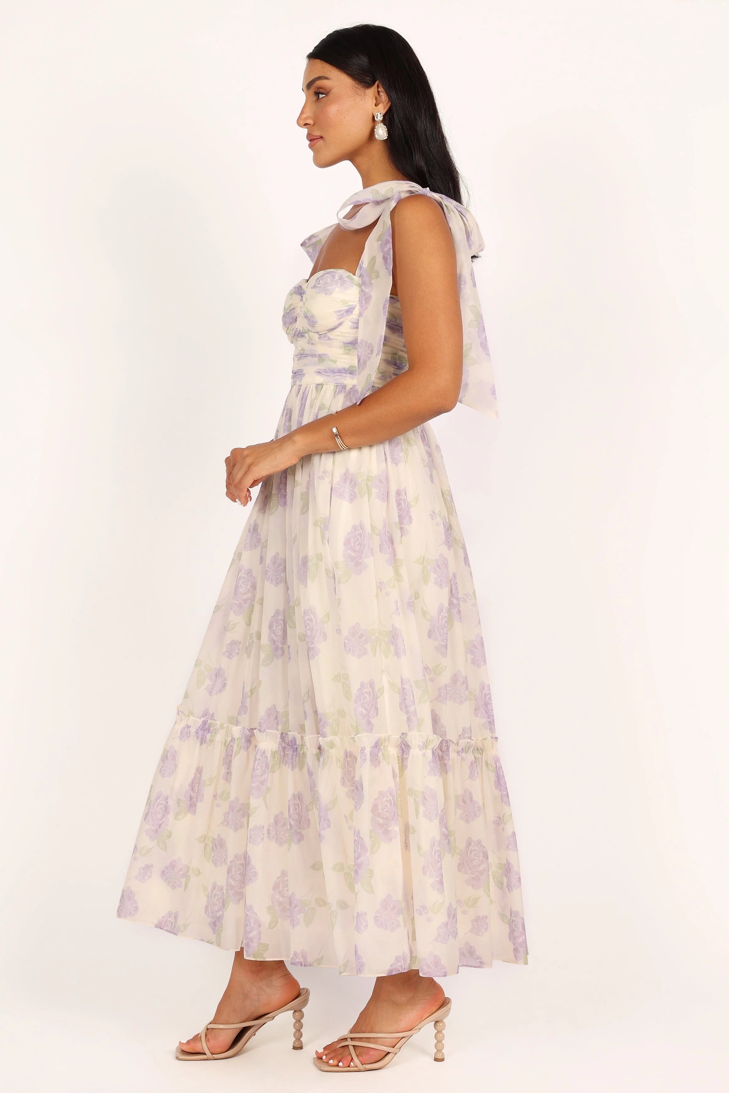 DETAILS Make a statement in this dreamy dress! This midi dress features a sweetheart neckline, tie close shoulder straps, and padded cups in the bust for extra support and to top it all off, this dress is made with a lavender floral chiffon overlay for an elegant touch. Perfect for any special occasion.
