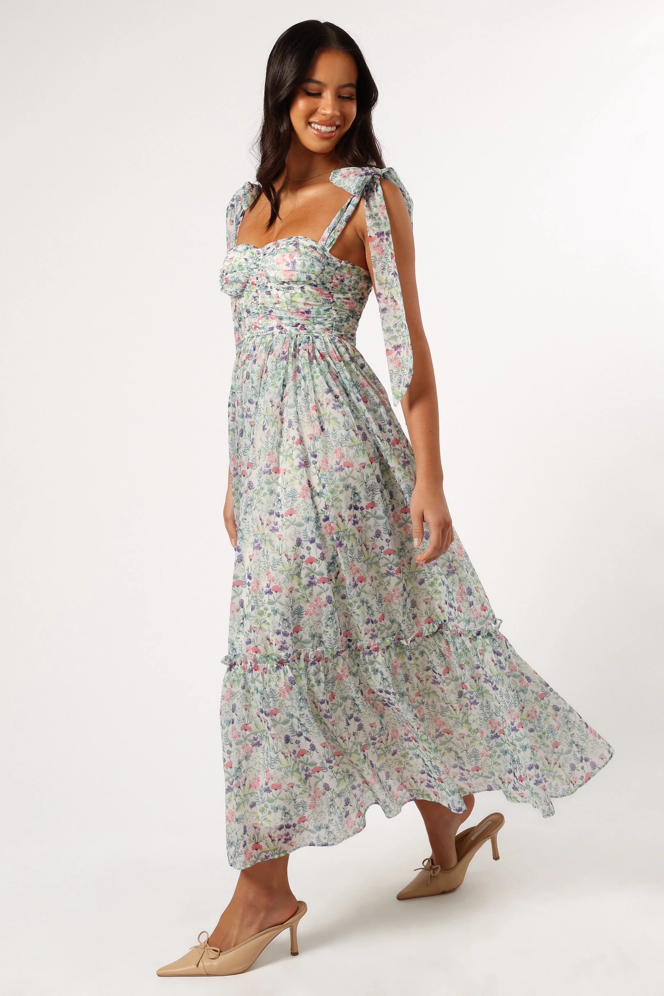 | DETAILS Make a statement in this dreamy dress! This midi dress features a sweetheart neckline, tie close shoulder straps, and padded cups in the bust for extra support and to top it all off, this dress is made with a blue floral chiffon overlay for an elegant touch. Perfect for any special occasion.