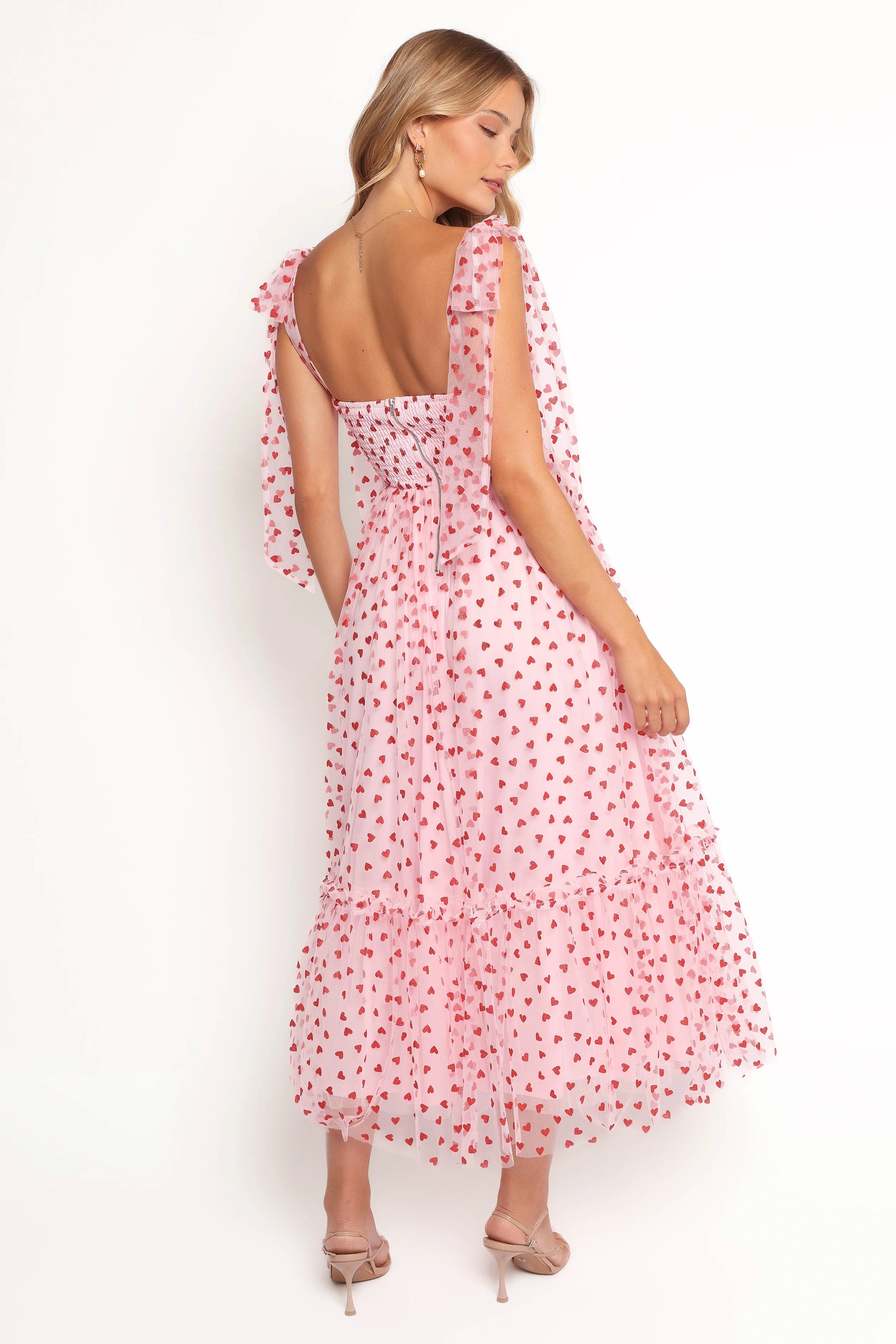 DETAILS Make a statement in this dreamy dress! This midi dress features a sweetheart neckline, tie close shoulder straps, and padded cups in the bust for extra support and to top it all off, this dress is made with a chiffon overlay for an elegant touch. Perfect for any special occasion.