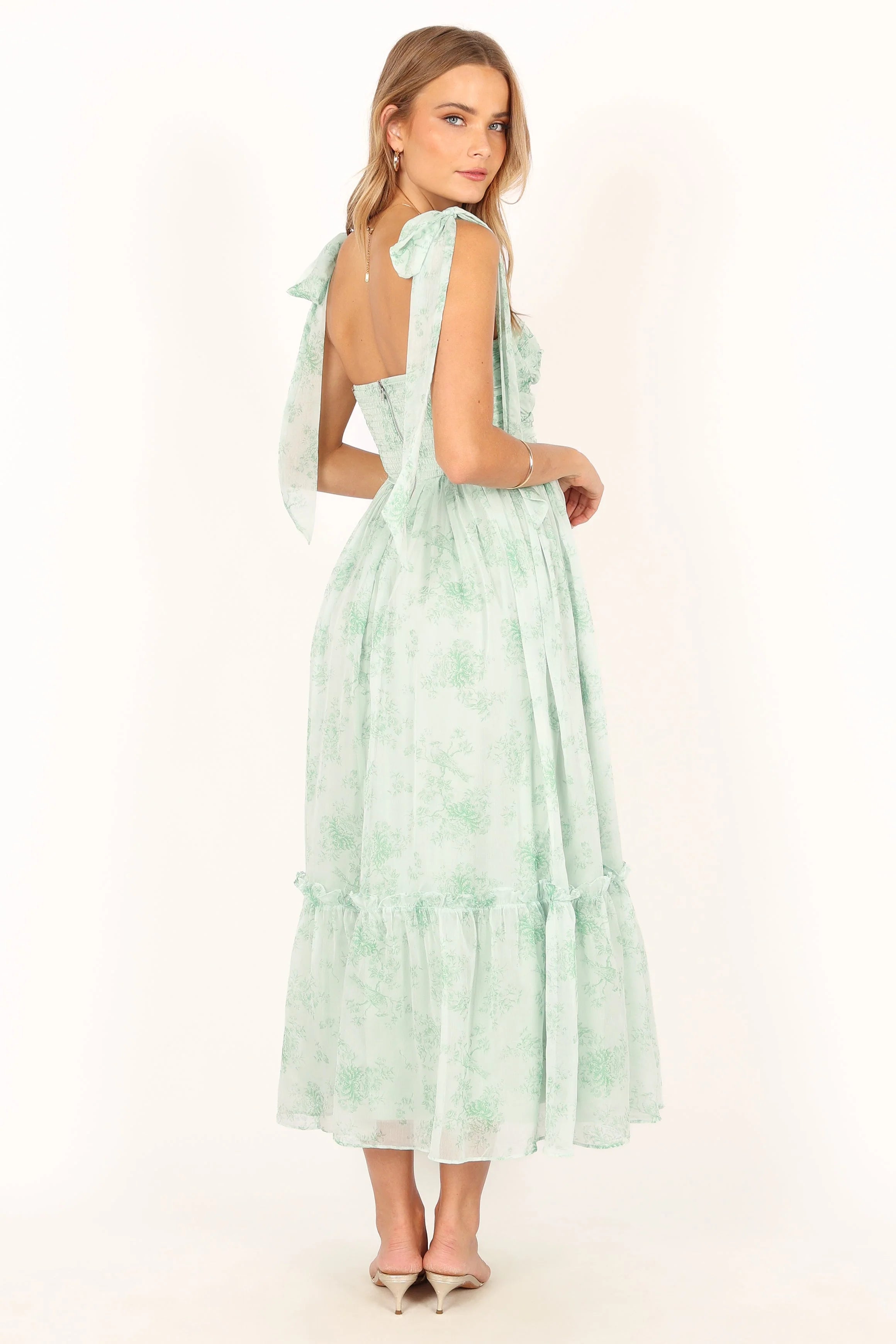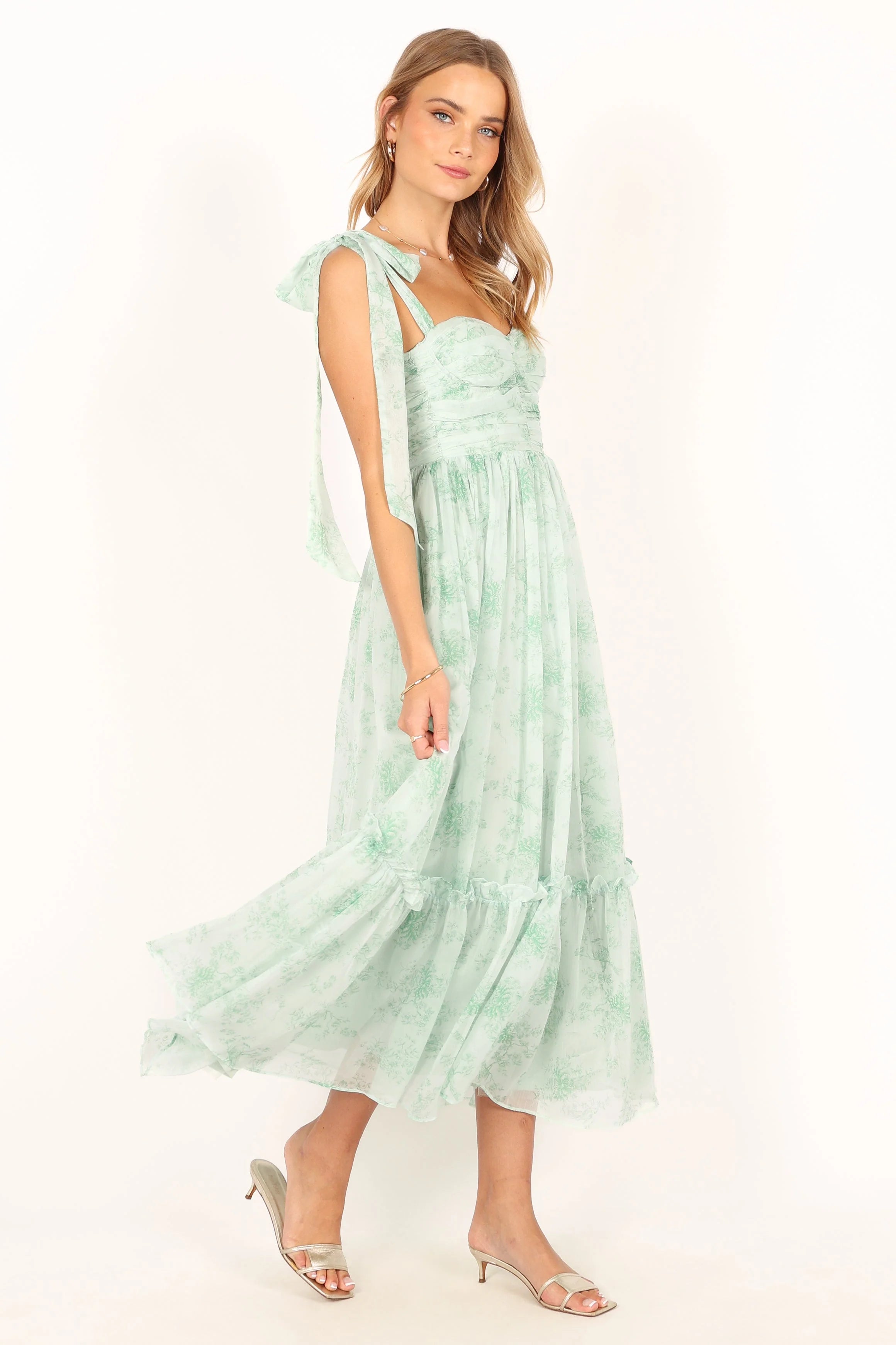 DETAILS Make a statement in this dreamy dress! This midi dress features a sweetheart neckline, tie close shoulder straps, and padded cups in the bust for extra support and to top it all off, this dress is made with a sage floral chiffon overlay for an elegant touch. Perfect for any special occasion.