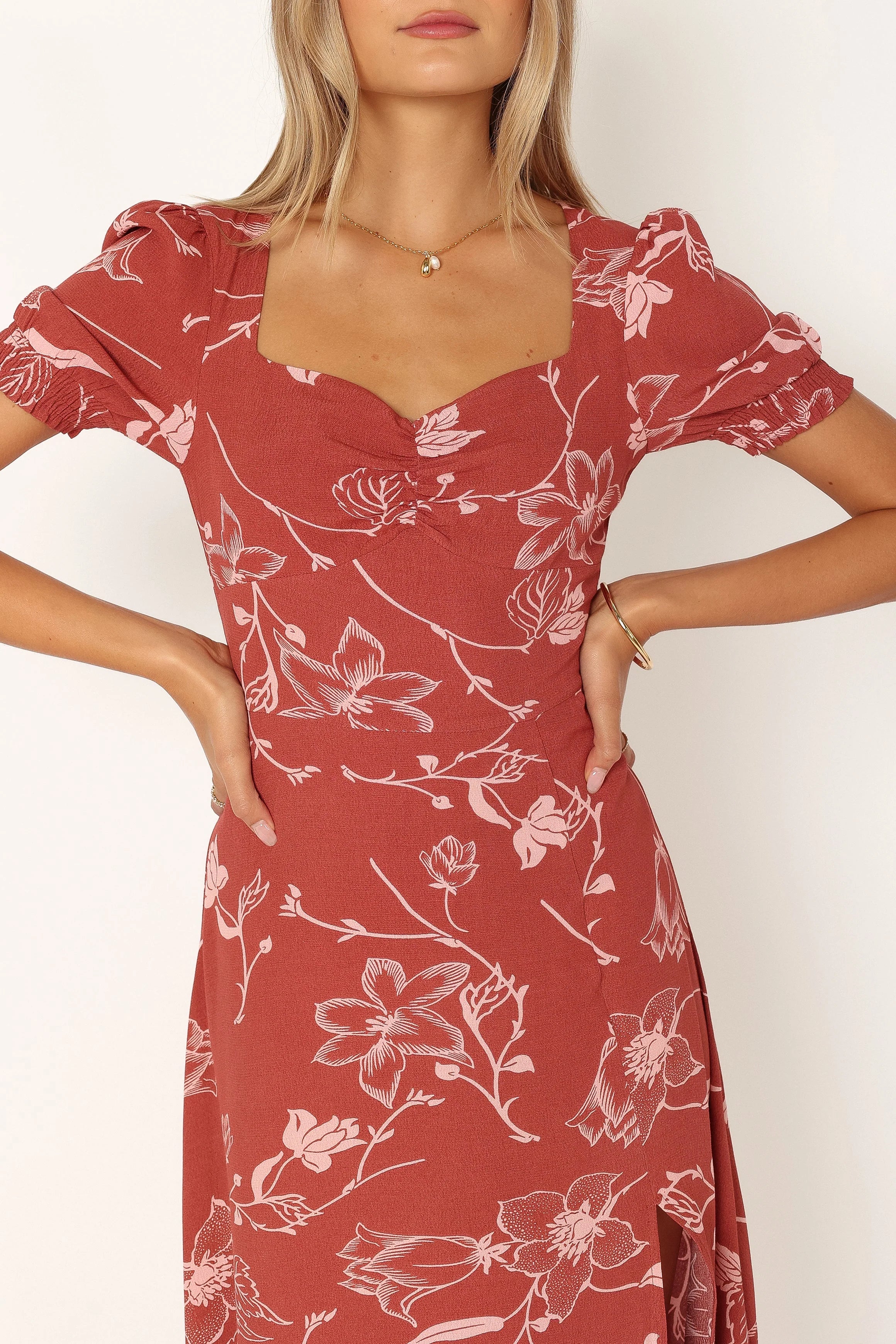 | DETAILS This midi dress is a timeless classic with its shirred cuffs and round neckline. The ruched bust detailing adds an elegant touch, while the front split gives you a bit of extra movement for maximum comfort.