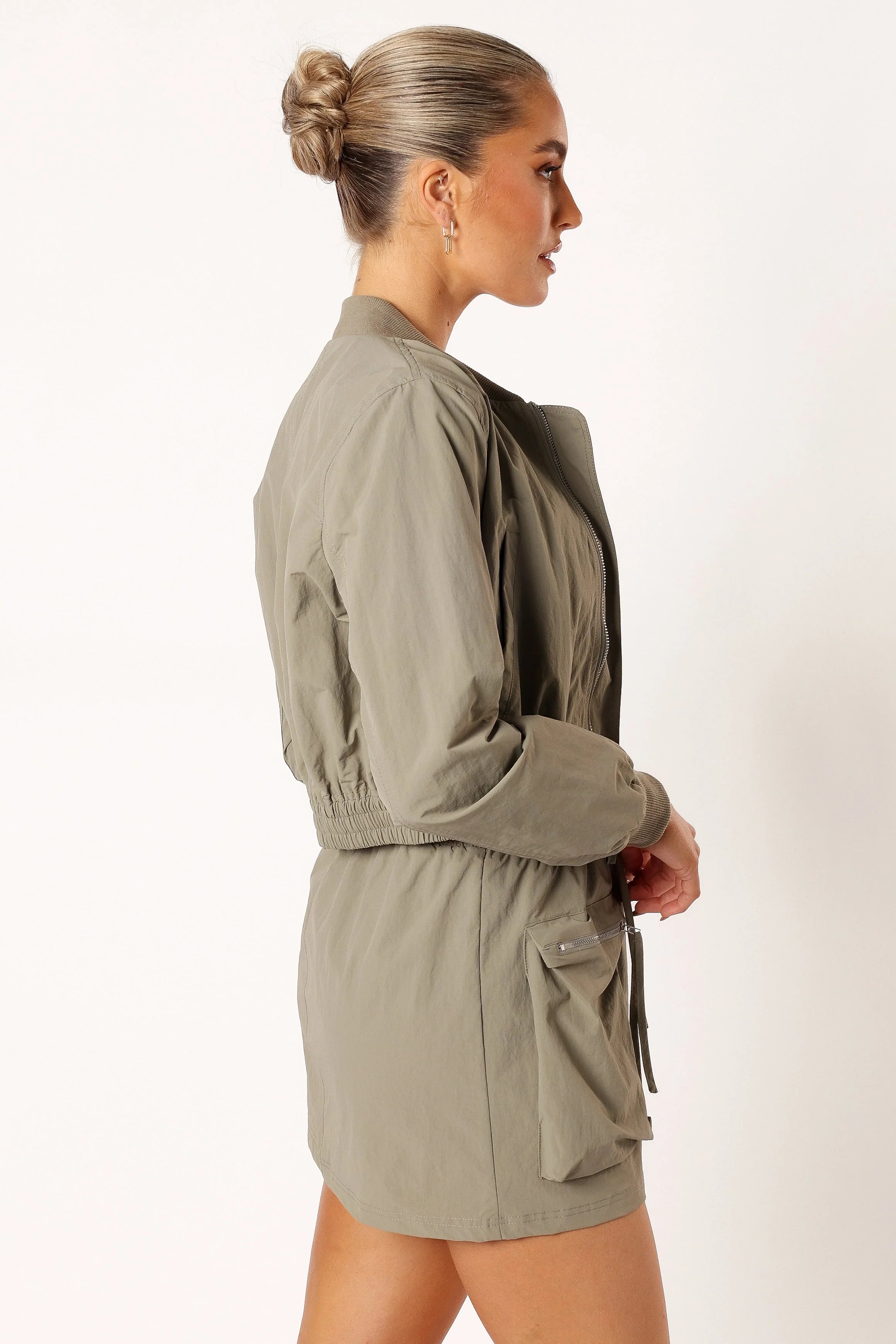 DETAILS The Freddie Two Piece Set is the ultimate in casual, yet trendy fashion. This light olive jacket and skirt set is perfect for any occasion, from a day out with friends to a weekend getaway. Featuring a crewneck collar jacket, this two piece set offers both comfort and style. The high waisted skirt is both flattering and comfortable, and the elasticised waist band ensures a perfect fit.