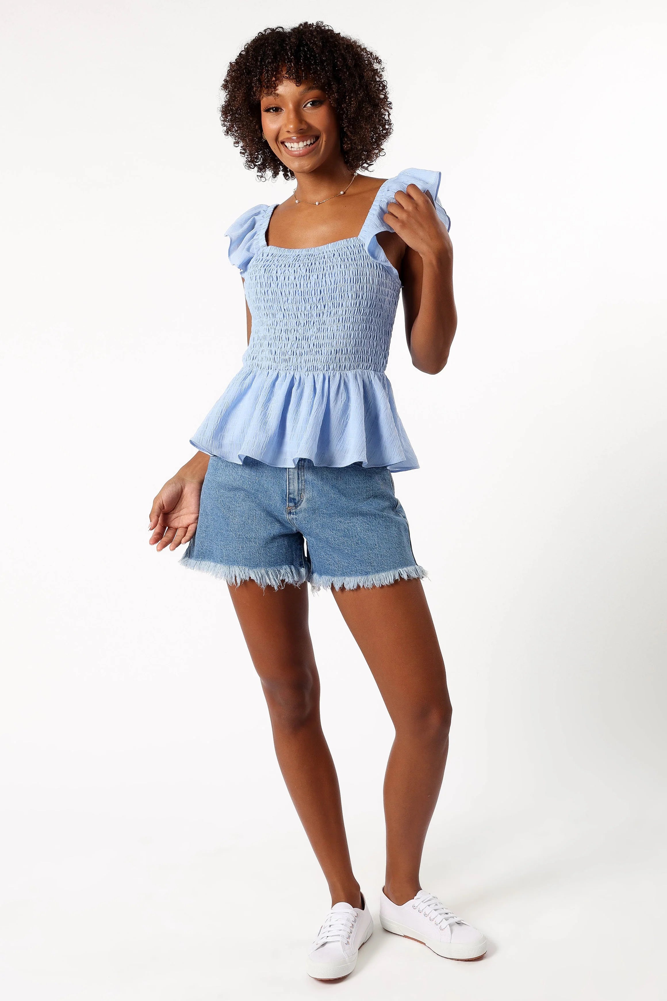 | DETAIL Designed with a harmonious blend of comfort and style, this blue cropped-length top is perfect for those who appreciate detail and a flattering fit. Your shoulders will be softly adorned with elasticised straps, each decorated with delicate ruffles that add a gentle flourish of charm to the overall aesthetic.