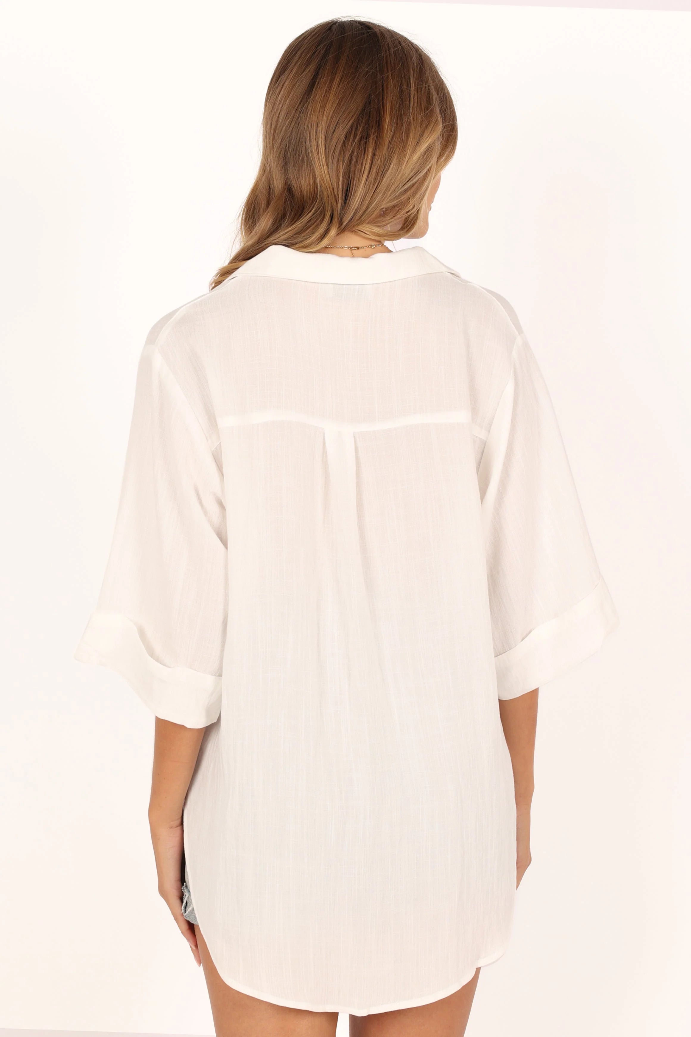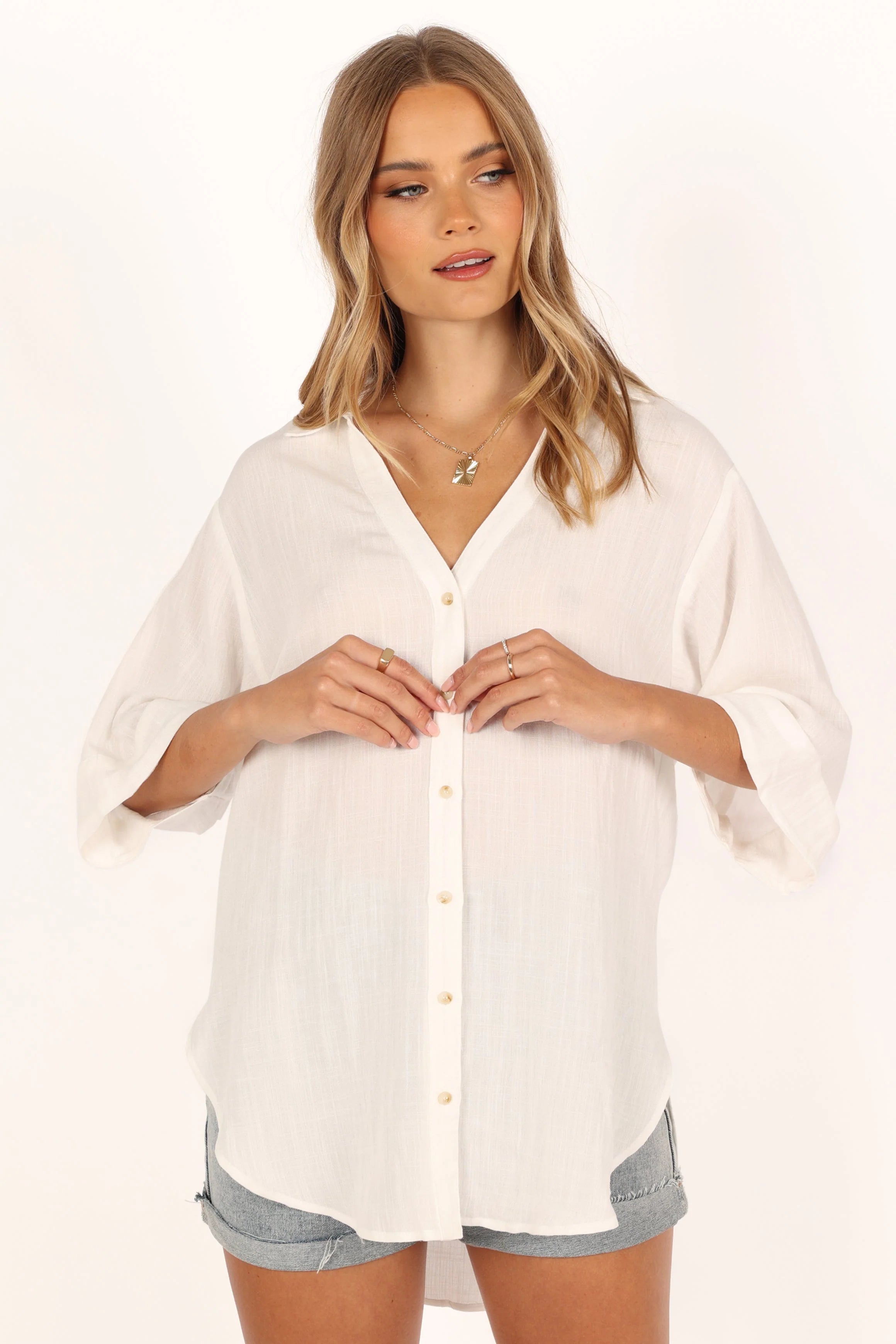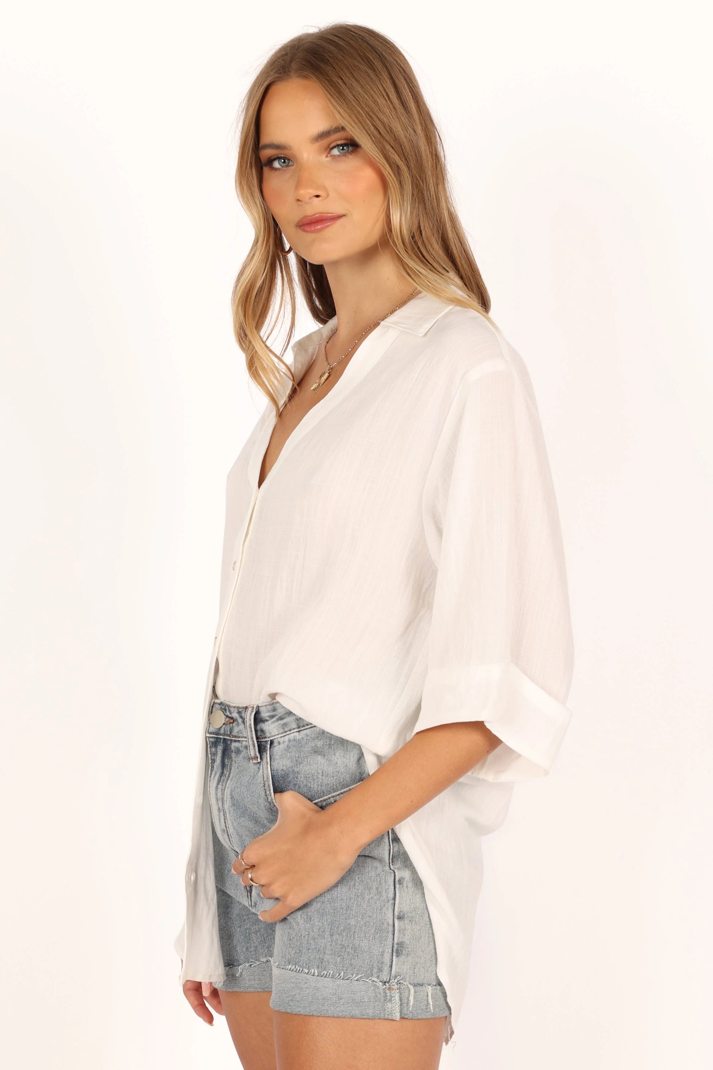 DETAILS This spread collar button-down shirt is an essential clothing item that exudes effortless style and versatility, perfect for vacation and summer wear. Designed with a flattering v-neckline and mid-length sleeves, this shirt features rolled hem cuffs which add a touch of sophistication to the overall silhouette.