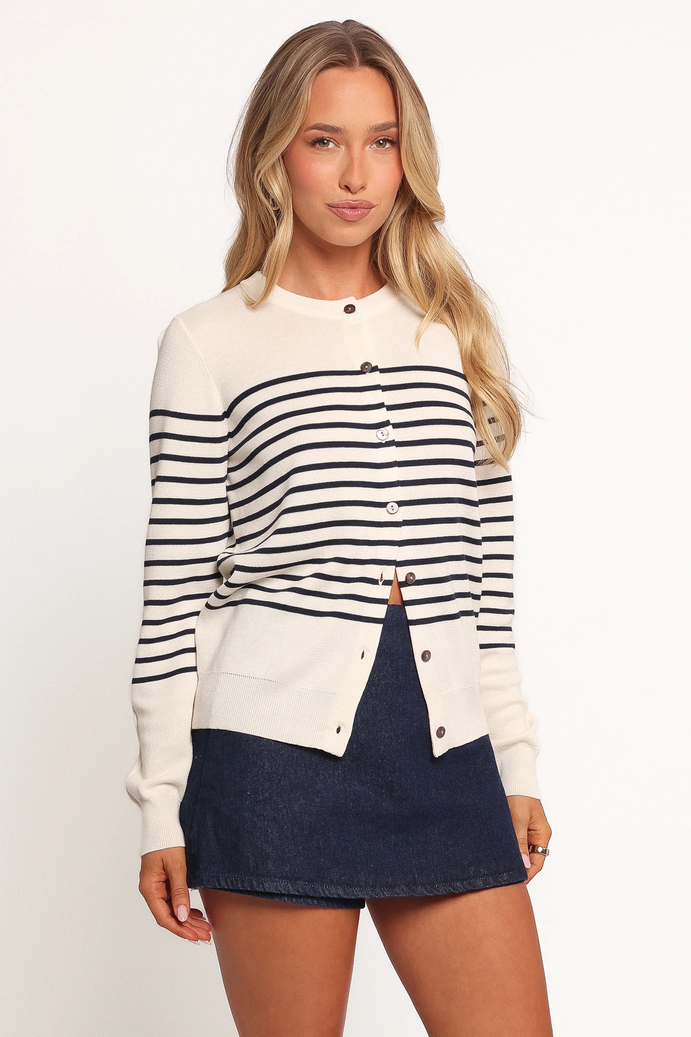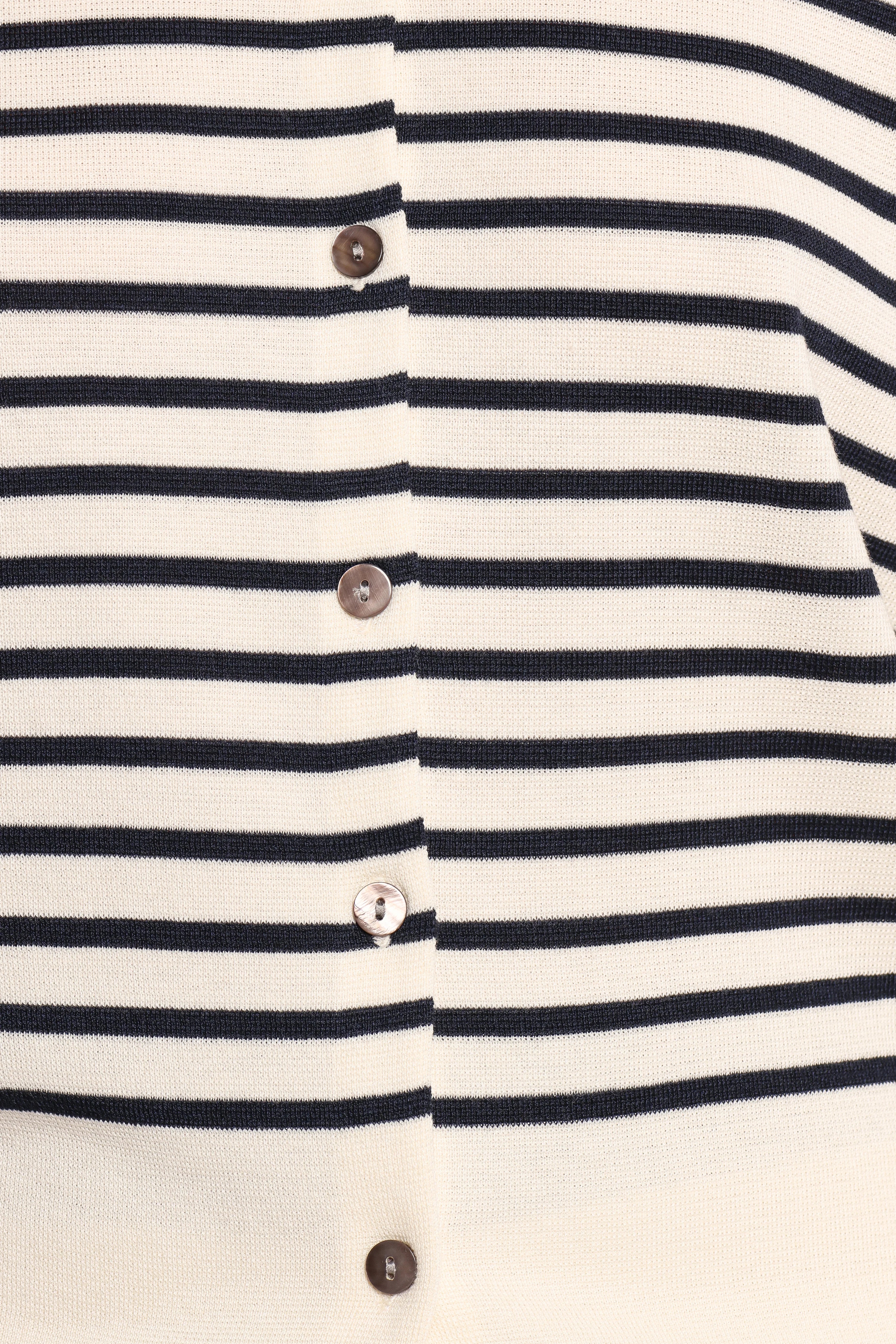 DETAILS Add an effortlessly chic touch to your wardrobe with the Gavi Button Front Striped Cardigan in Off White/Navy. Featuring a classic round neckline and long sleeves, this versatile piece blends timeless elegance with a modern stripe print design that pairs beautifully with any outfit.