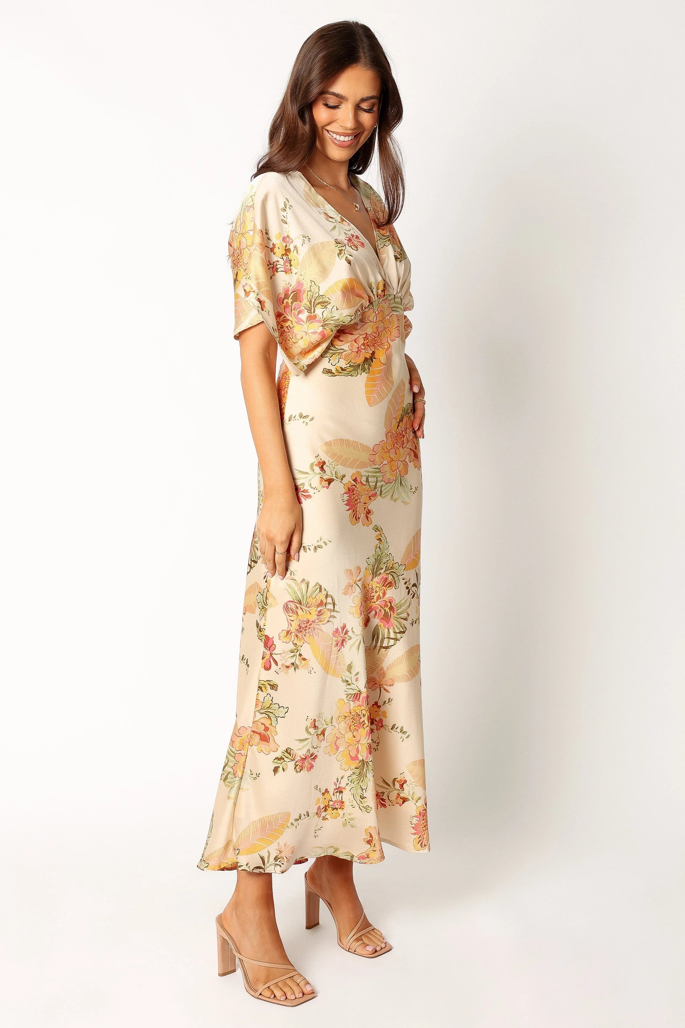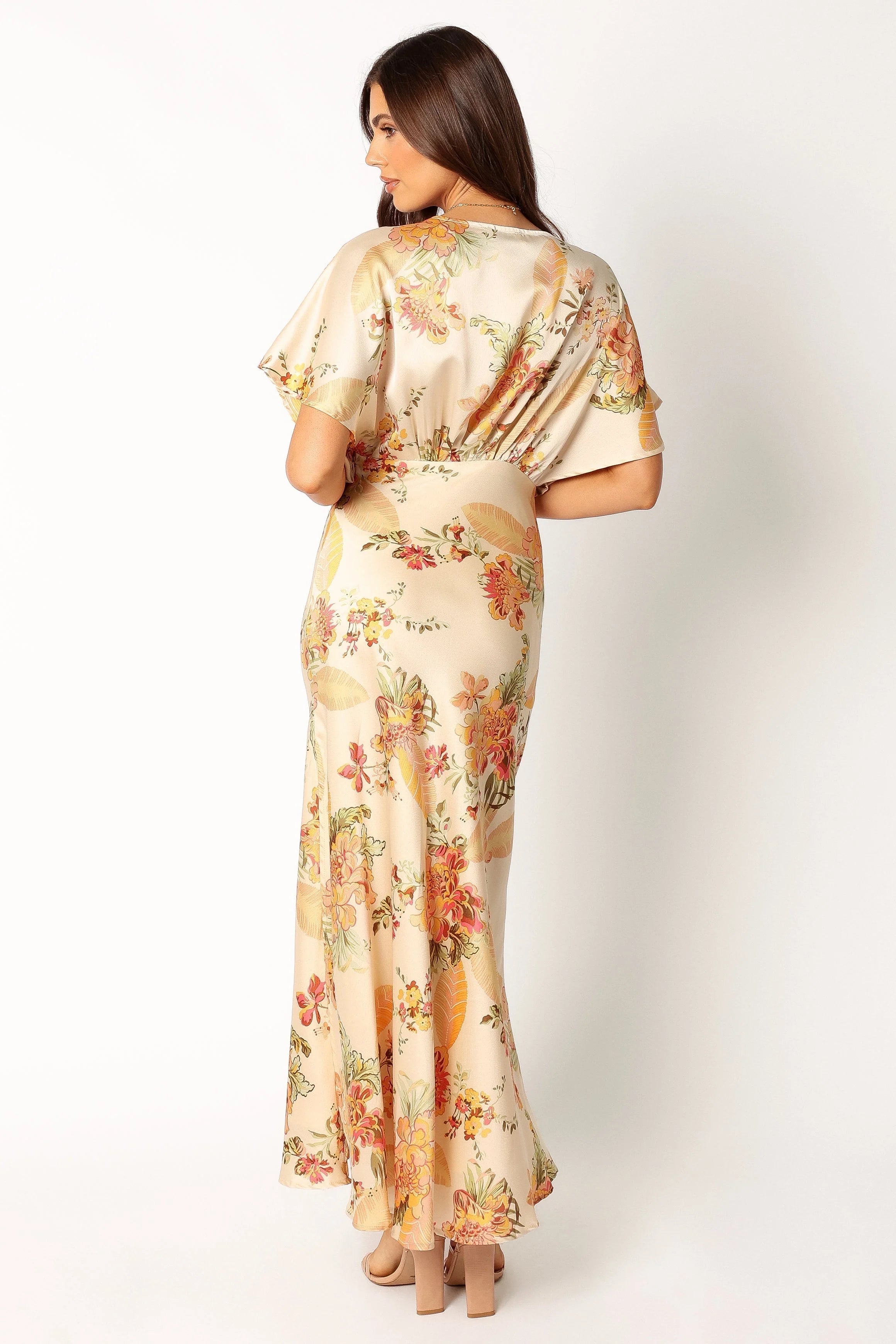 DETAILS This elegant maxi dress is perfect for any special occasion. Made from a soft satin-feel fabric, it features a V neckline and hook and eye closure. The short sleeves have gathered bust detail to create the perfect silhouette.