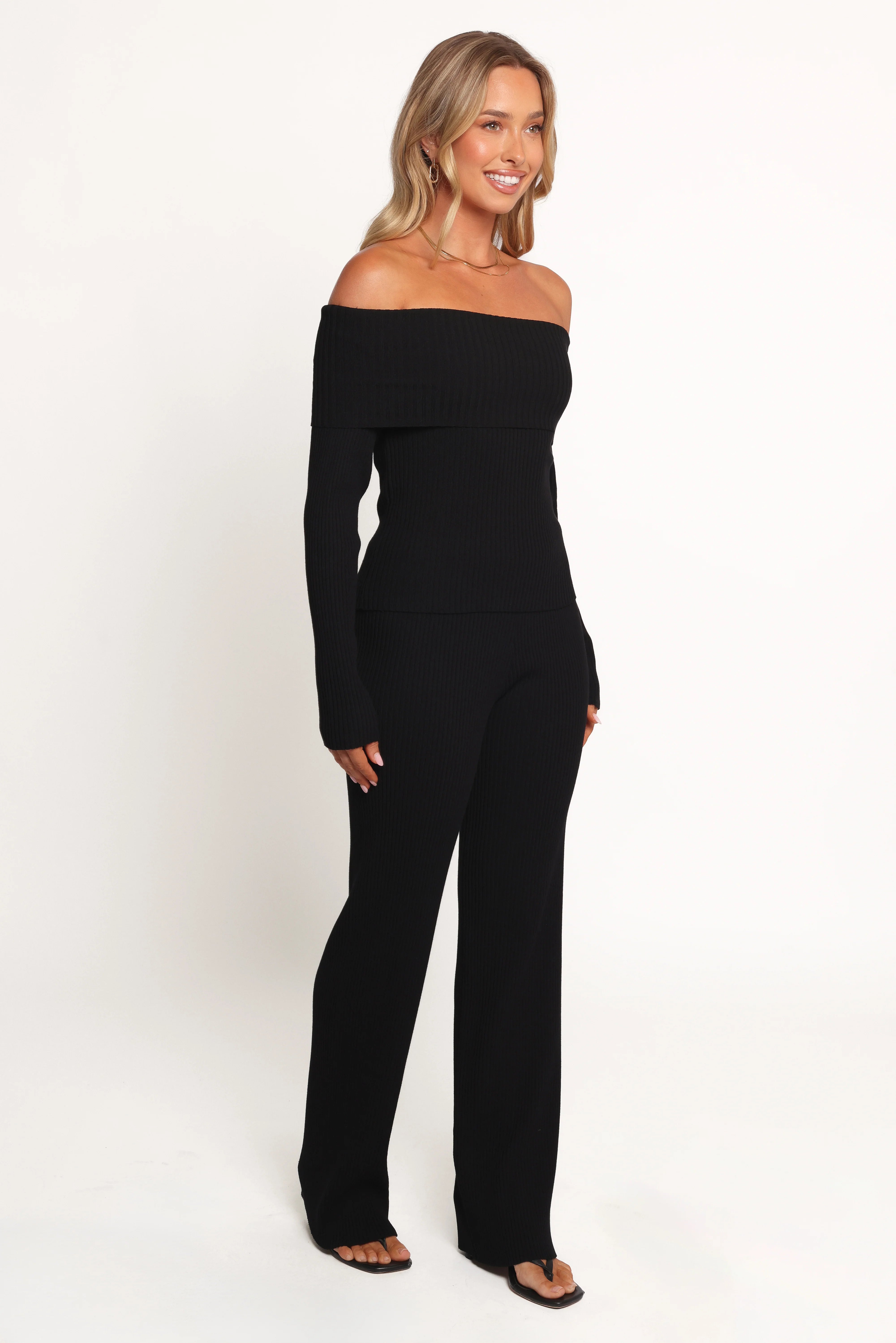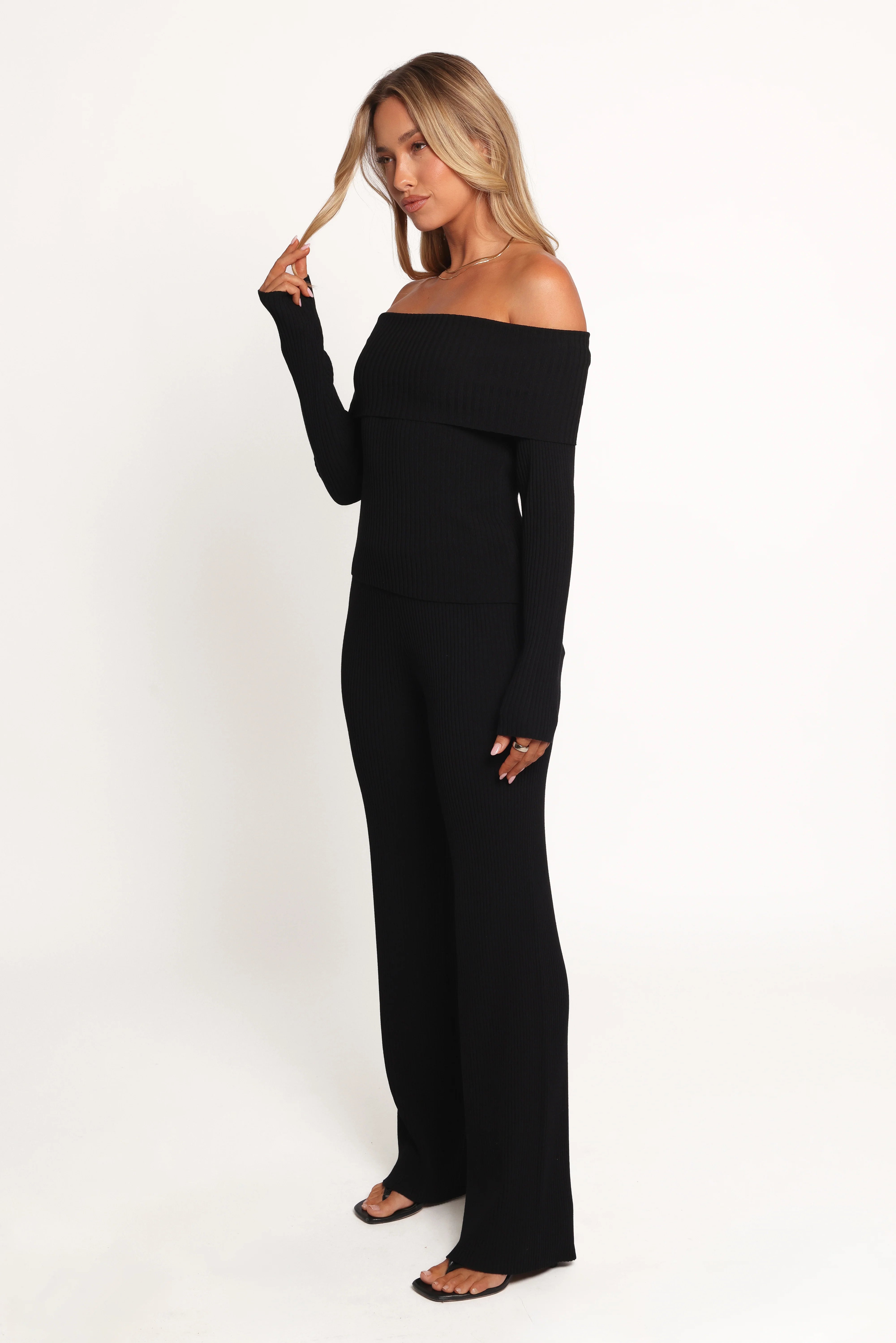 DETAILS This coordinated set features a trendy off-the-shoulder top with long sleeves, perfectly balanced with high-waisted pants designed for all-day ease. The elasticized waistband ensures a flattering fit, while the relaxed leg style keeps the vibe effortlessly cool.