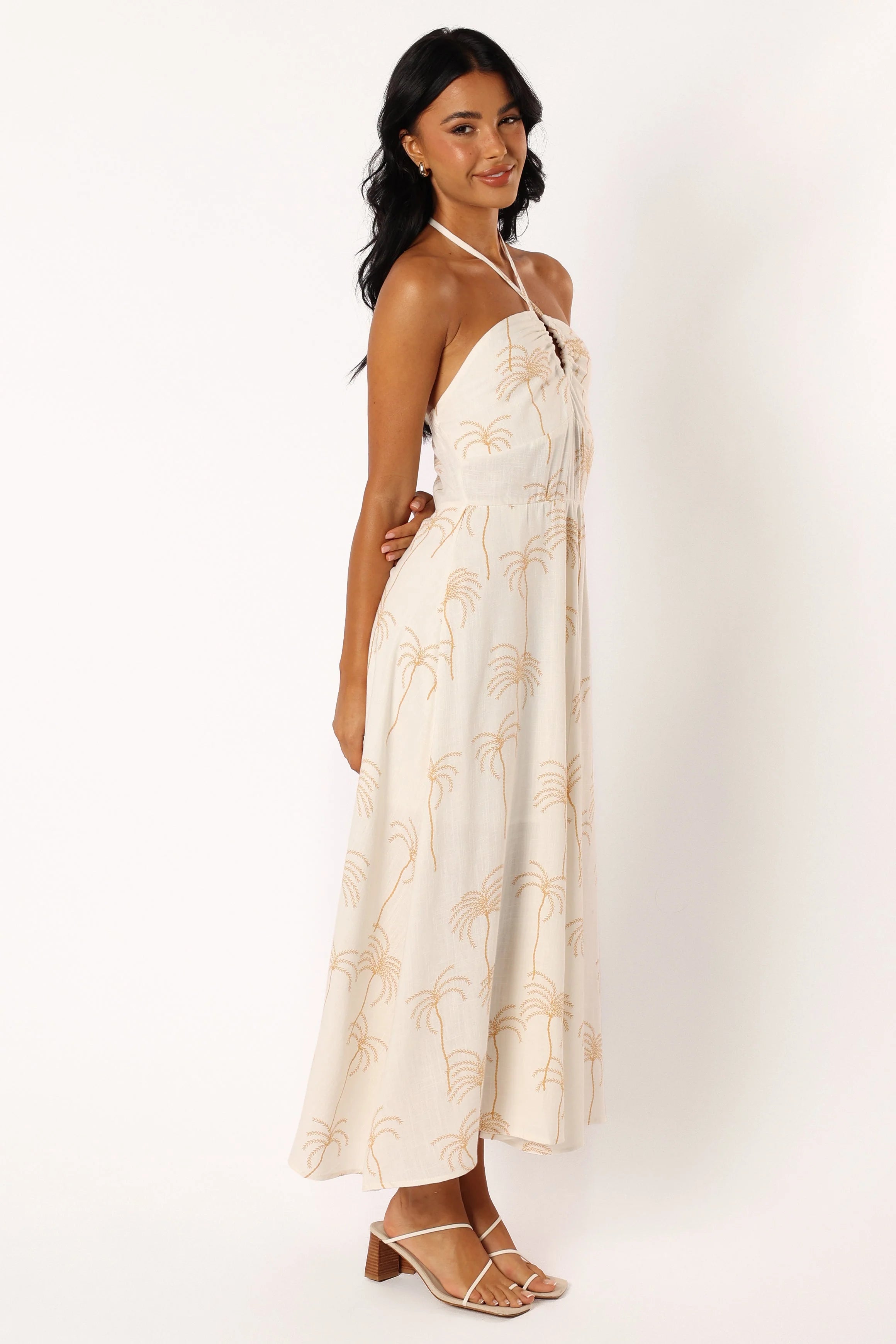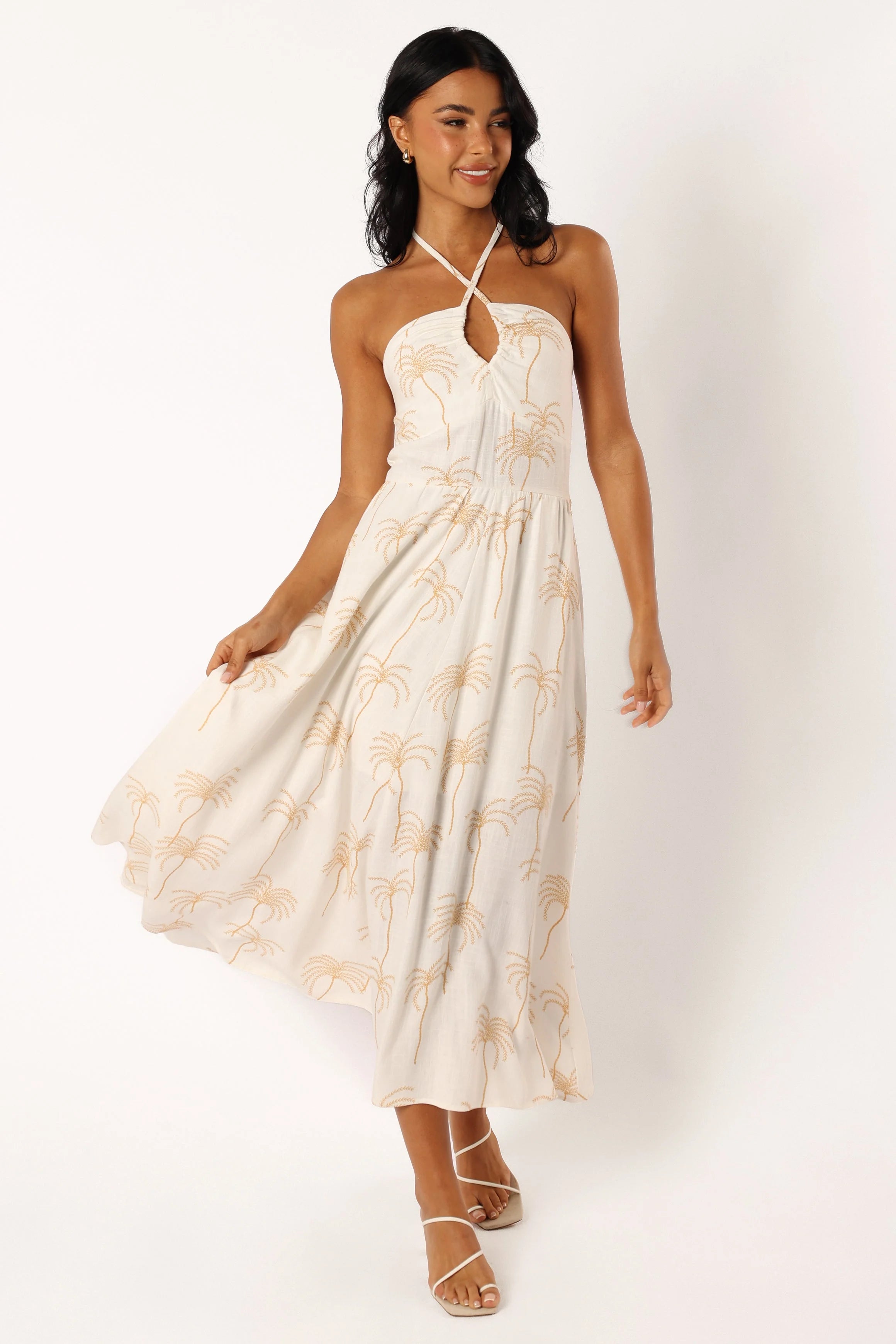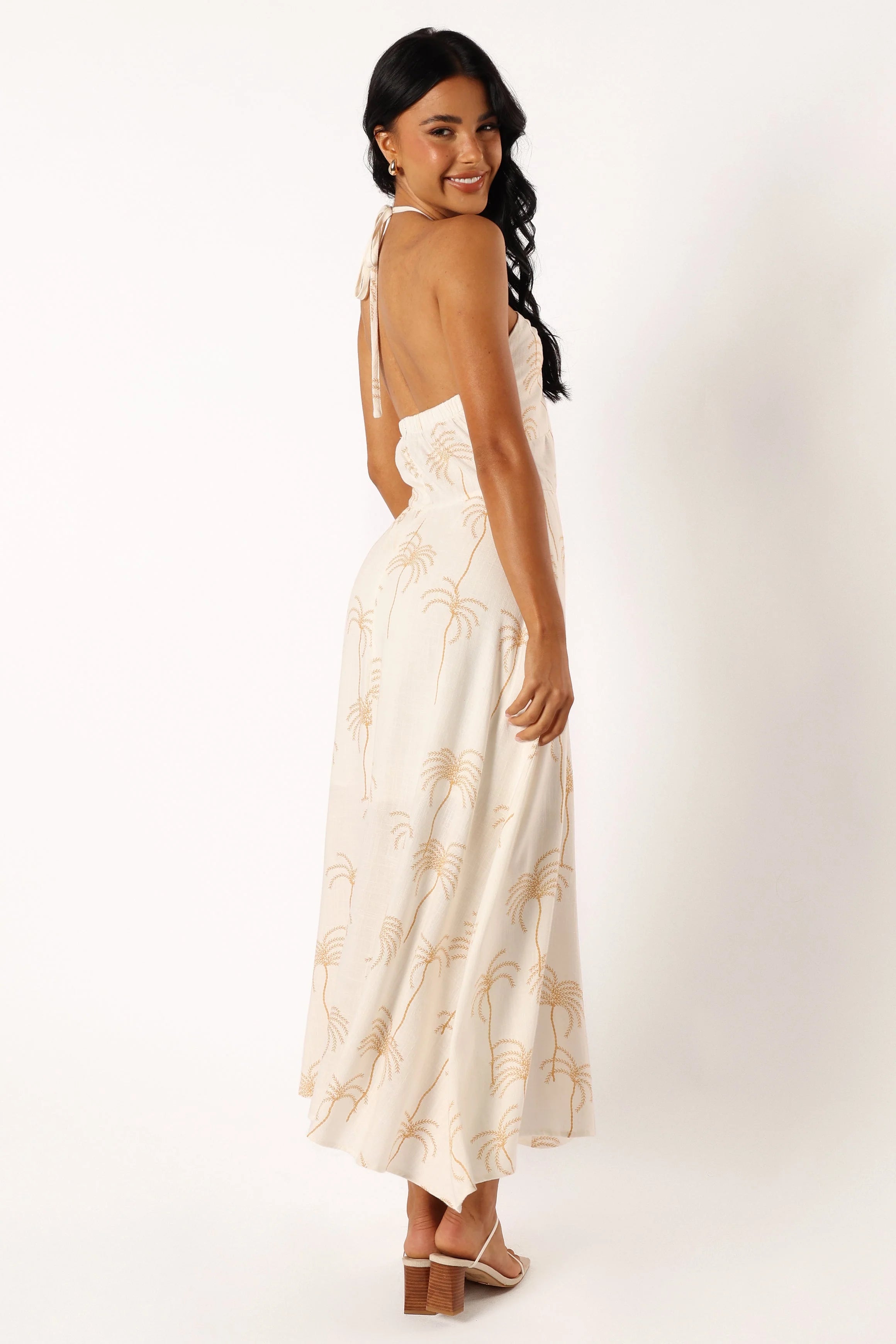 DETAILS Introducing the Granger Midi Dress - a playful and trendy piece that is perfect for making a fashion statement this summer season. Featuring a halter neckline with tie close, along with a v-neck detail, this sleeveless dress will ensure you stand out from the crowd.