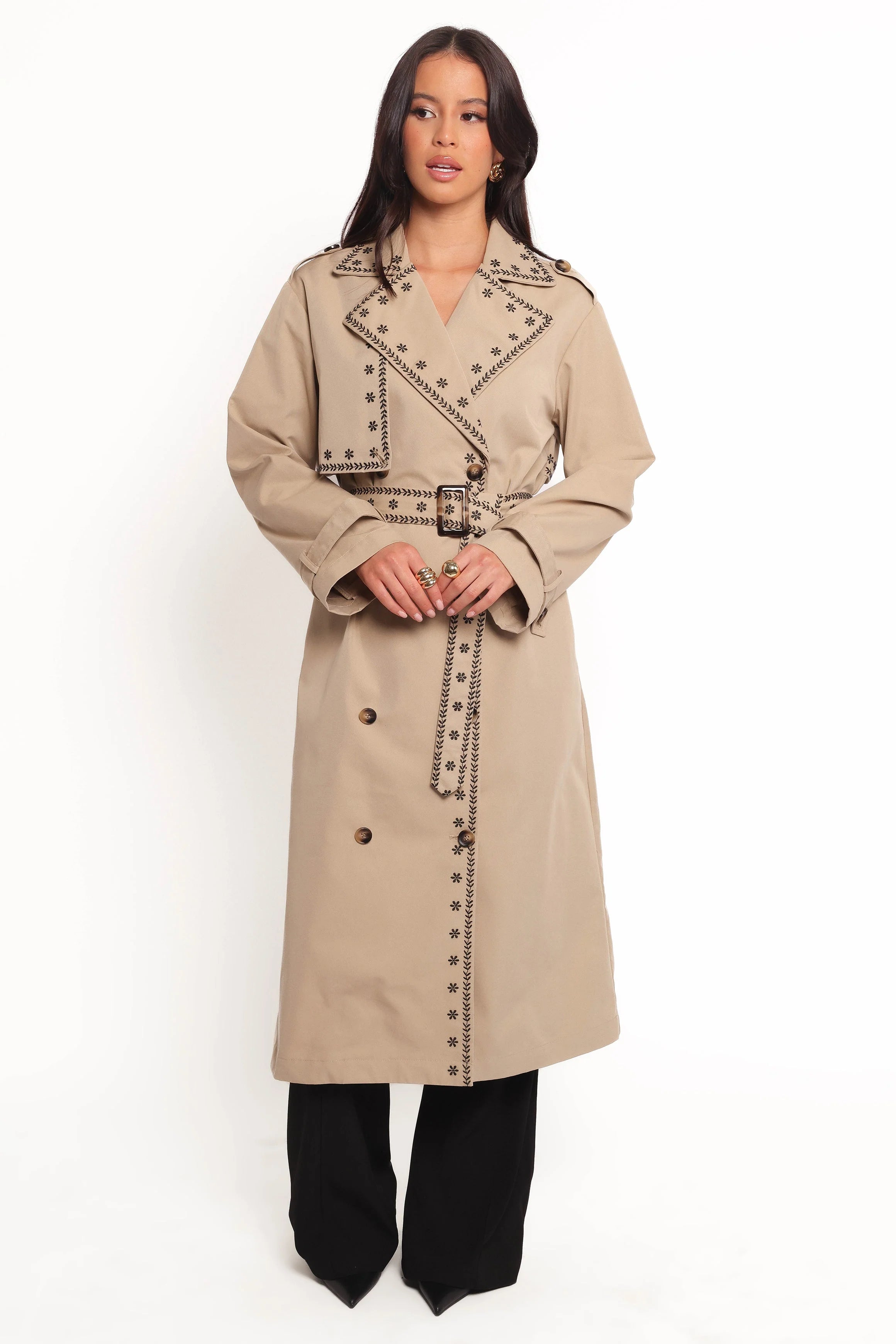 DETAILS This elegant coat features a classic notch lapel and long sleeves, lending a polished touch to any outfit. The double-breasted button closure ensures a snug fit, while the belt loops and detachable waist tie allow you to accentuate your silhouette effortlessly.