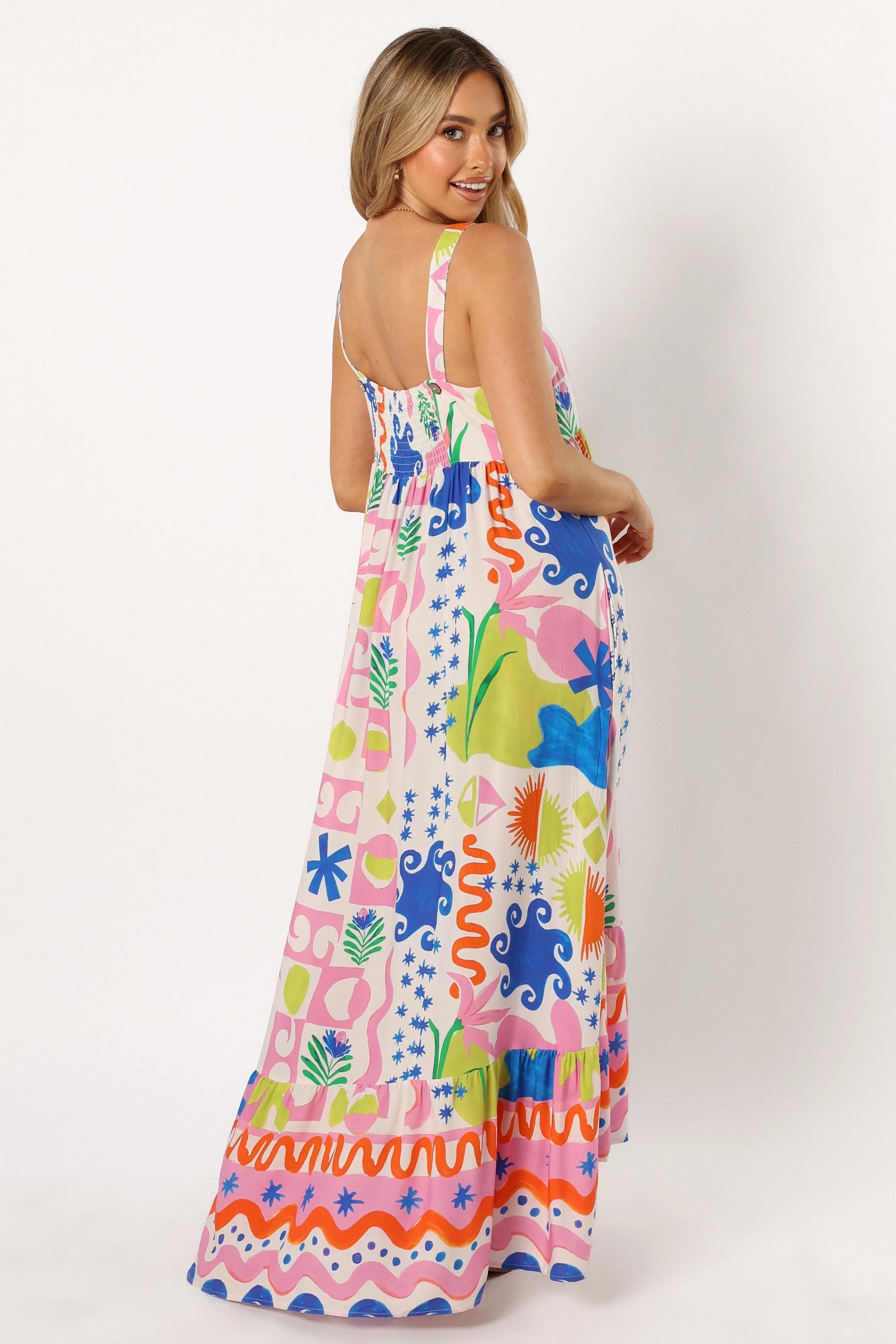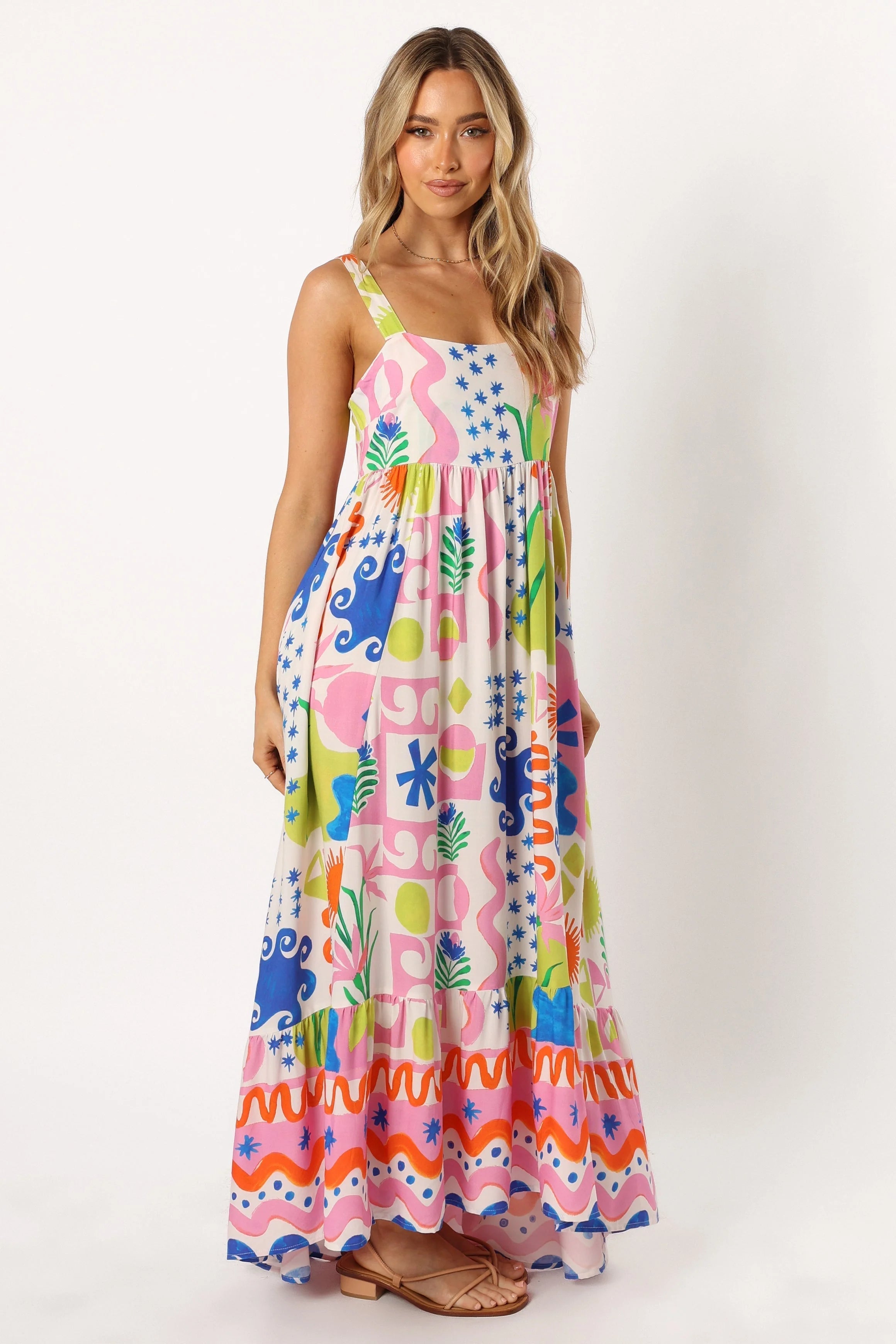 DETAILS Discover our enchanting maxi dress featuring a chic square neckline and sleeveless design, perfect for any occasion. Enjoy the comfort of a shirred back panel and easy pull-on style. Elevate your wardrobe with our beautiful abstract print dress today!
