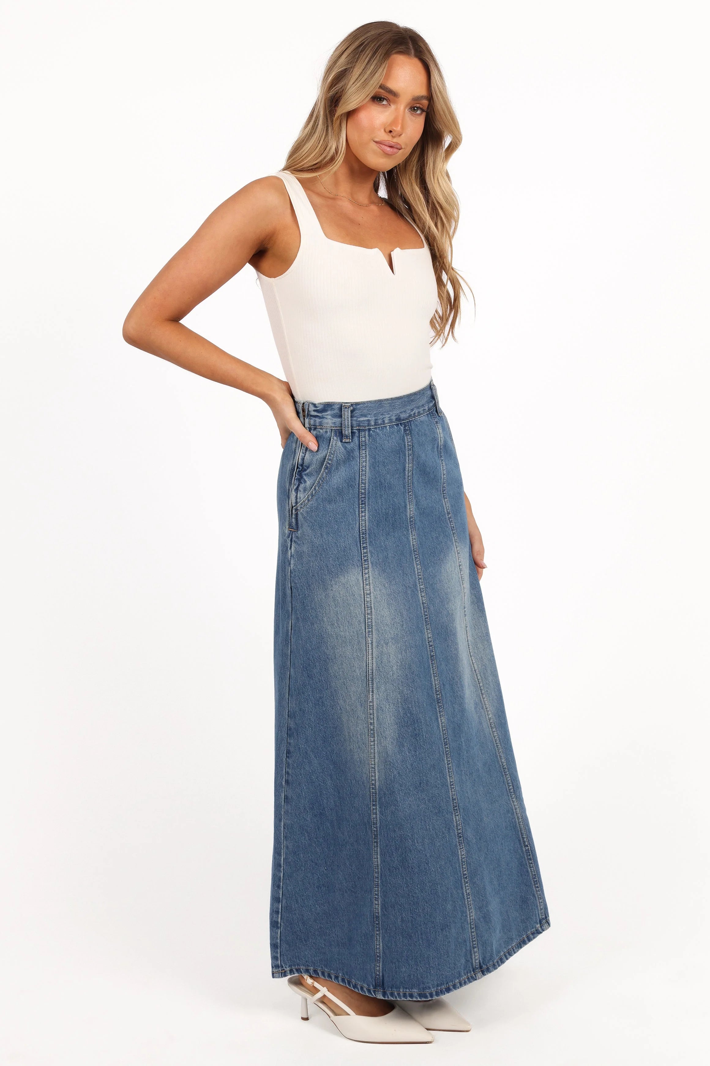 DETAILS Take your outfit game to the next level with the Gwen Denim Skirt in Mid Wash Denim. Designed with a flattering A-line silhouette, this maxi-length piece flows effortlessly for a chic yet laid-back vibe.