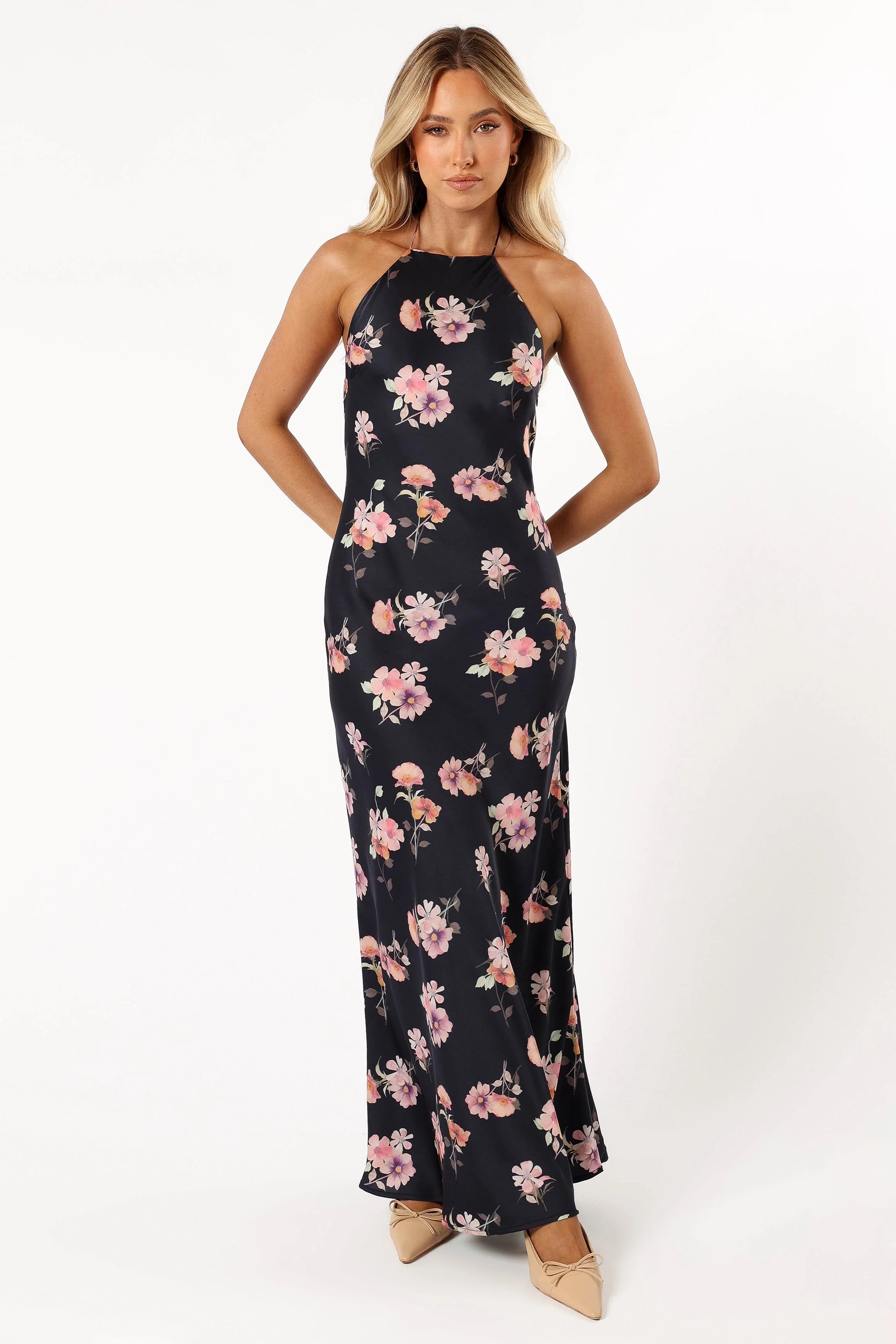 DETAILS Get ready to make heads turn in our stunning maxi-length dress, featuring a flirtatious halter tie neckline that just screams fun! Our dress boasts a functional back button down and easy slip-on design. And did we mention the soft satin feel that makes wearing it a dream