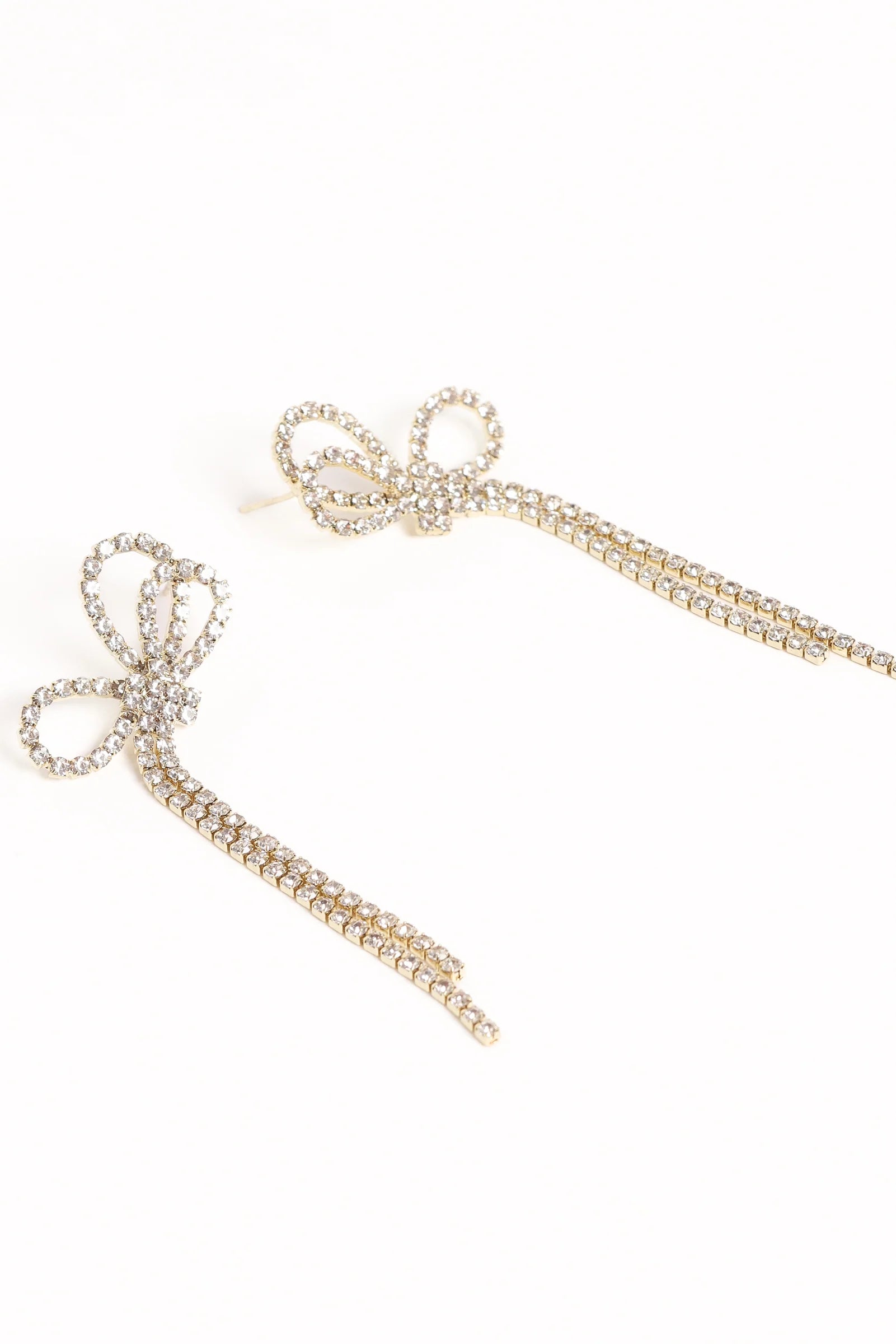 | DETAILS Elevate your look with the Harmony Earrings in Gold, the perfect blend of elegance and modern style. Featuring a captivating bow drop design adorned with delicate crystal details, these earrings are crafted to enhance any outfit with a touch of glamour.