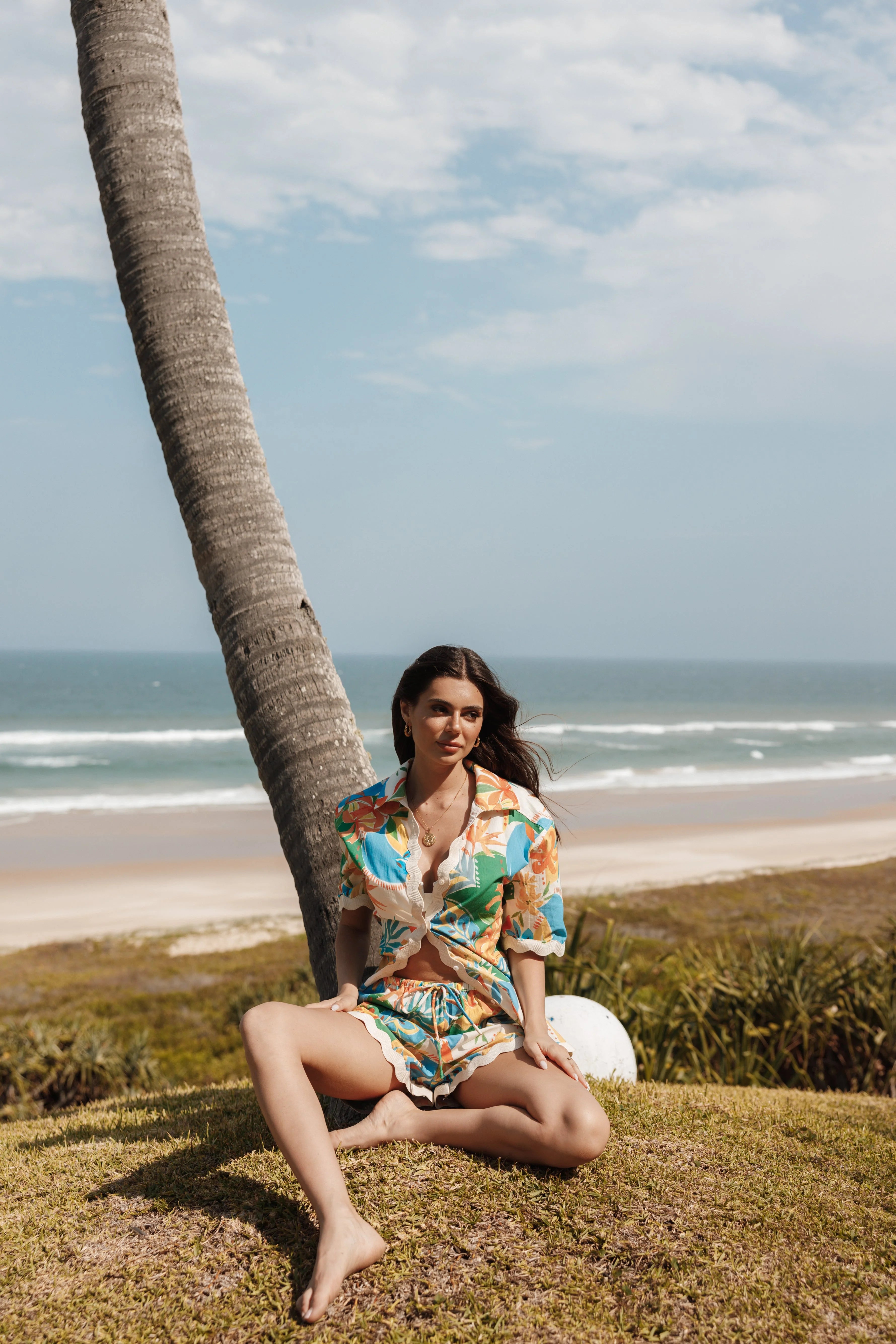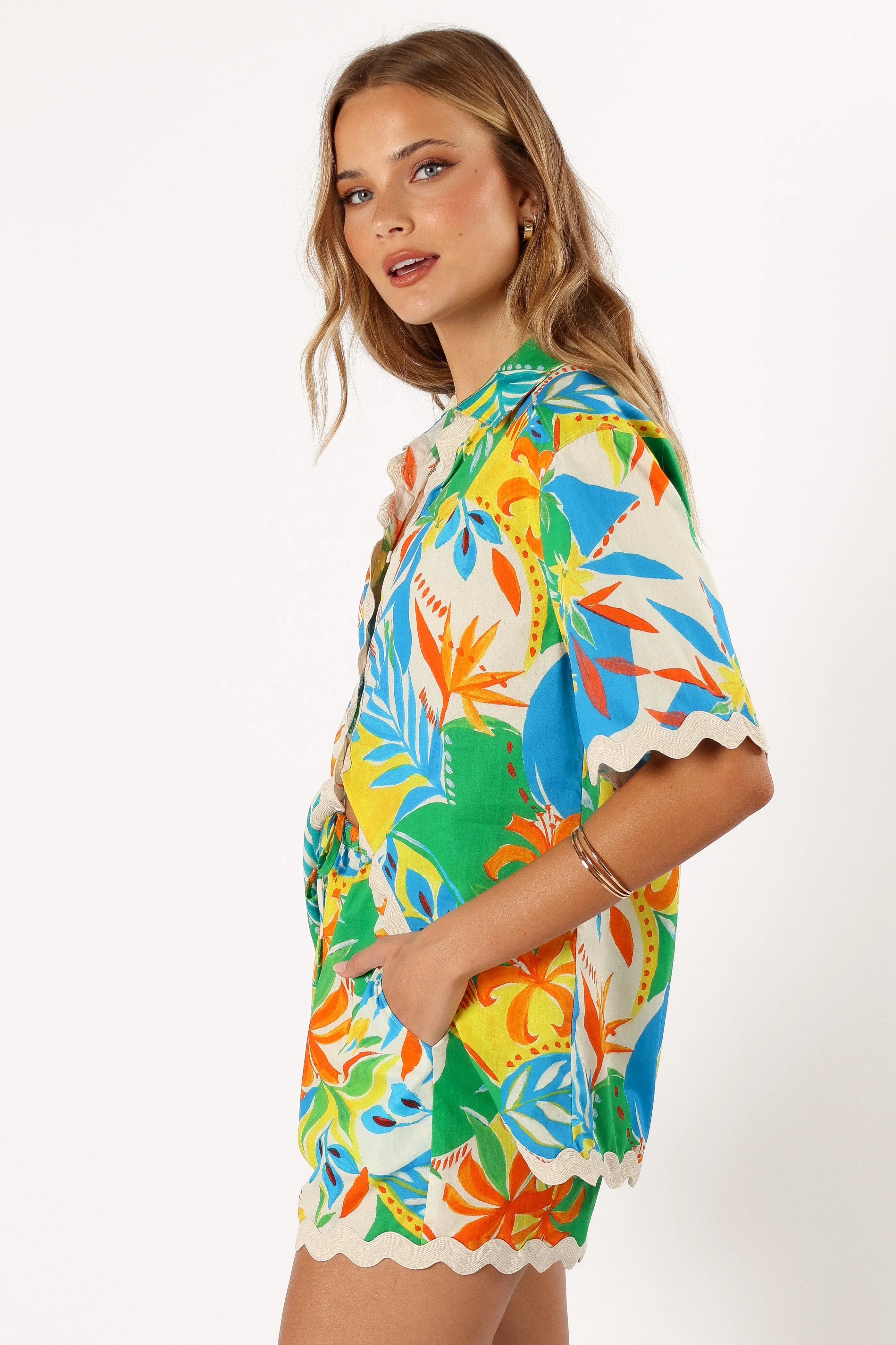 DETAILS Embrace the chic vibe of the tropics with our Harriet Button Down Top in Malta Print. This trendy top sports a sprightly spread collar and fun, functional button-down front. The short sleeves and hemline are adorned with playful rick rack trim, giving a nod to vintage fashion while keeping it totally now.