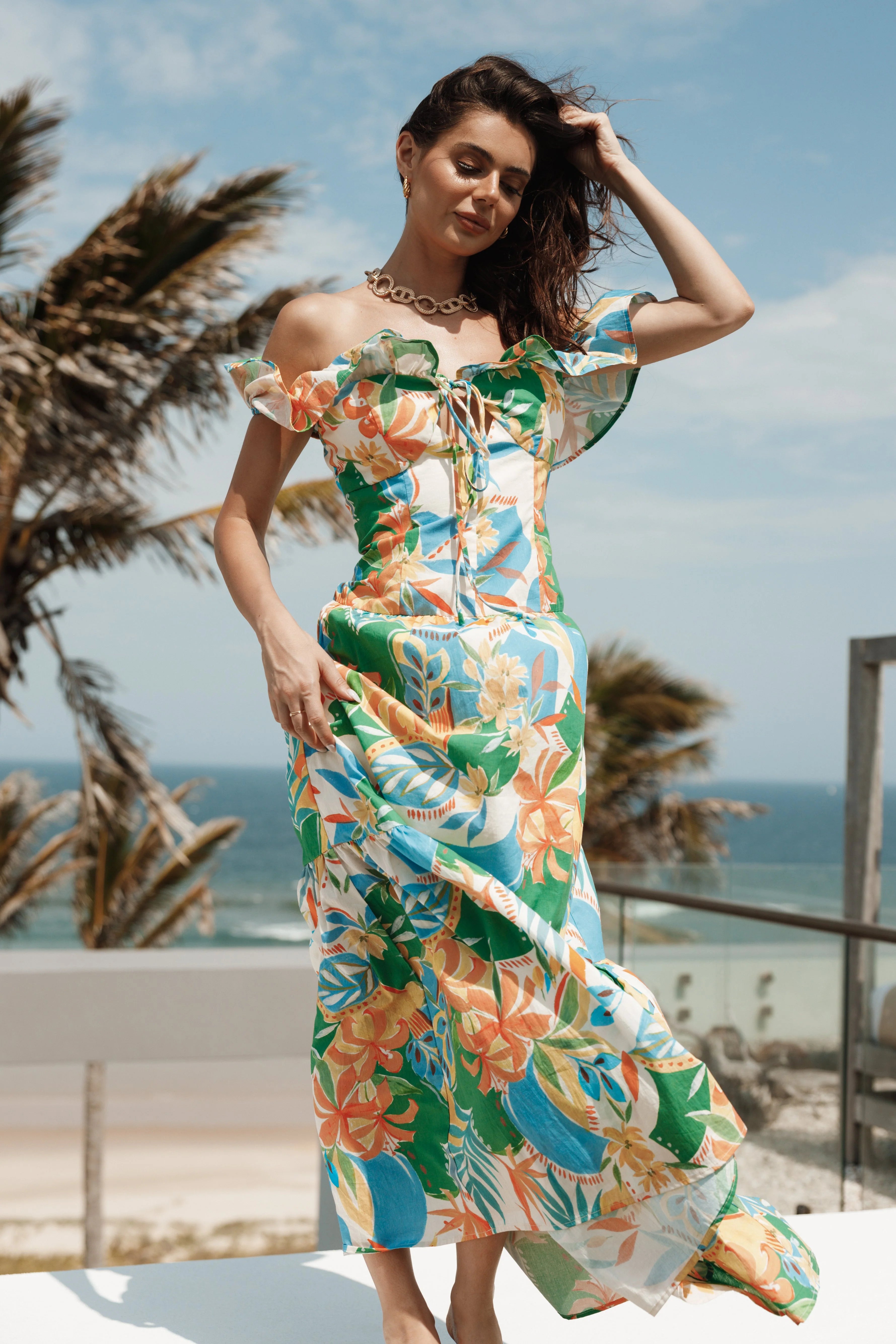 DETAILS Picture yourself strolling down the sun-drenched streets of your favorite beach town, turning heads in our Harriet Off Shoulder Maxi Dress in a vibrant Malta print. With its playful halter neck tie close and trendy straight neckline, this dress is the perfect mix of whimsical and fashion-forward.