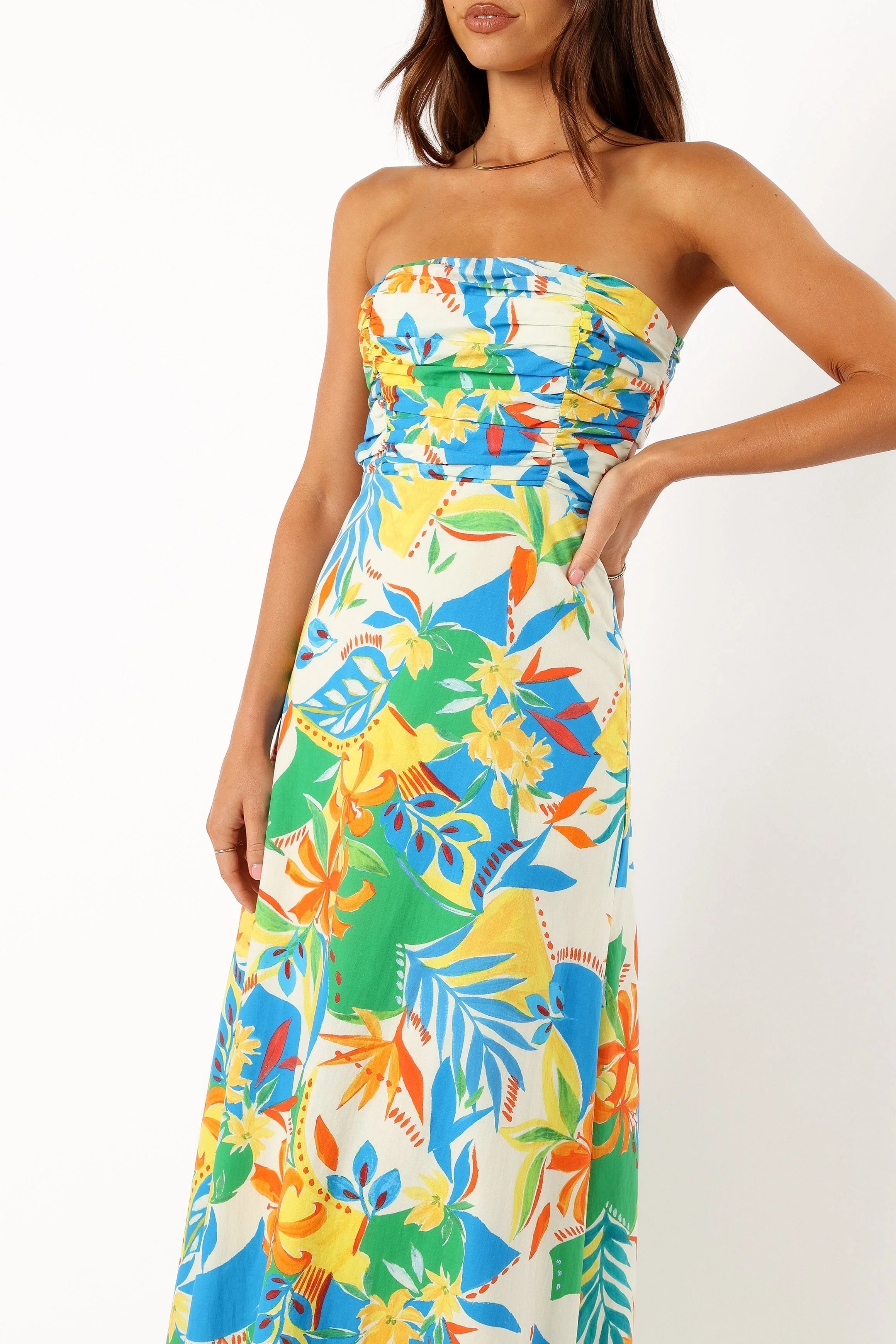 DETAILS Dare to bare this season with our Harriet Strapless Midi Dress in the vivacious Malta Print. The straight neckline and gathered bust detail set the stage for a playful yet refined look. Turn around to reveal the fun back cut out detail, sealed with chic zip closures and classic hook and eyes.