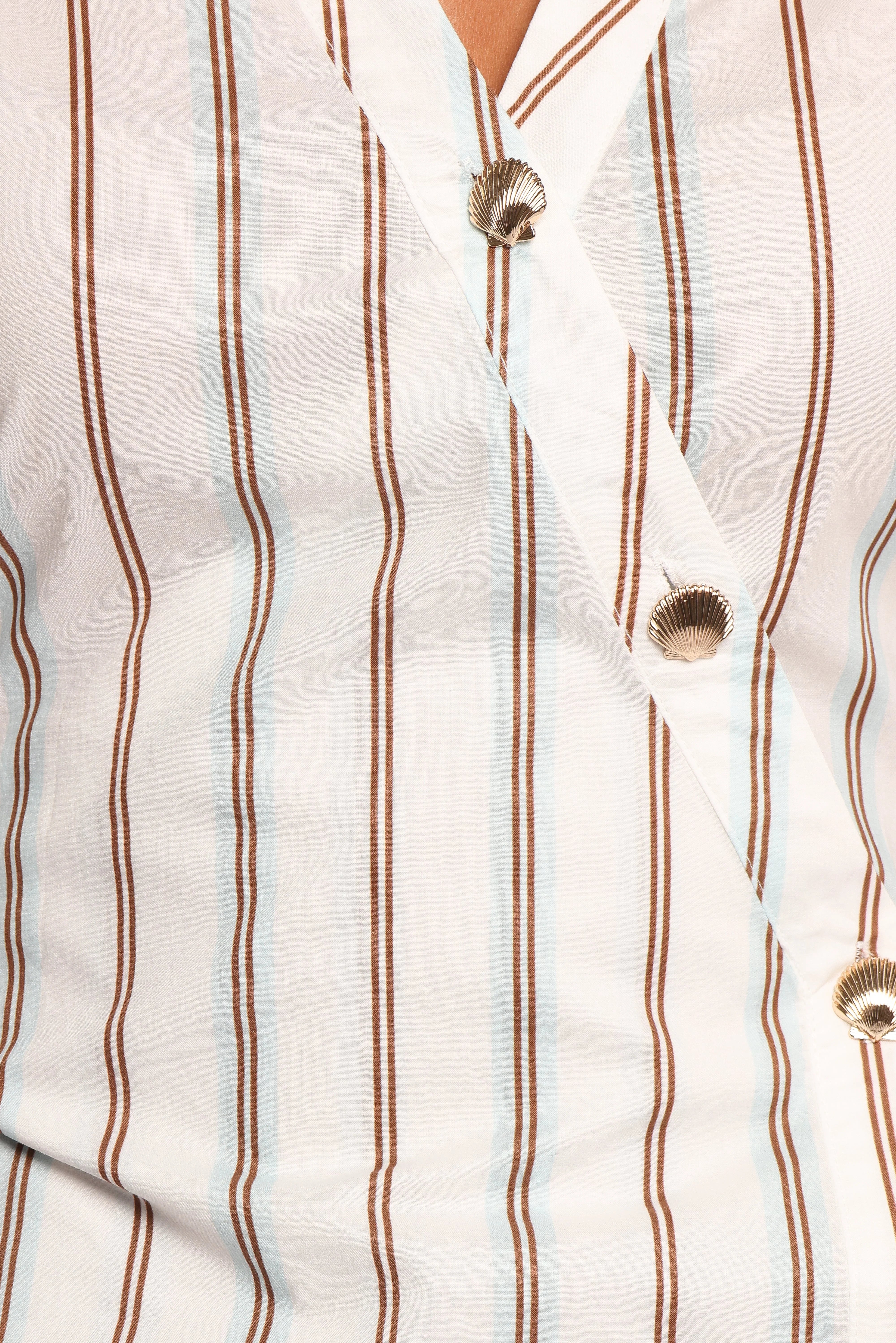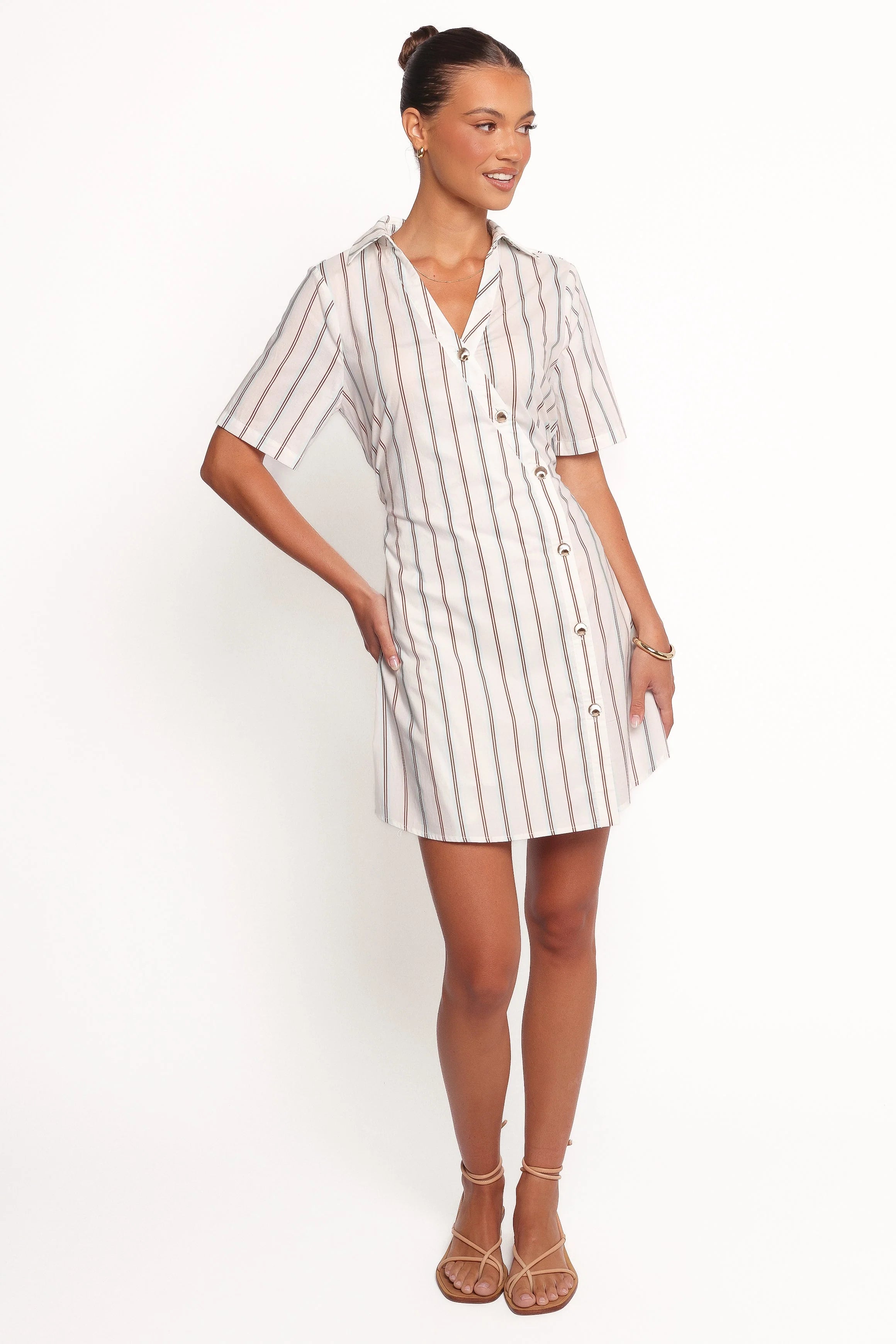 DETAILS Effortlessly chic and packed with detail, the Hayes Mini Dress in Blue Stripe will become your go-to for easy styling. Featuring a timeless pinstripe design, a collared neckline, and shell button details, it transitions perfectly from day to night. The back tie adds a customizable fit, while the v-neckline gives just the right touch of modern elegance.