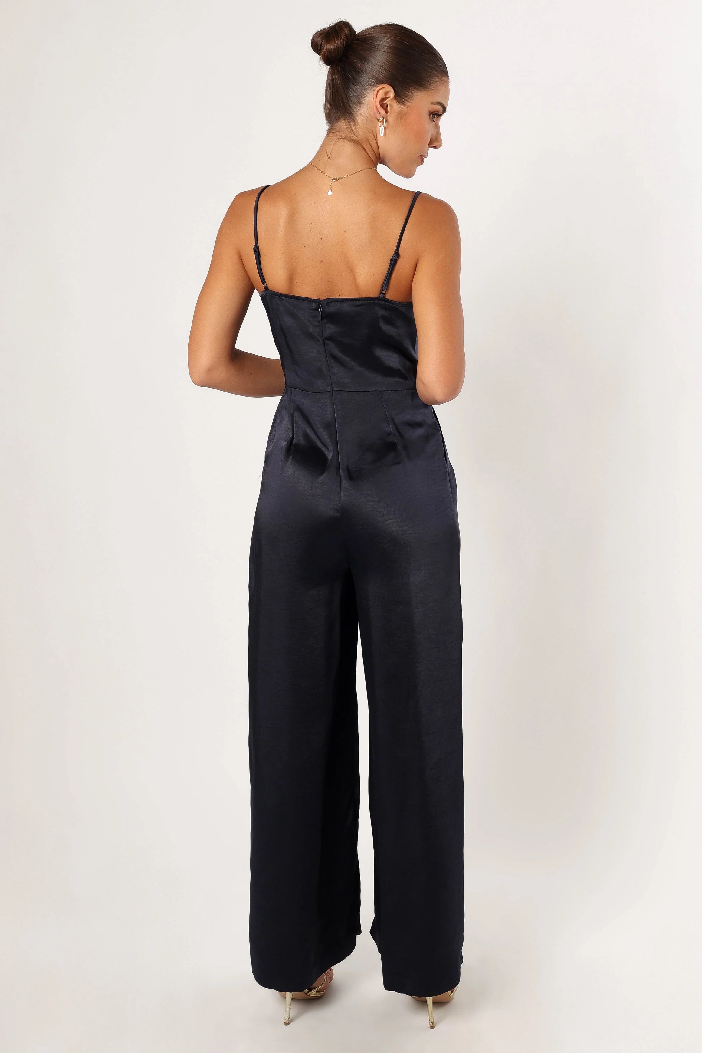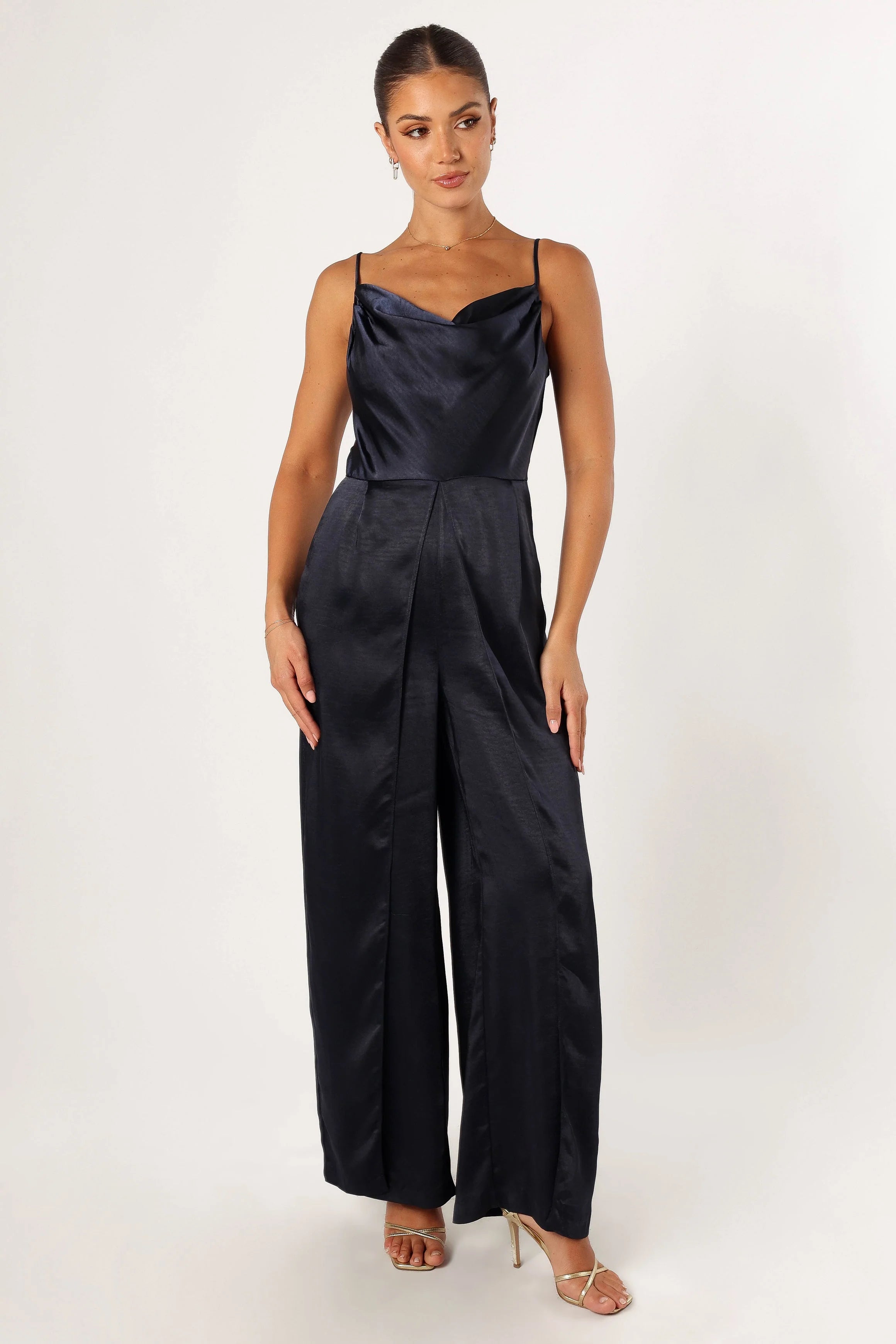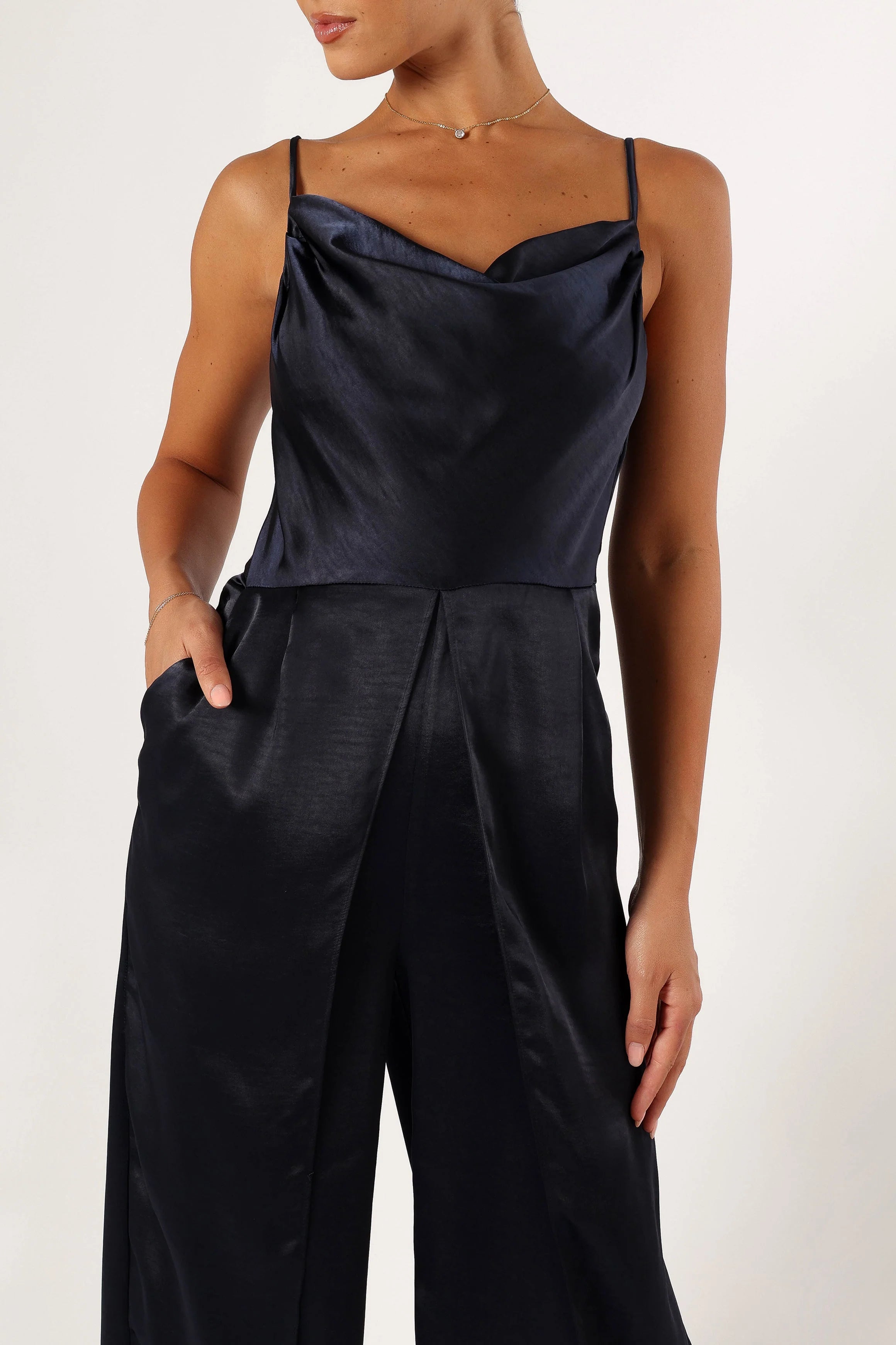 DETAILS This eye-catching ensemble features a flattering cowl neckline, complemented by thin adjustable straps for the perfect fit. The invisible back zip with a hook and eye clasp ensures easy wear, while the functional side pockets add a practical touch. The jumpsuit's unique faux front overlay and side splits detail offer an element of drama to the wide leg style pant.